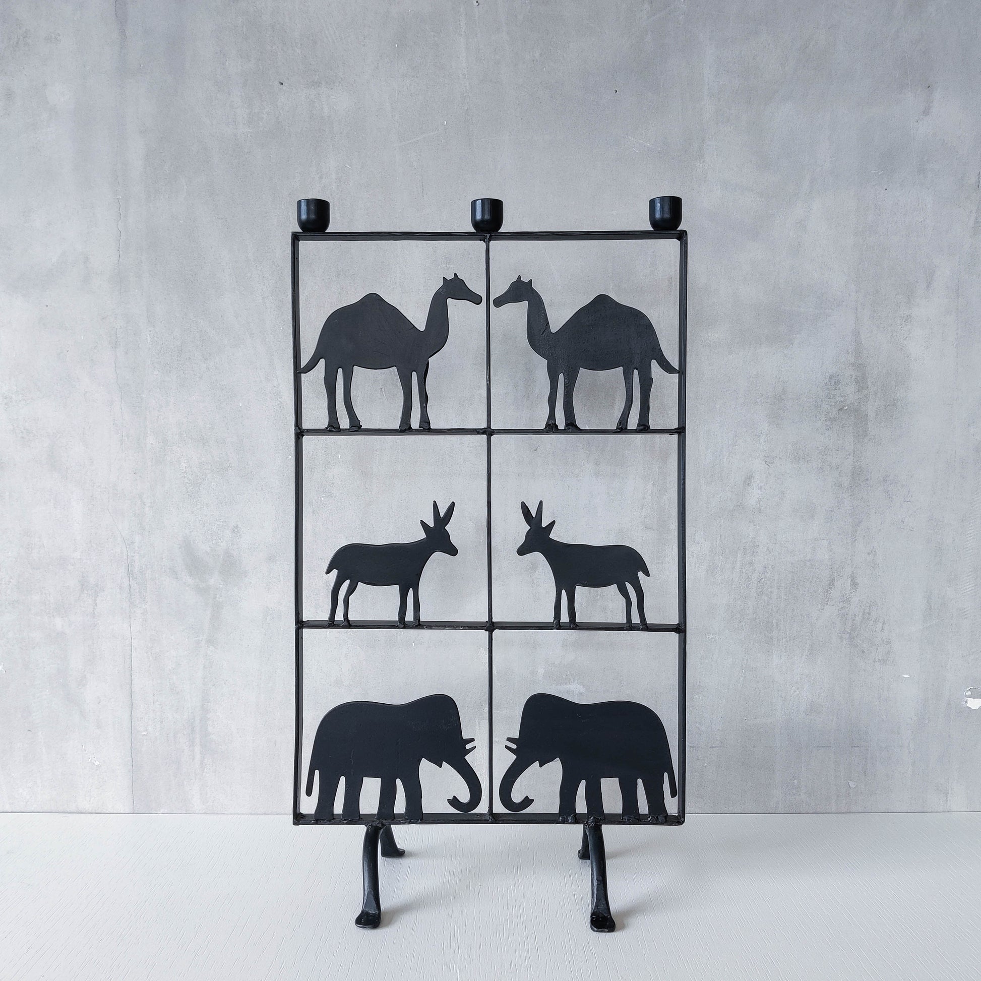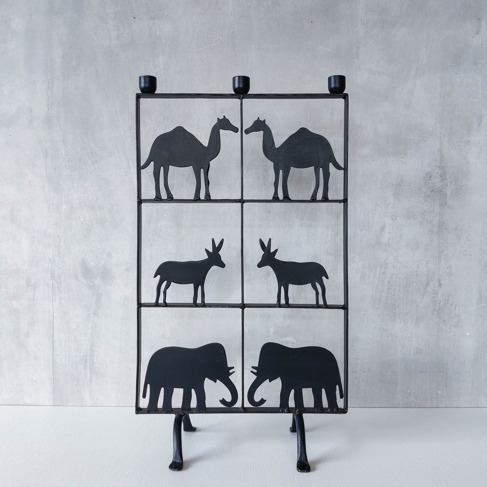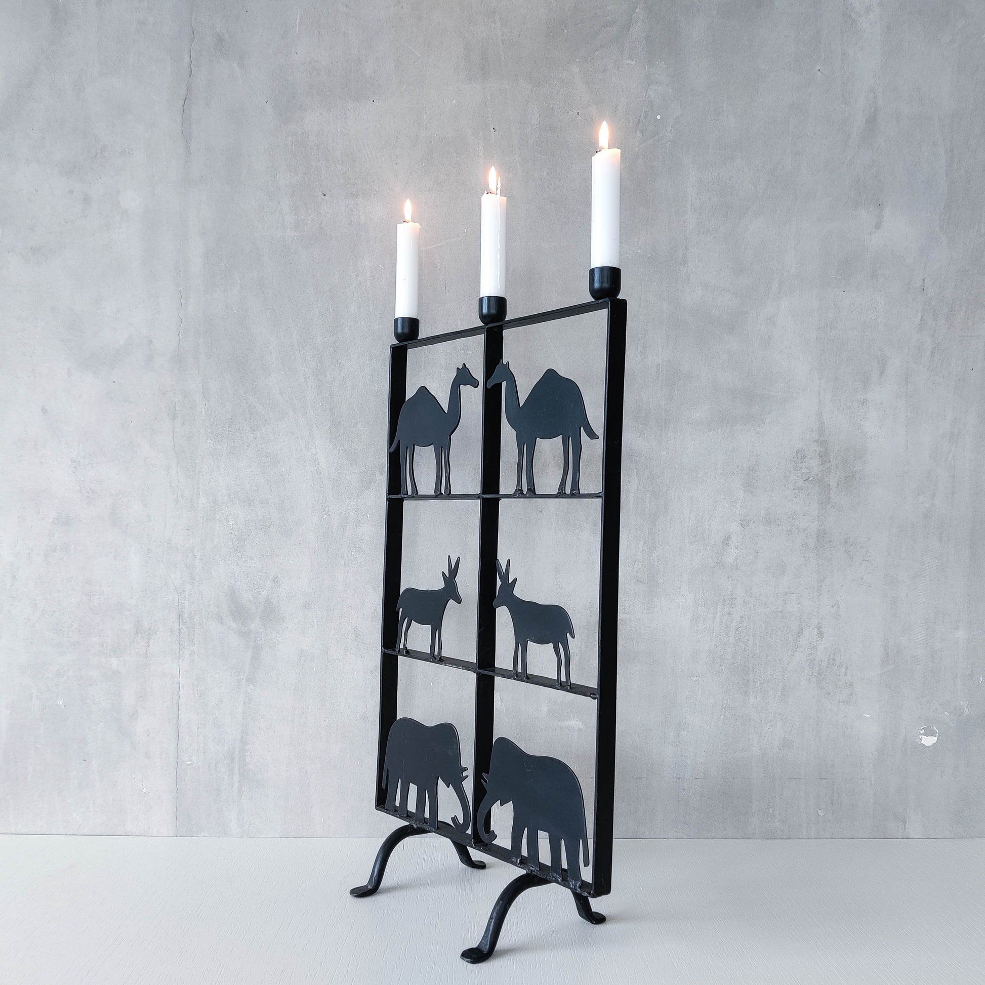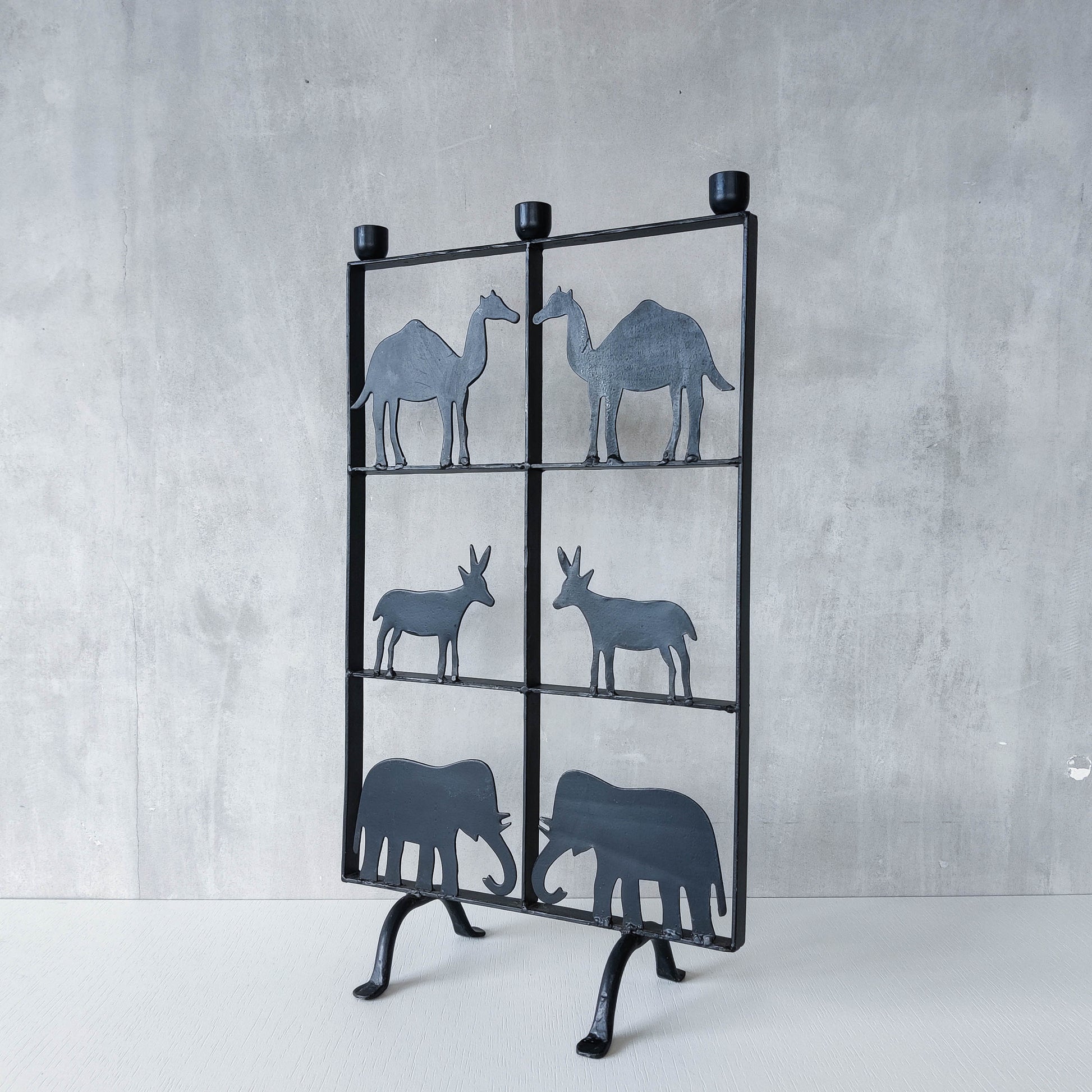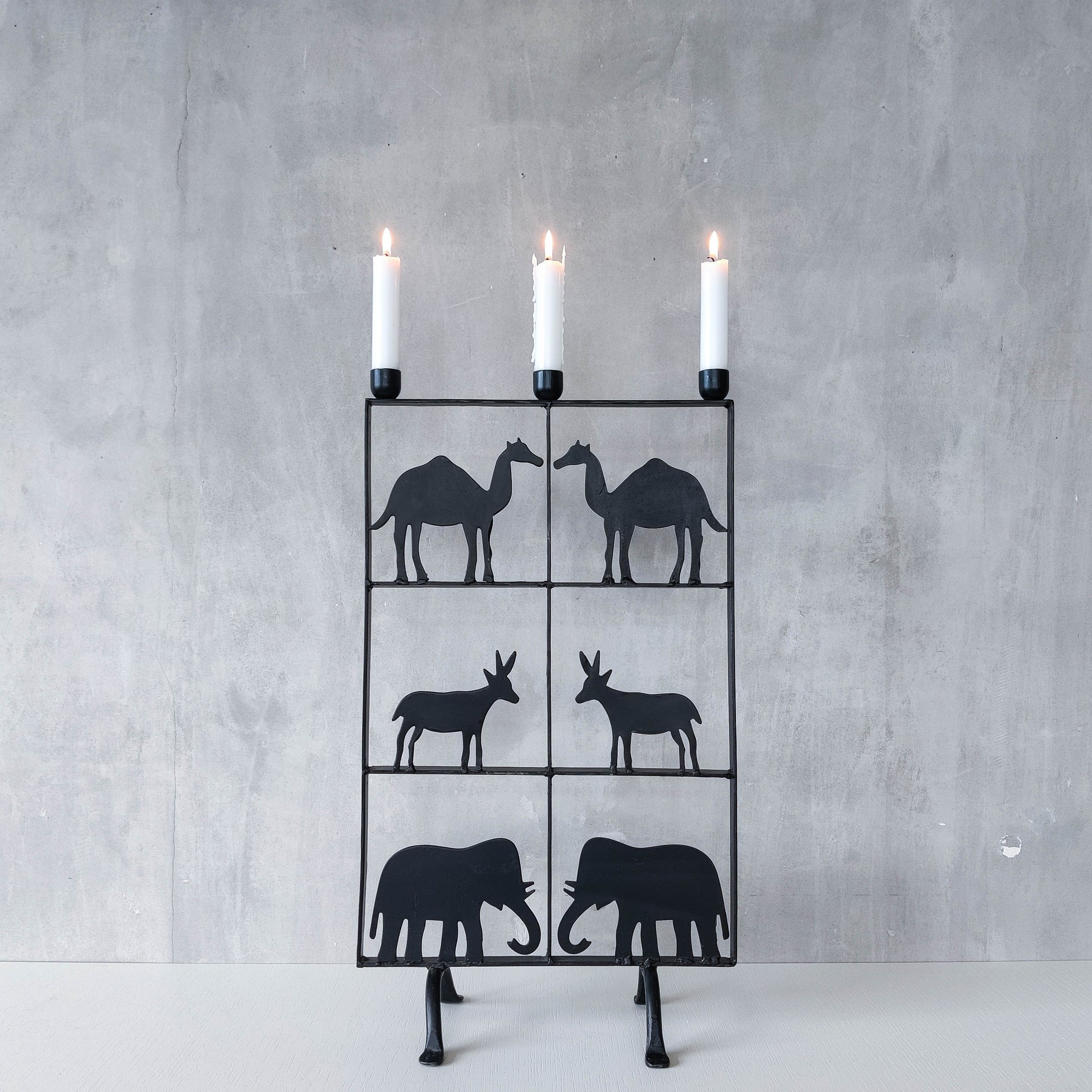 Sculptural fire screen (or table centrepiece) with candle holder top and wrought iron feet in the manner of mid century French artisans Atelier Marolles. Graphic grid form in forged steel with welded cut out animal motifs. Black finish. Heavy, just over 2kg. Space for 3 x dinner candles (sorry not included). Please see photos and condition description.