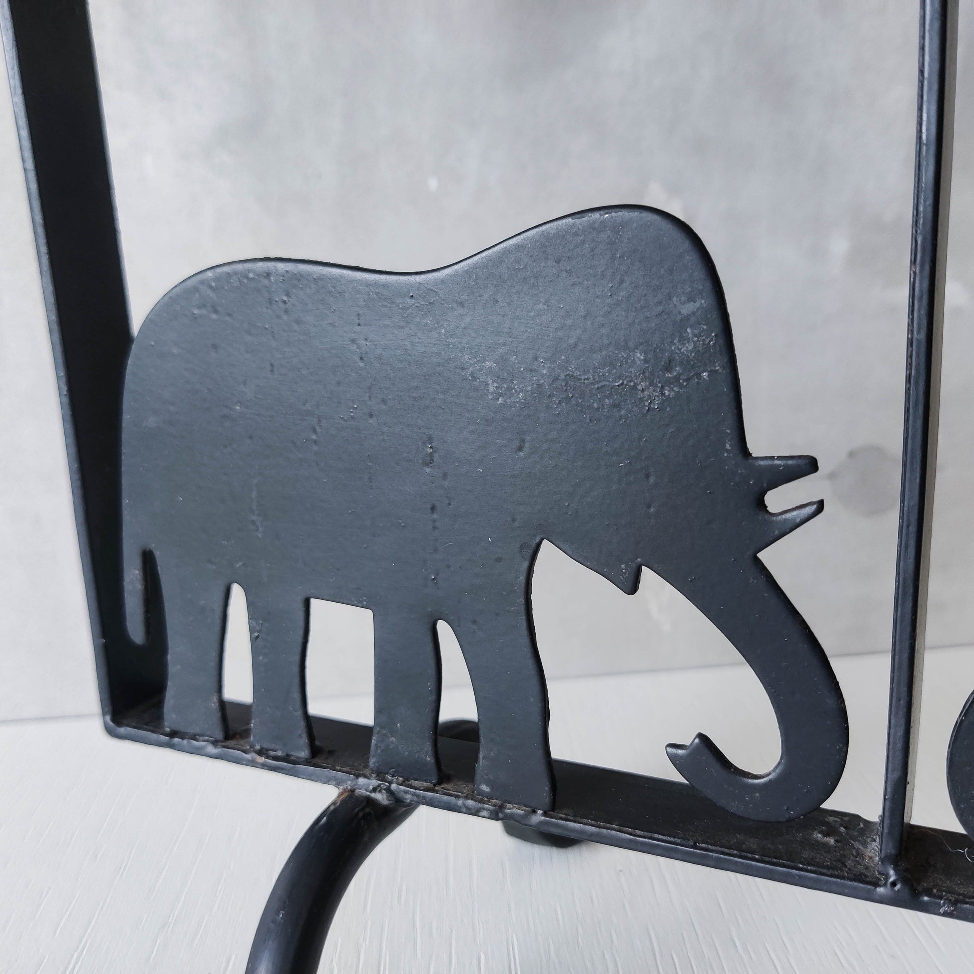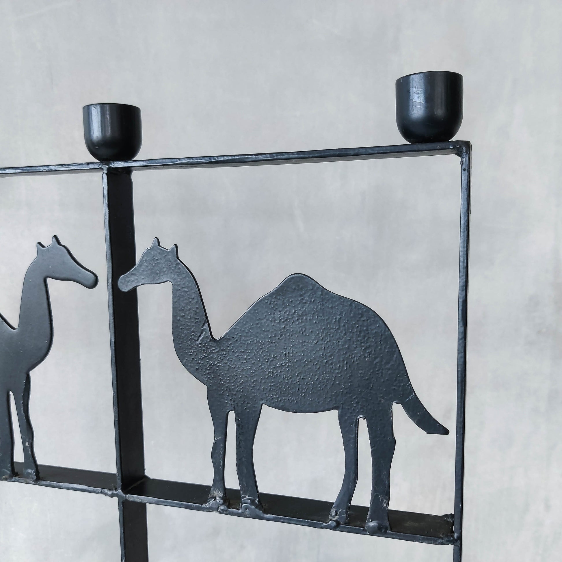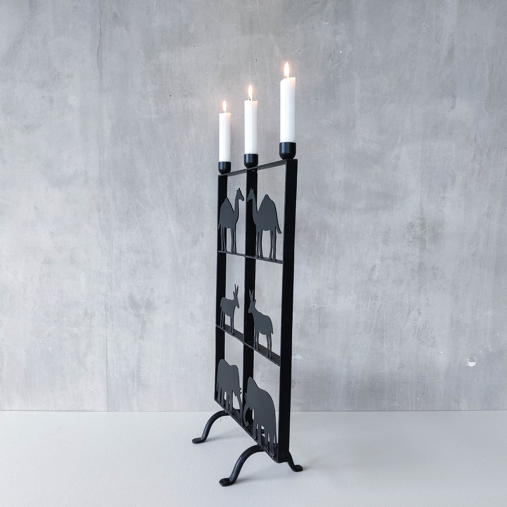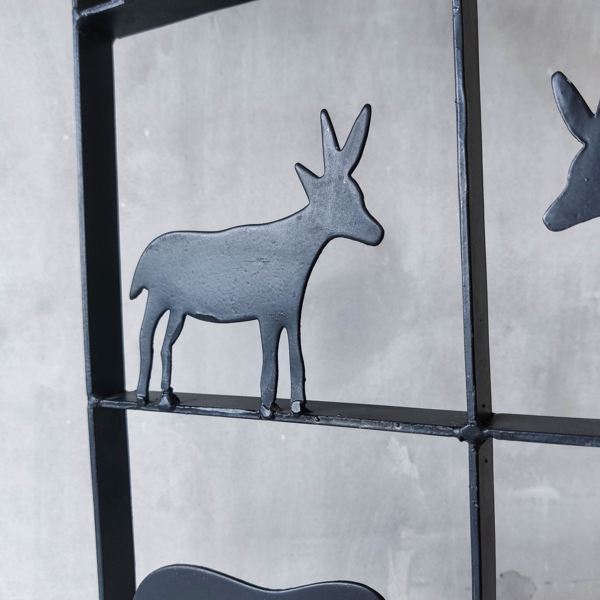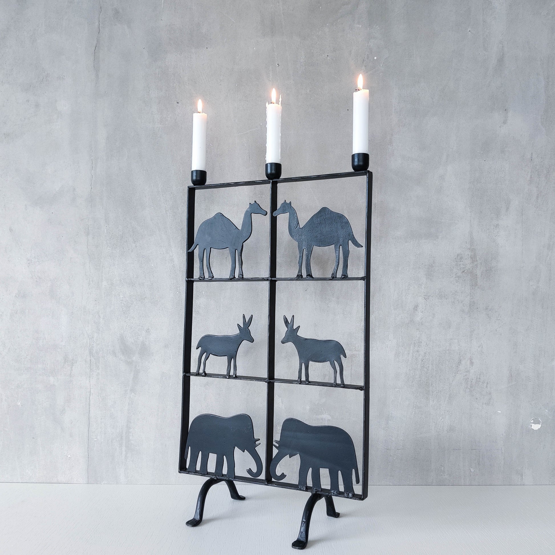 Sculptural fire screen (or table centrepiece) with candle holder top and wrought iron feet in the manner of mid century French artisans Atelier Marolles. Graphic grid form in forged steel with welded cut out animal motifs. Black finish. Heavy, just over 2kg. Space for 3 x dinner candles (sorry not included). Please see photos and condition description.