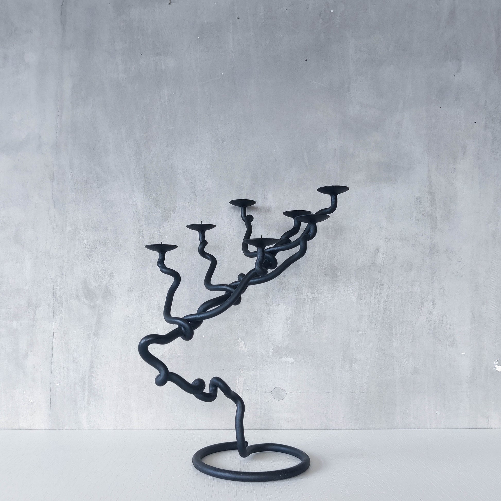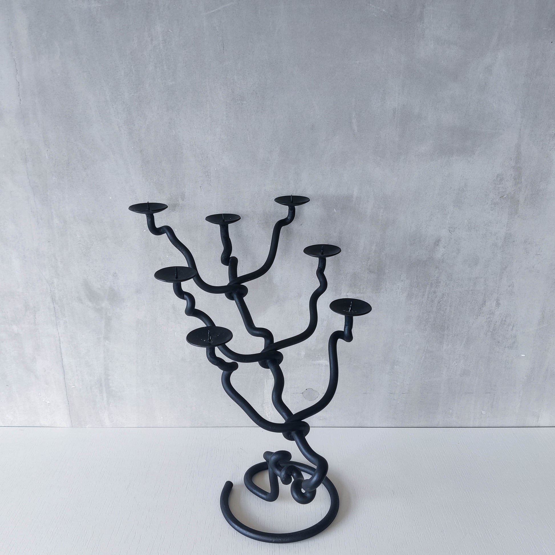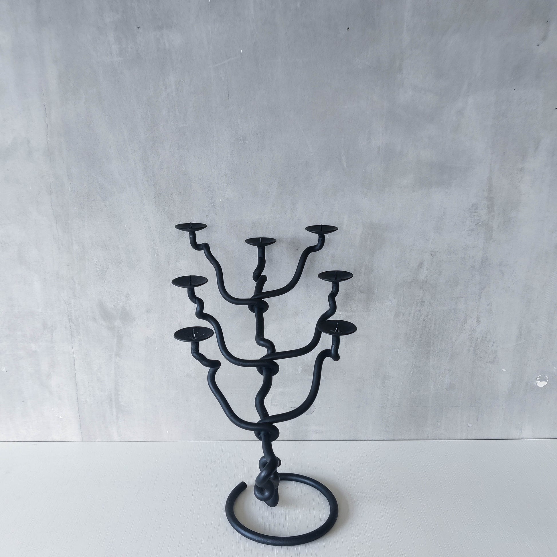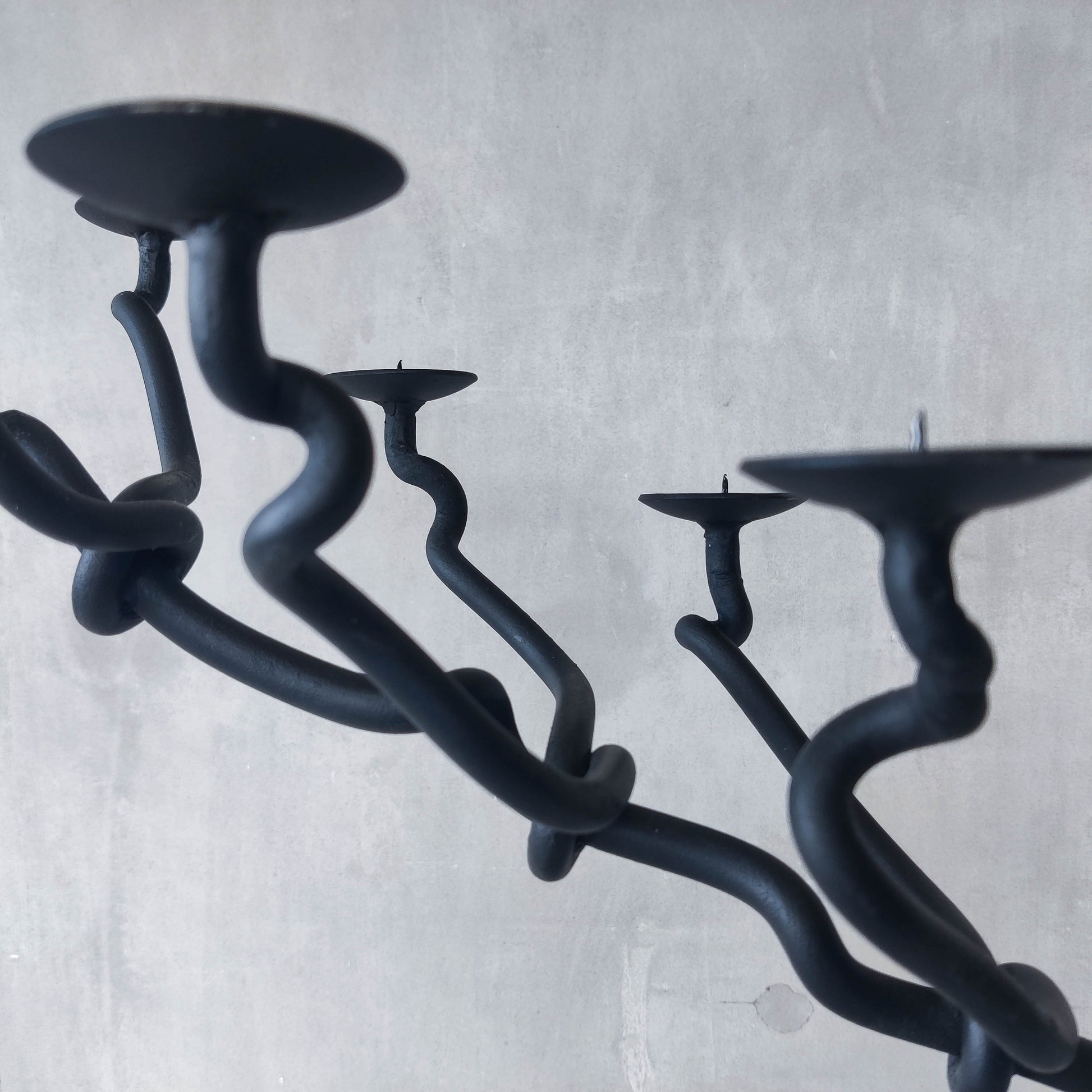 Large graphic sculptural black powder coated forged steel candelabra. Twisted organic branch form with pricket tops to hold 7 x candles (sorry candles not included). Age unknown. Please see photos and condition description.