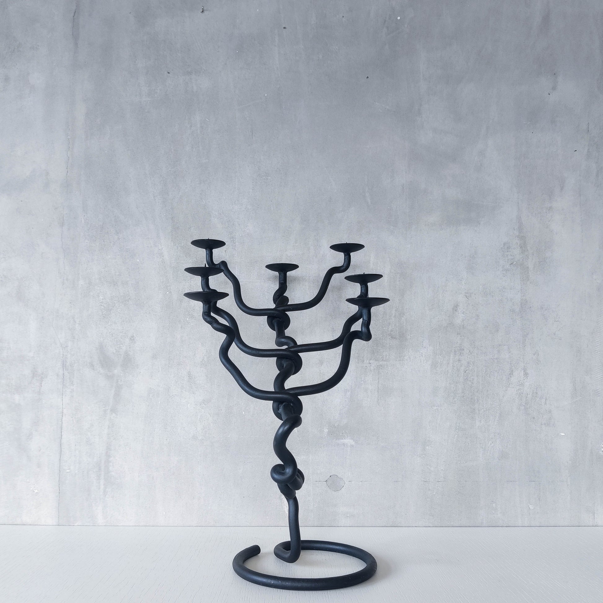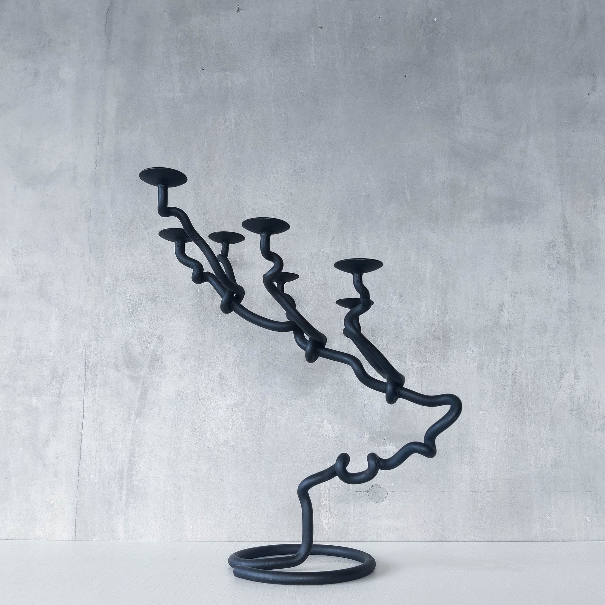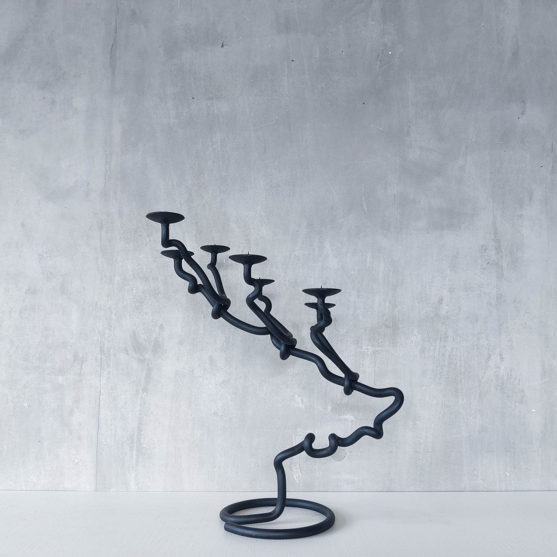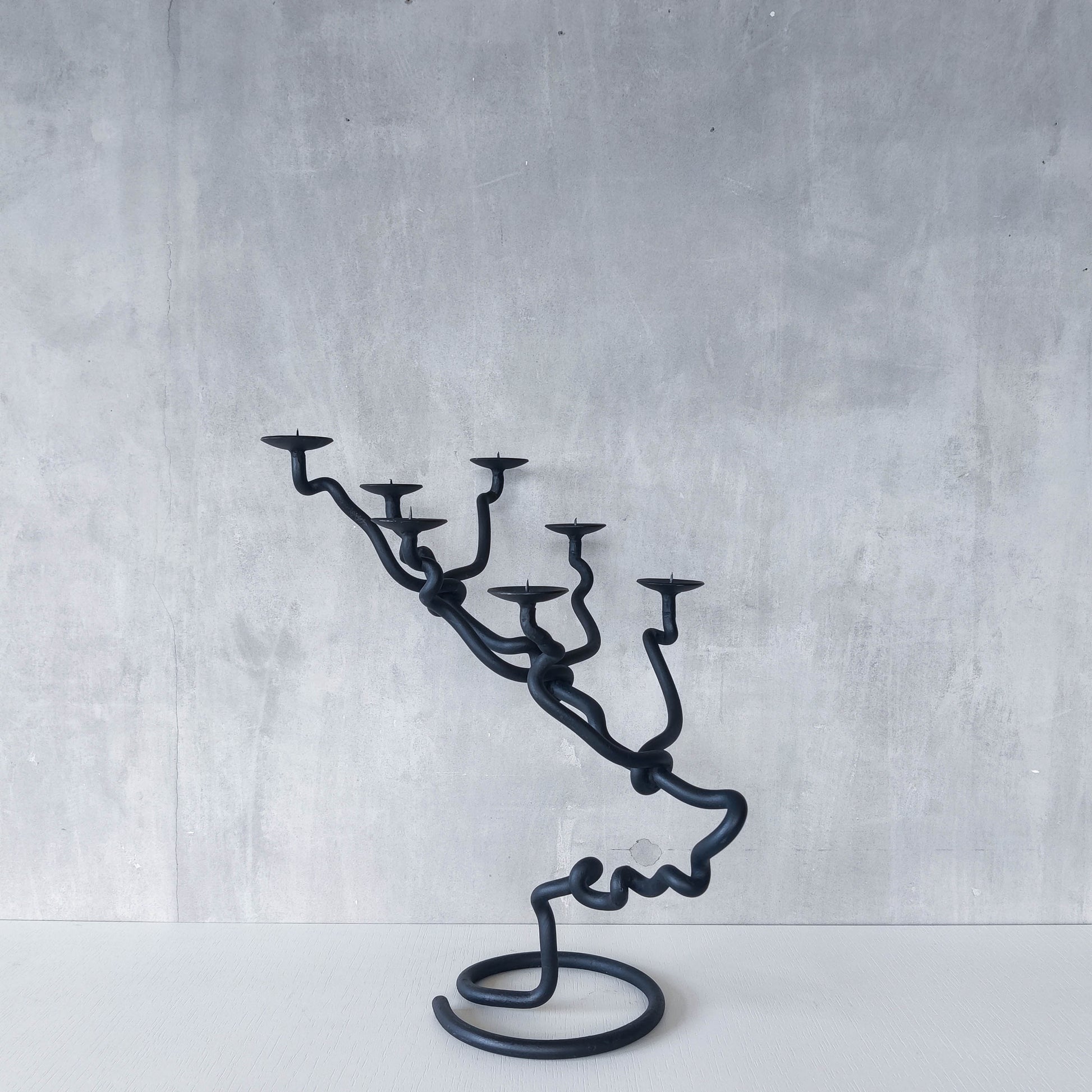 Large graphic sculptural black powder coated forged steel candelabra. Twisted organic branch form with pricket tops to hold 7 x candles (sorry candles not included). Age unknown. Please see photos and condition description.