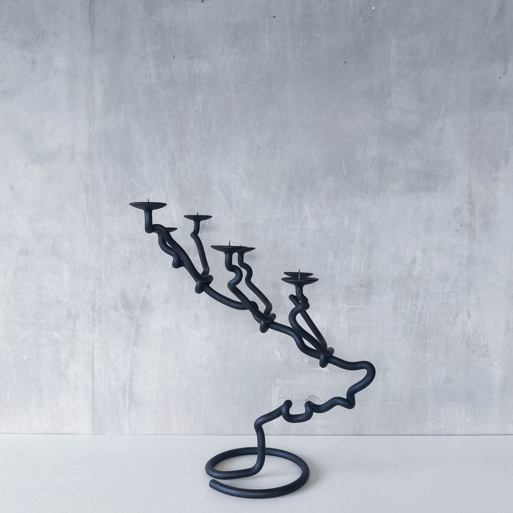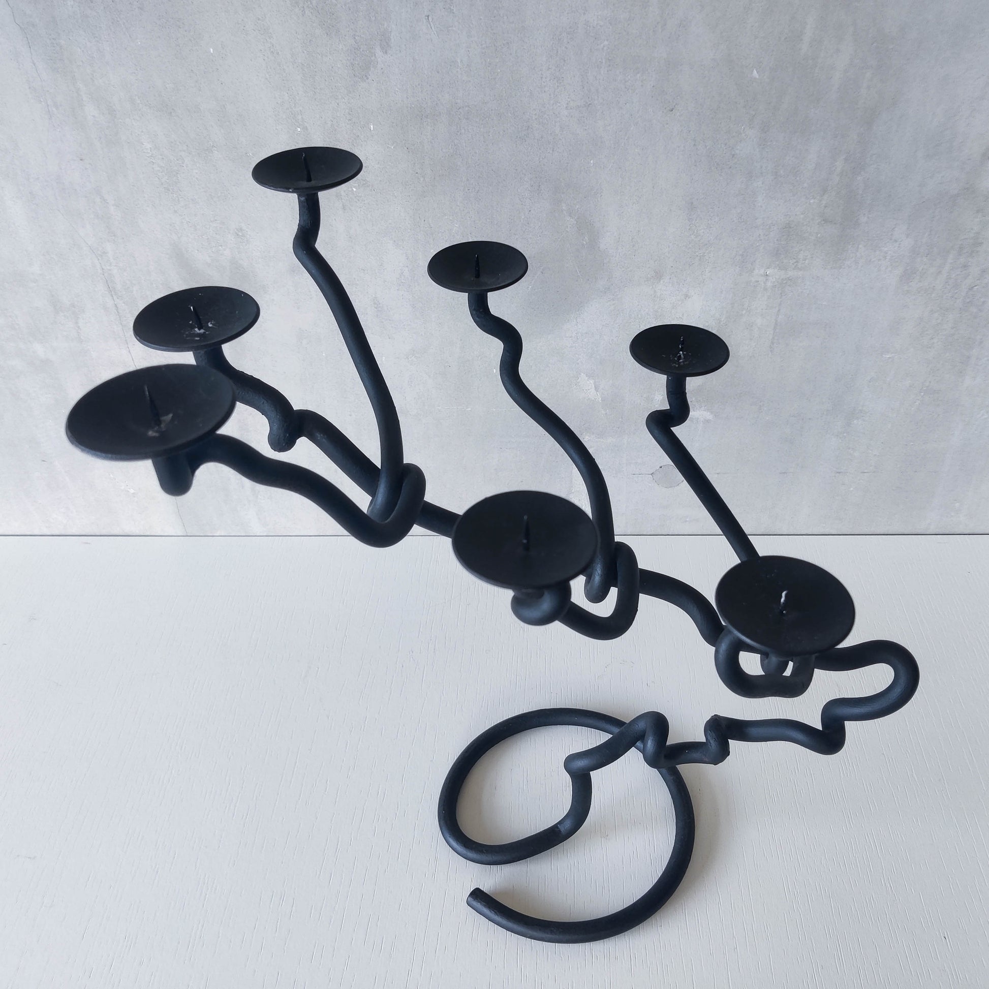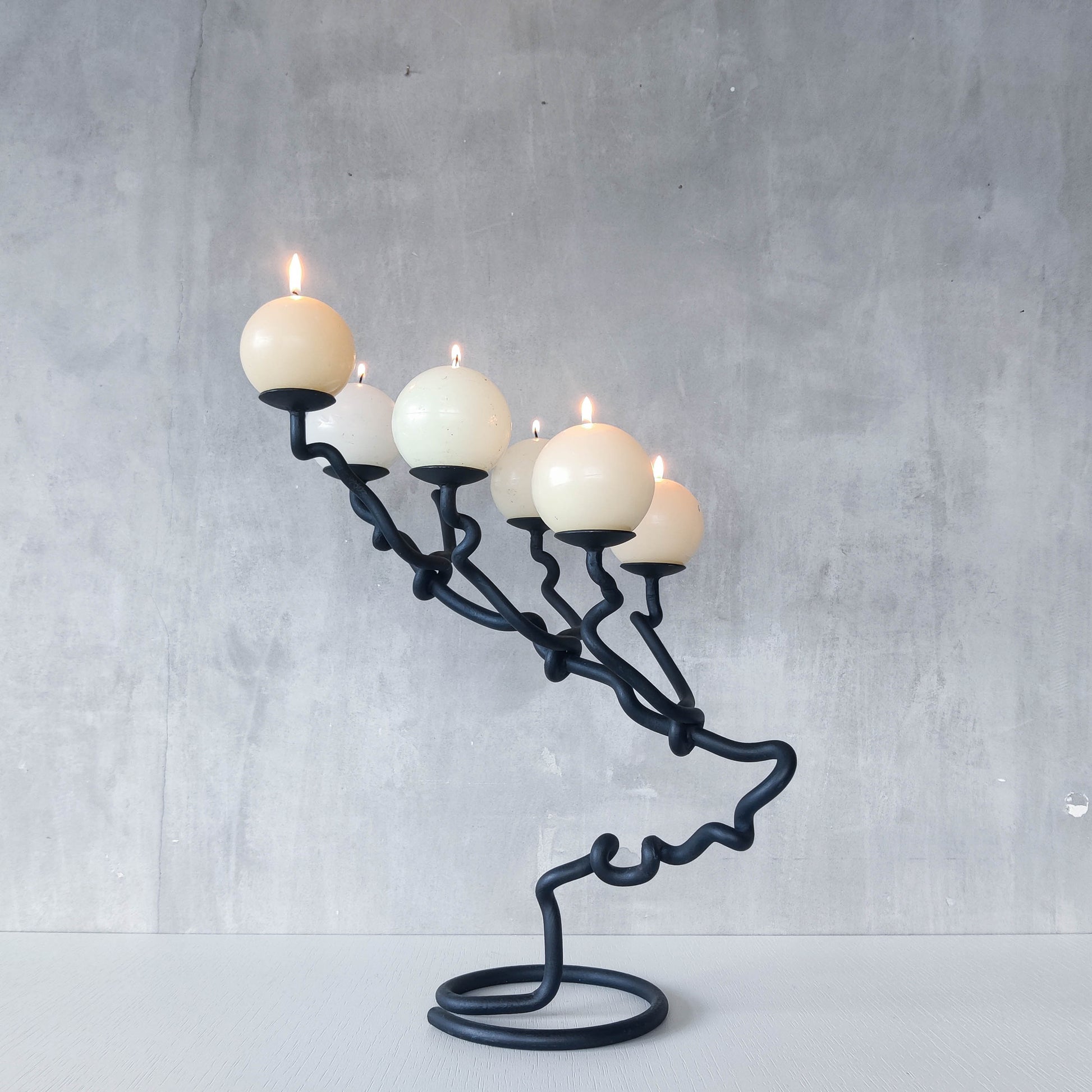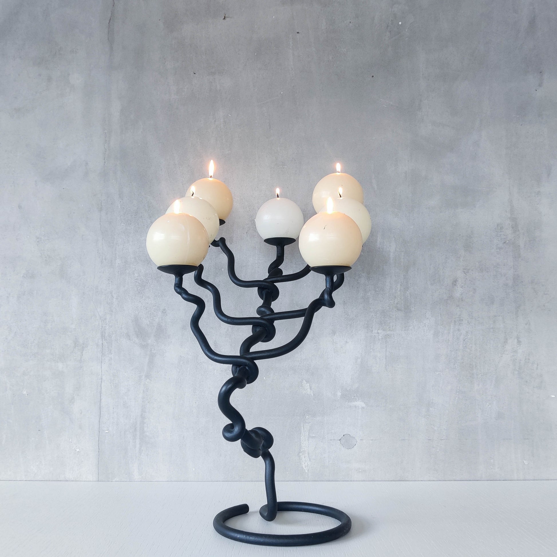 Large graphic sculptural black powder coated forged steel candelabra. Twisted organic branch form with pricket tops to hold 7 x candles (sorry candles not included). Age unknown. Please see photos and condition description.