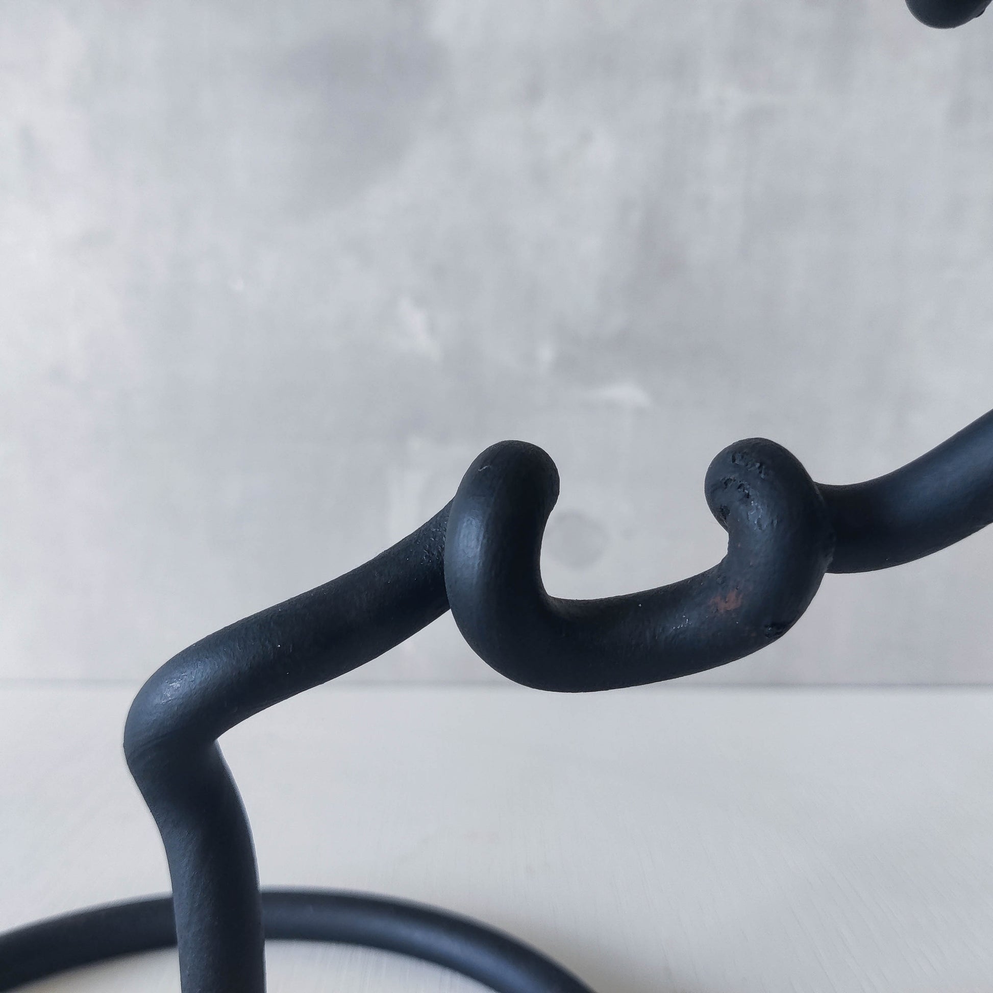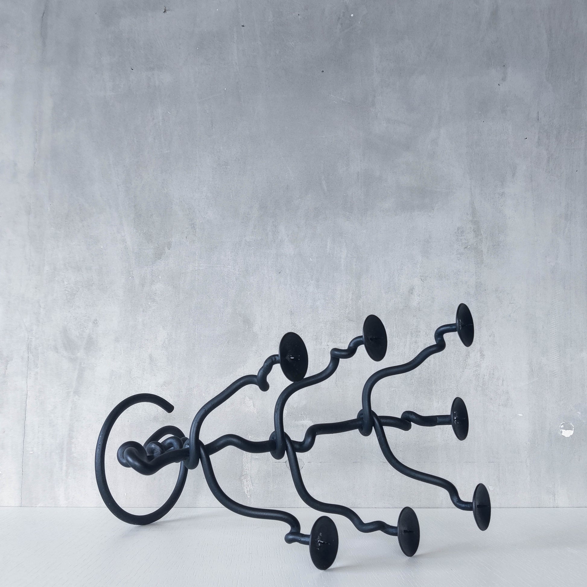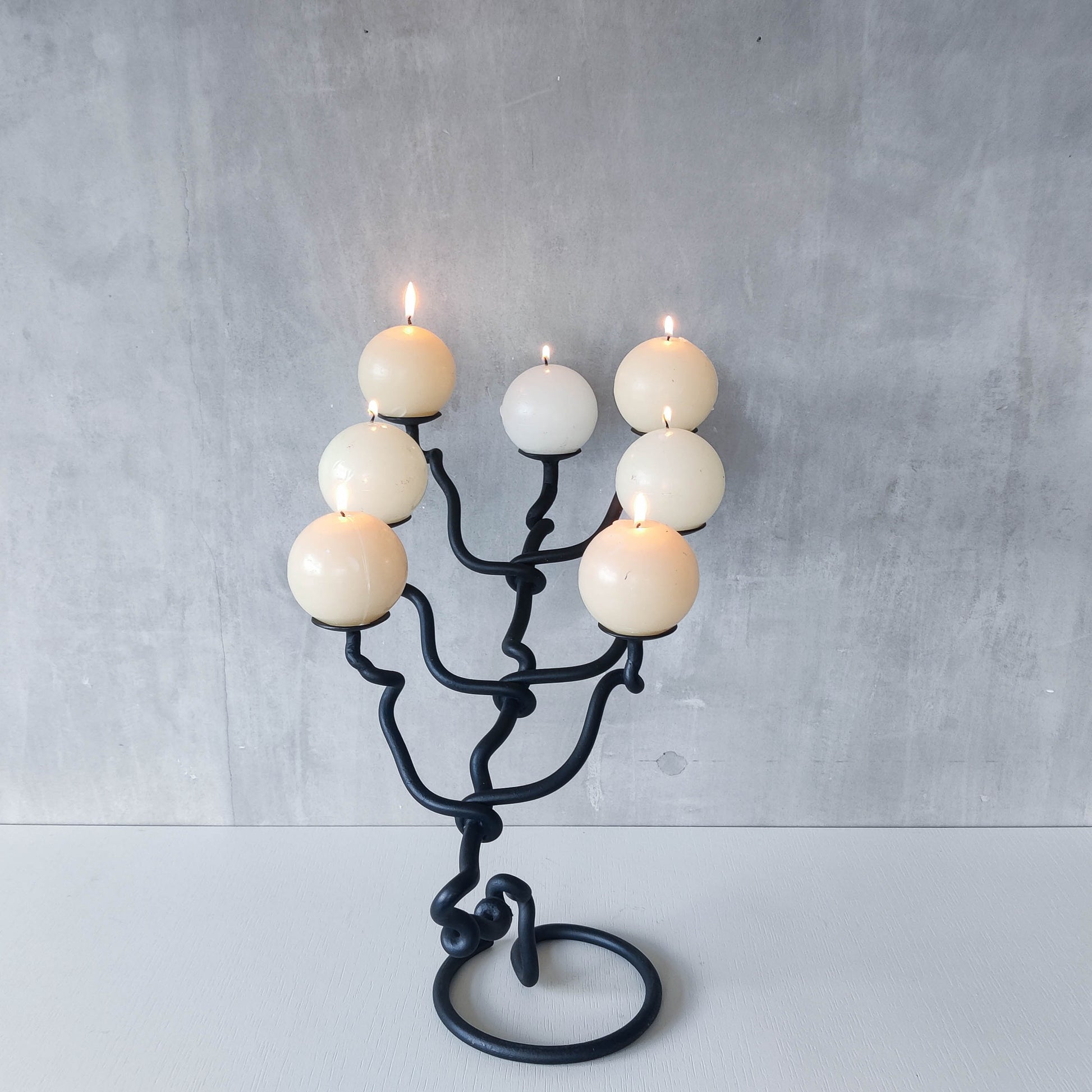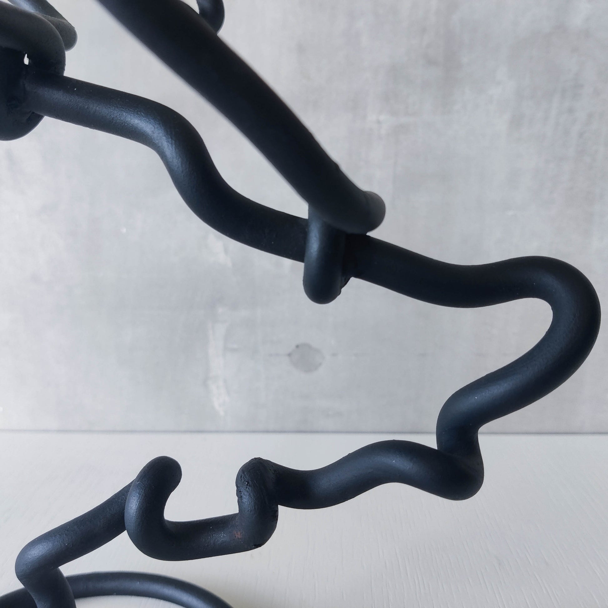 Large graphic sculptural black powder coated forged steel candelabra. Twisted organic branch form with pricket tops to hold 7 x candles (sorry candles not included). Age unknown. Please see photos and condition description.