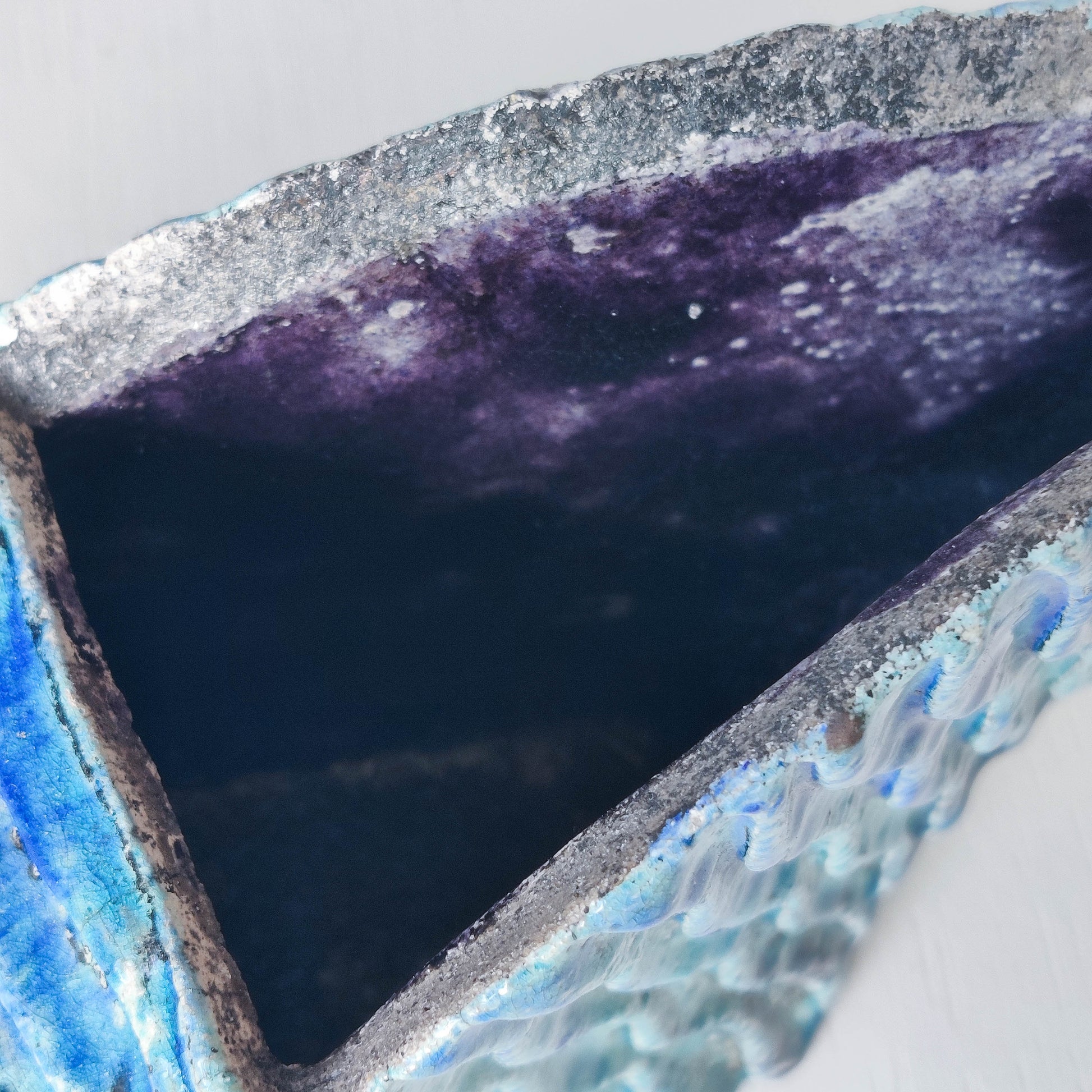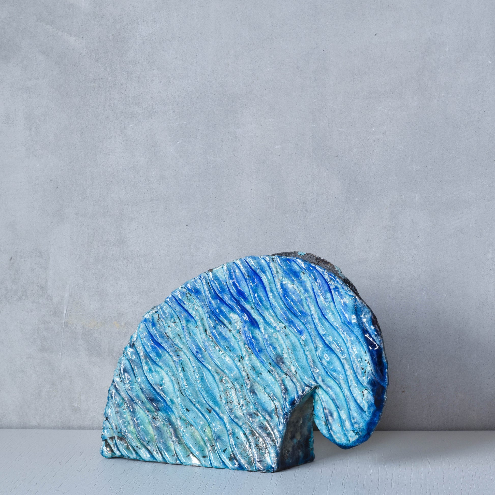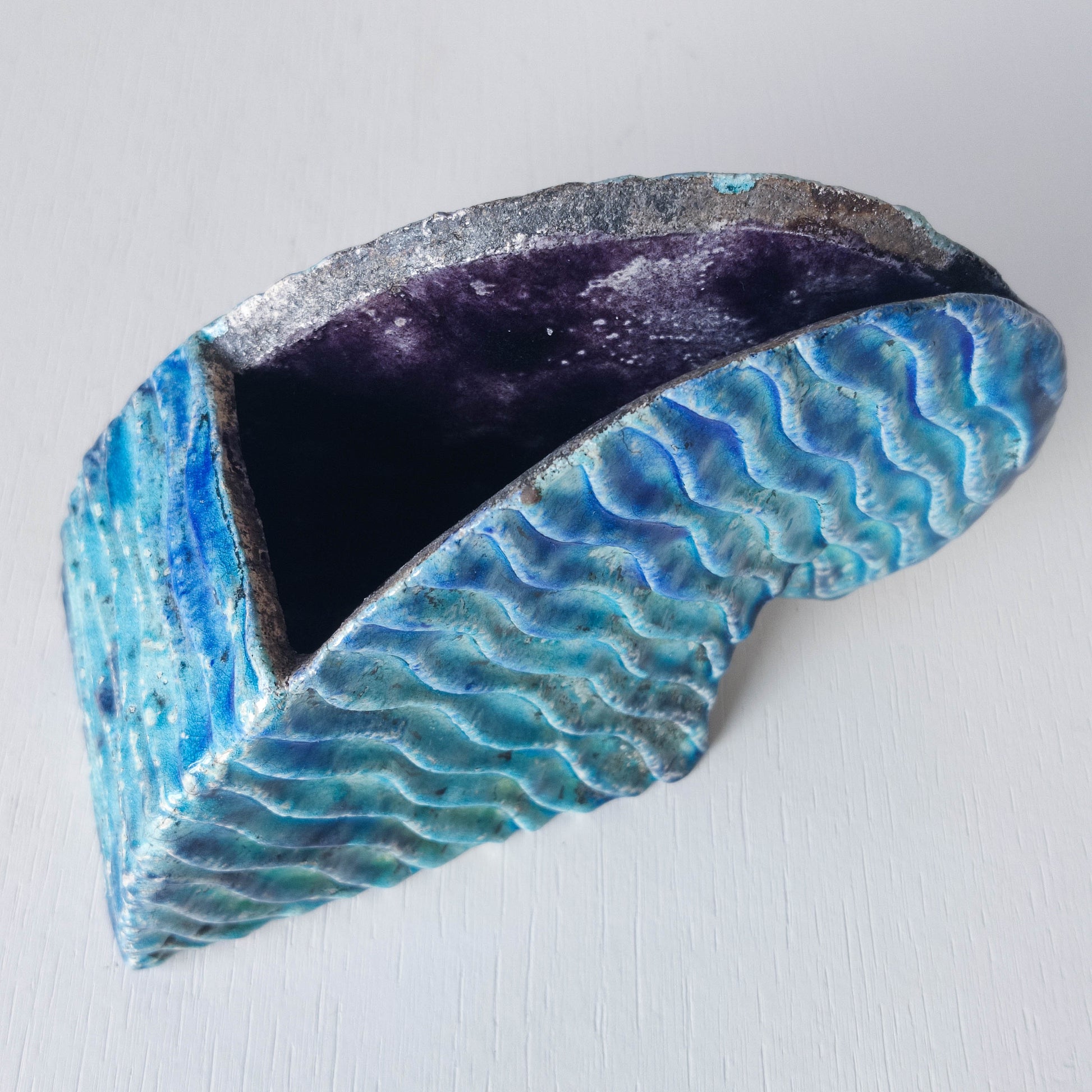 Slab built vintage artist made studio ceramic wave form vase vessel blue glazed
