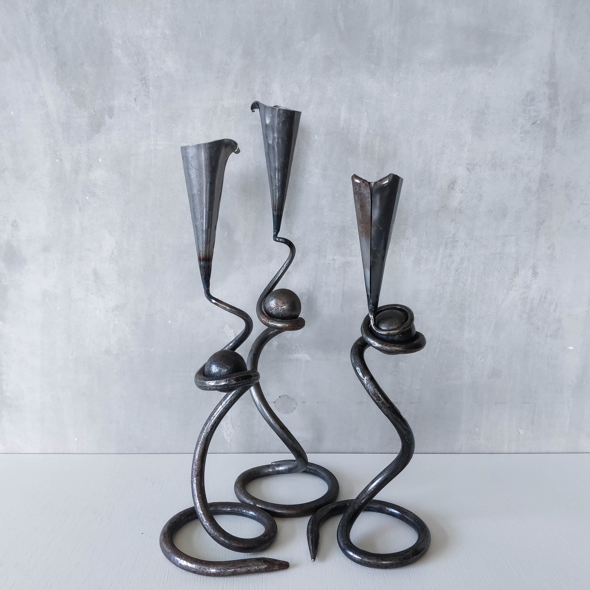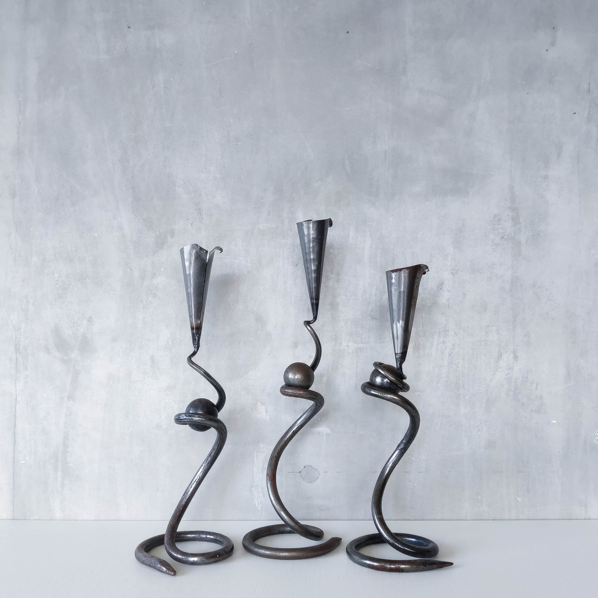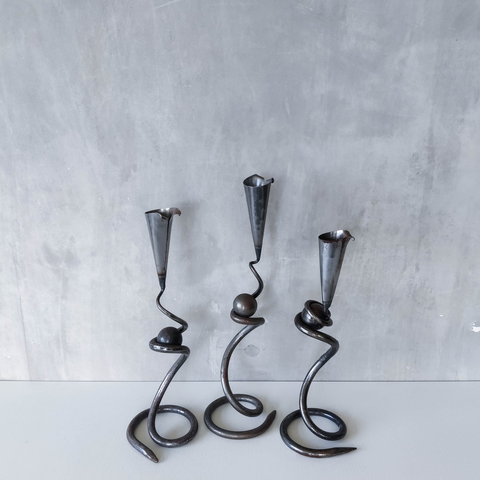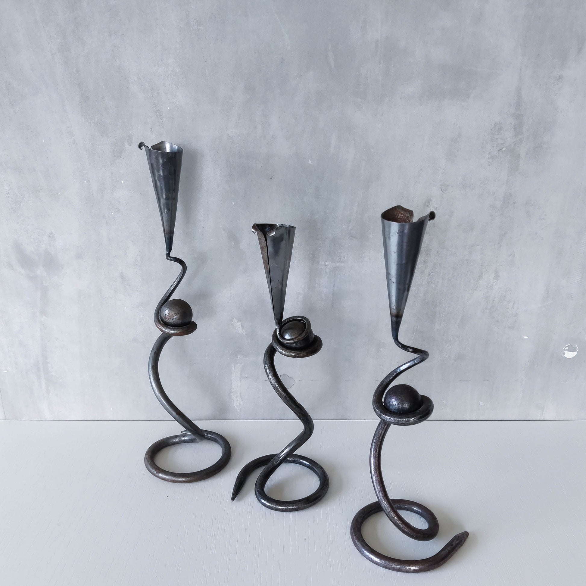 Trio of sculptural handmade wrought iron welded steel candle holders with steel balls