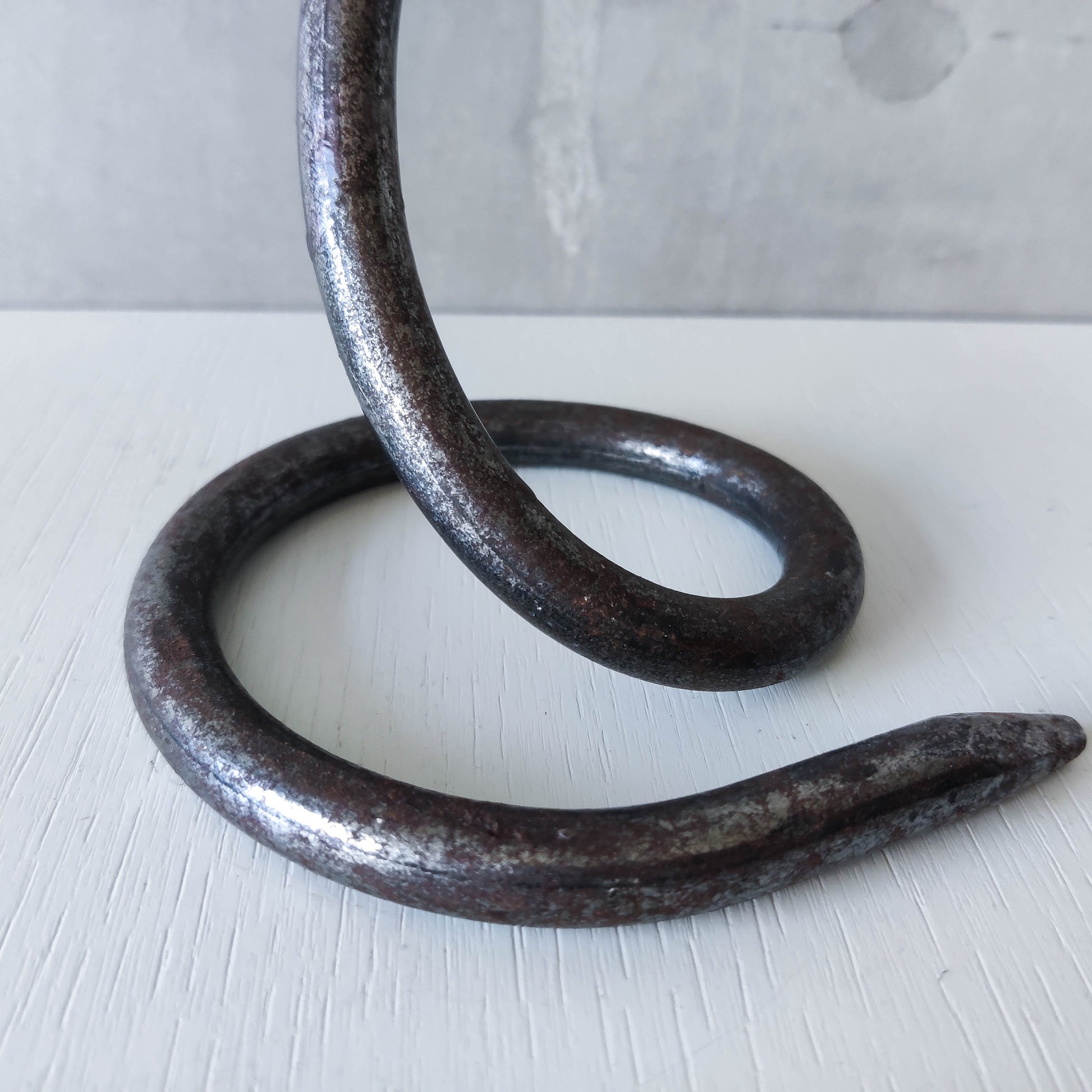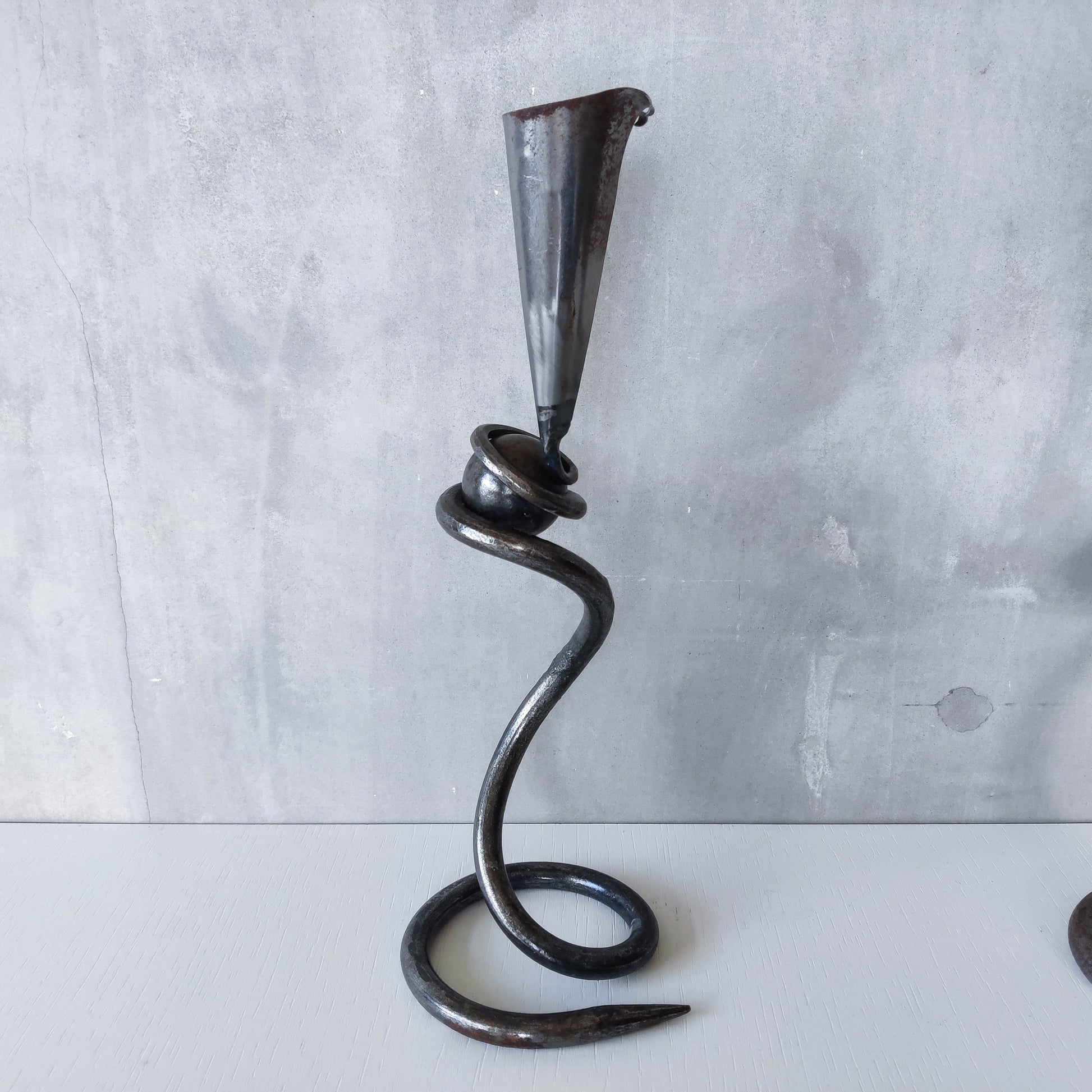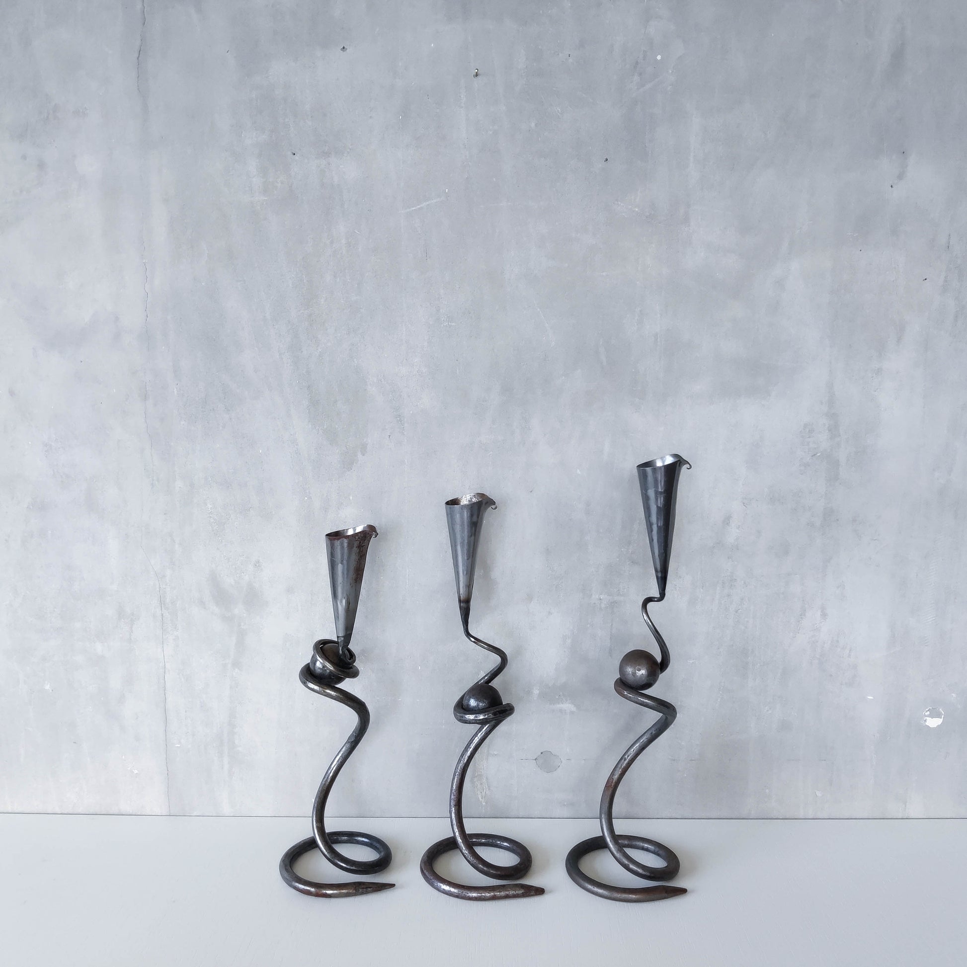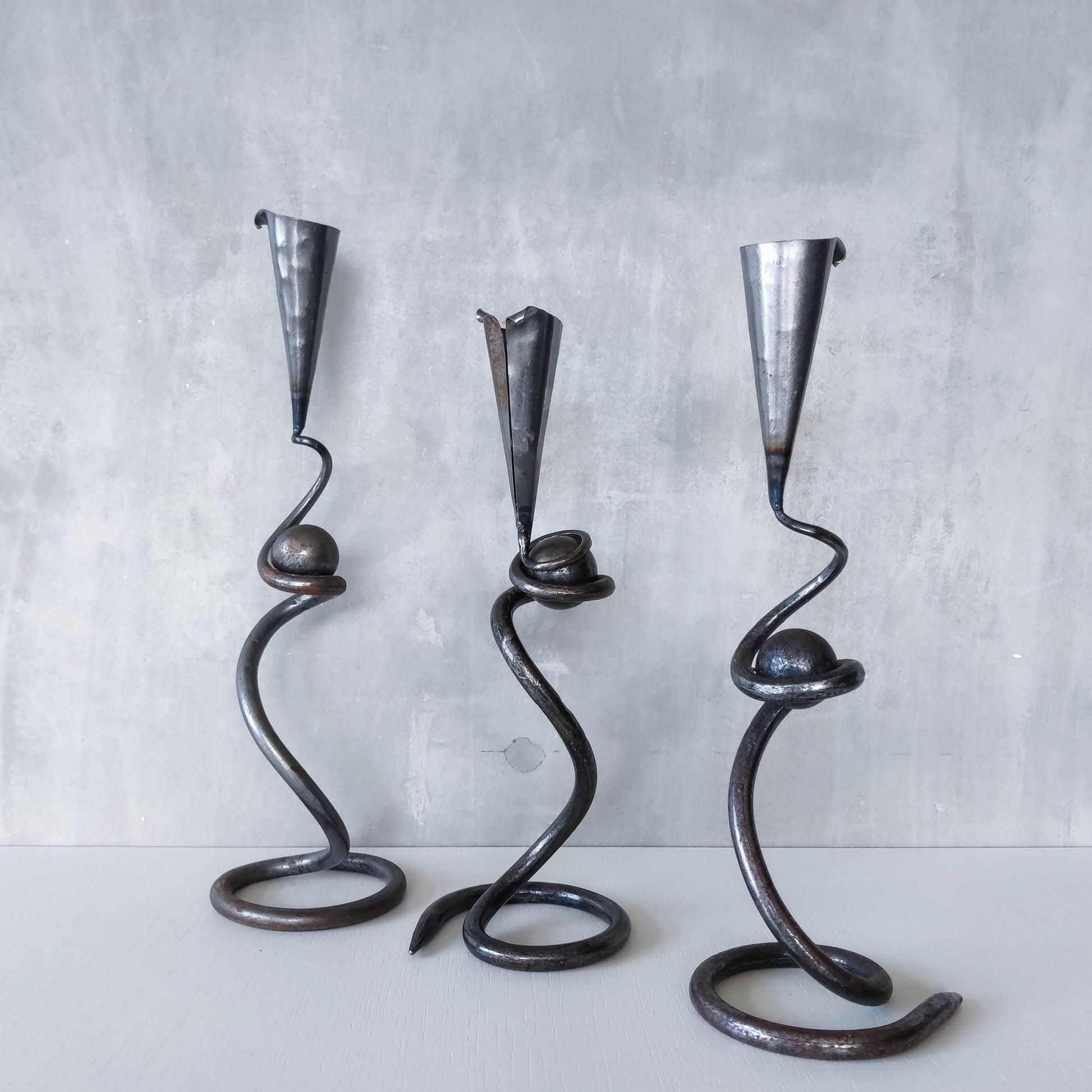 Trio of hand forged blacksmith made (possibly Belltrees Forge) sculptural wrought iron twisted candle holders with ball detail and welded steel tops. Lovely shape and form differences between the three. Please see photos and condition description.