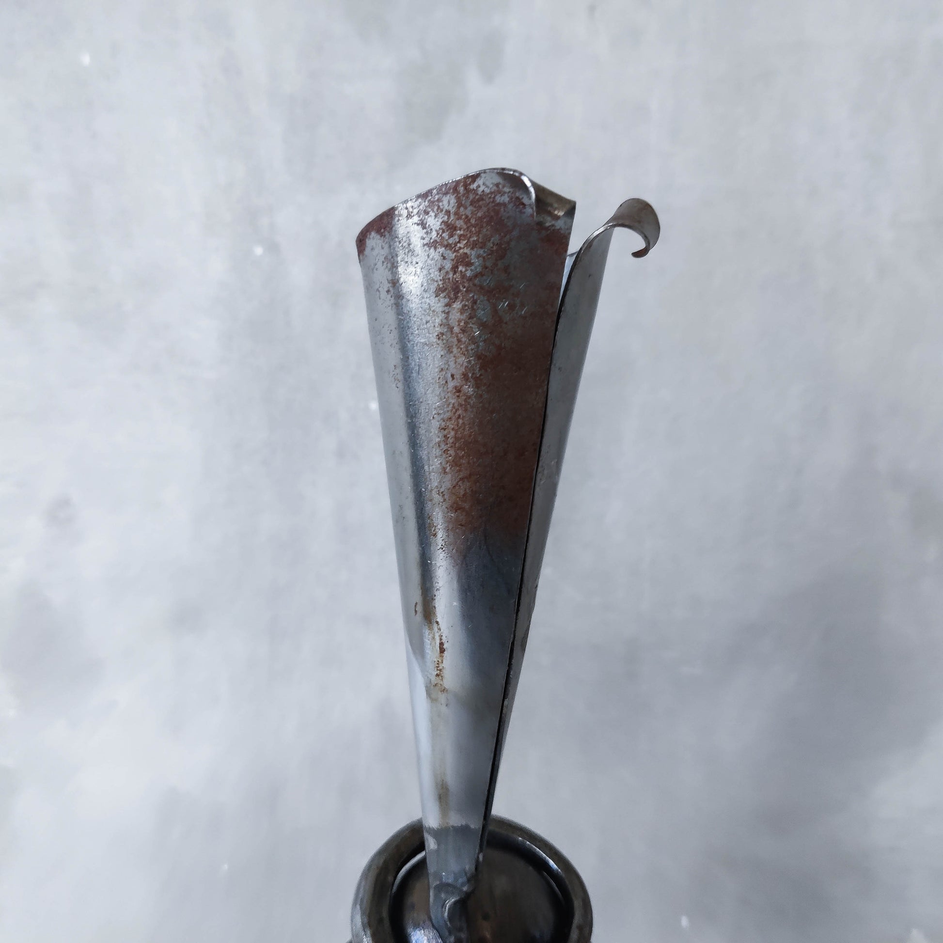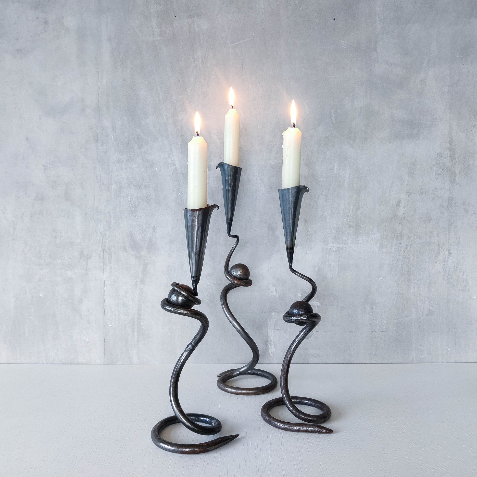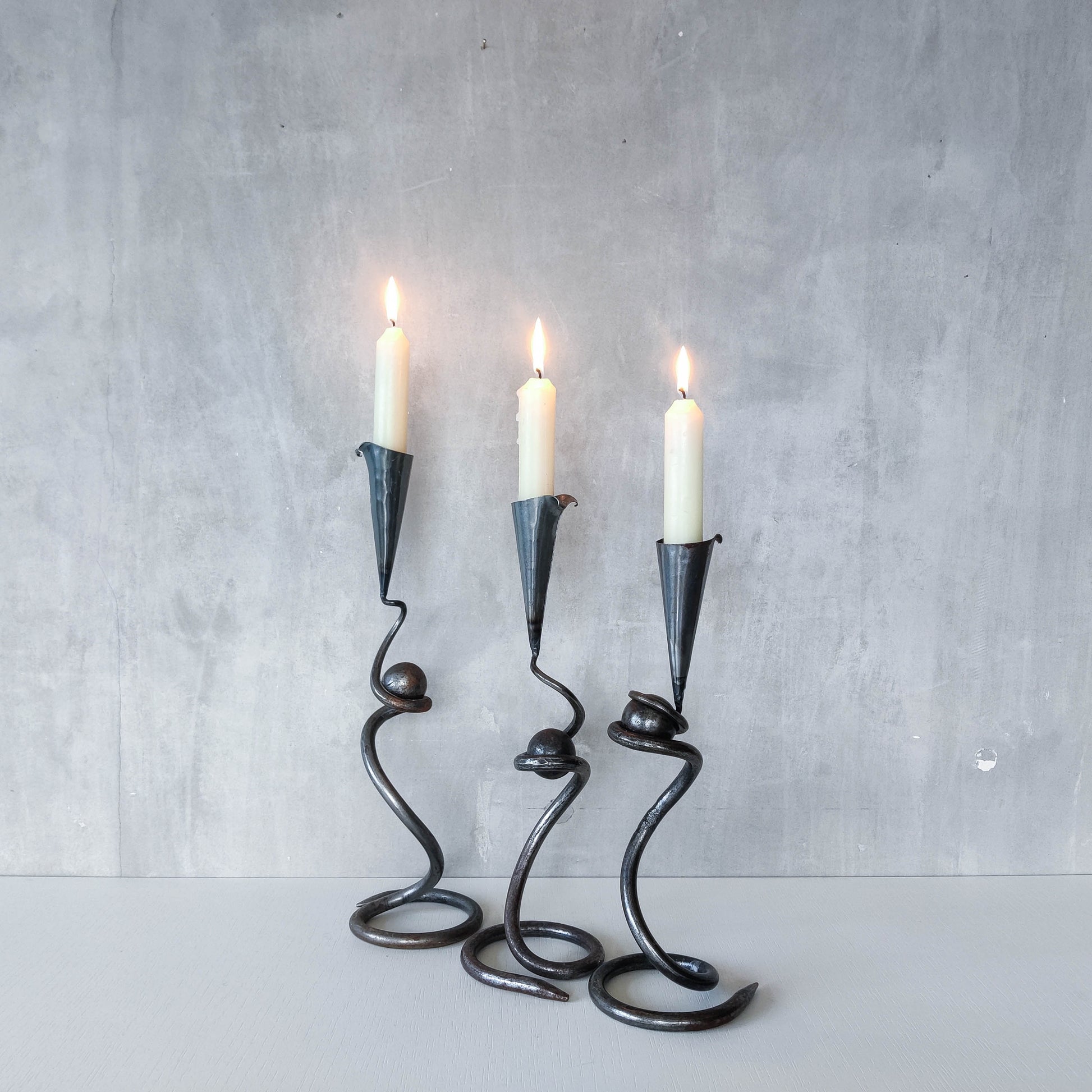 Condition: Generally in good/very good condition with some rust. The tallest candleholder has some very light rust otherwise it is in very good condition. The middle sized candleholder has some light rust in the aperture otherwise it is in very good condition. The smallest candleholder has some rust to the steel top on one side and some rust to the edge of the wrought iron. Handmade with associated imperfections and irregularities, lovely shape differences between the three.