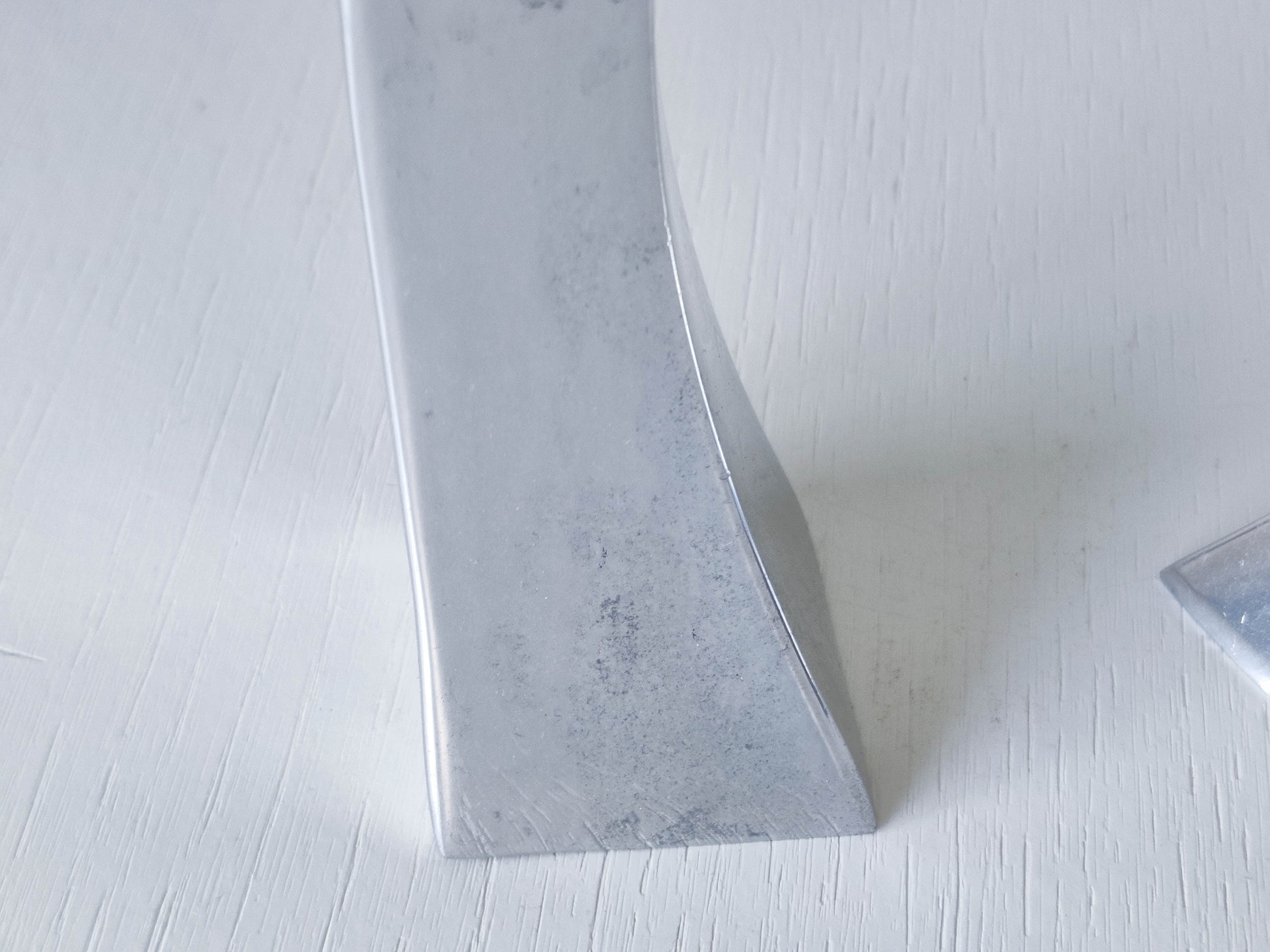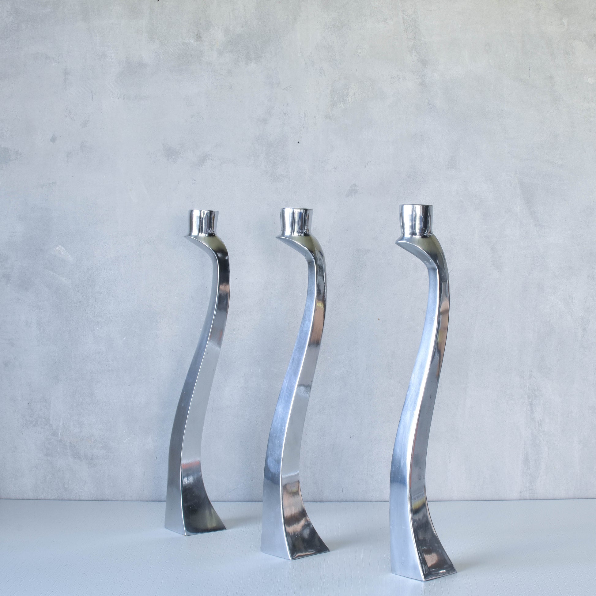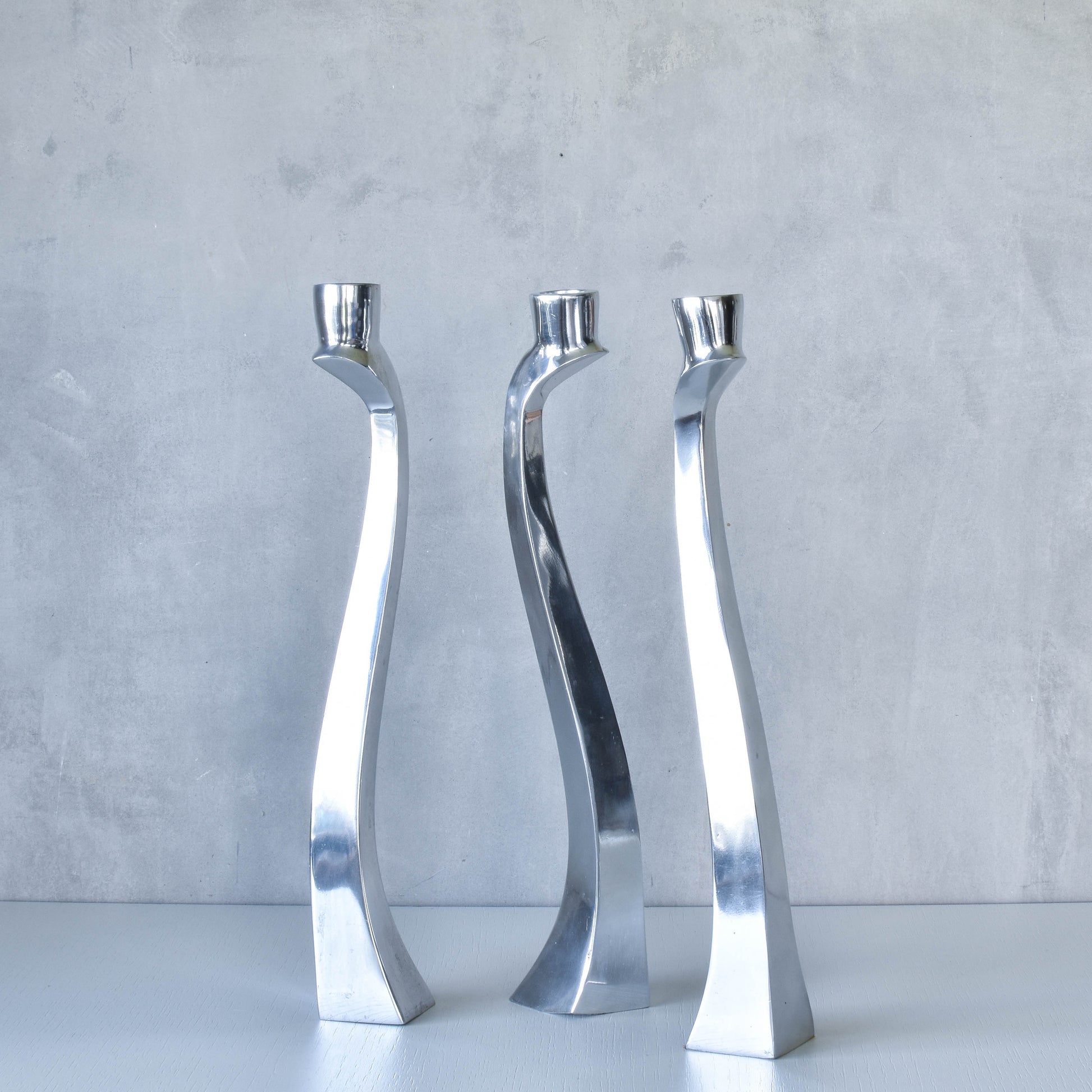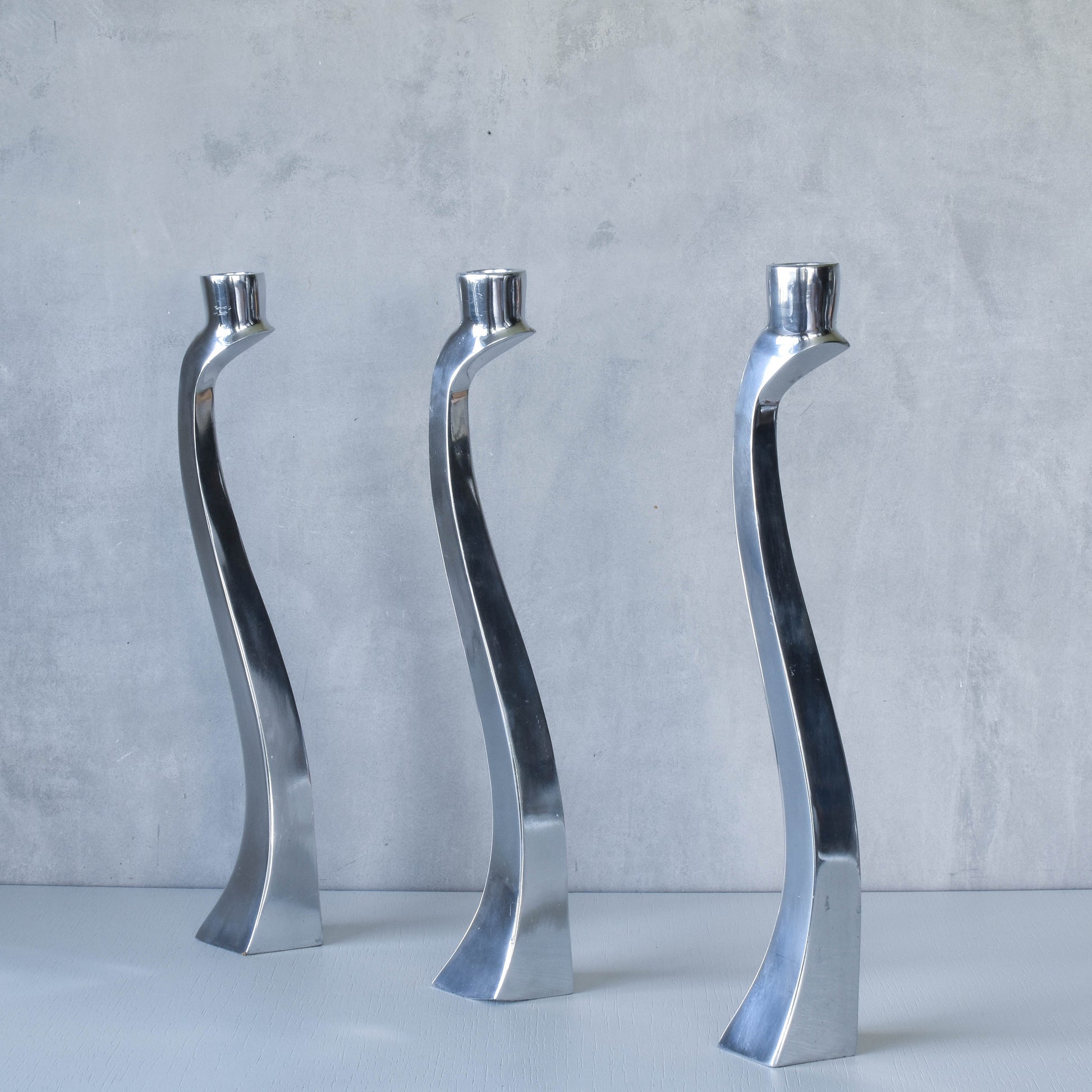 Trio of elegant Matthew Hilton style 'Nessie' biomorphic sculptural cast aluminium candle holders. Exact age unknown. Sorry candles not included.
