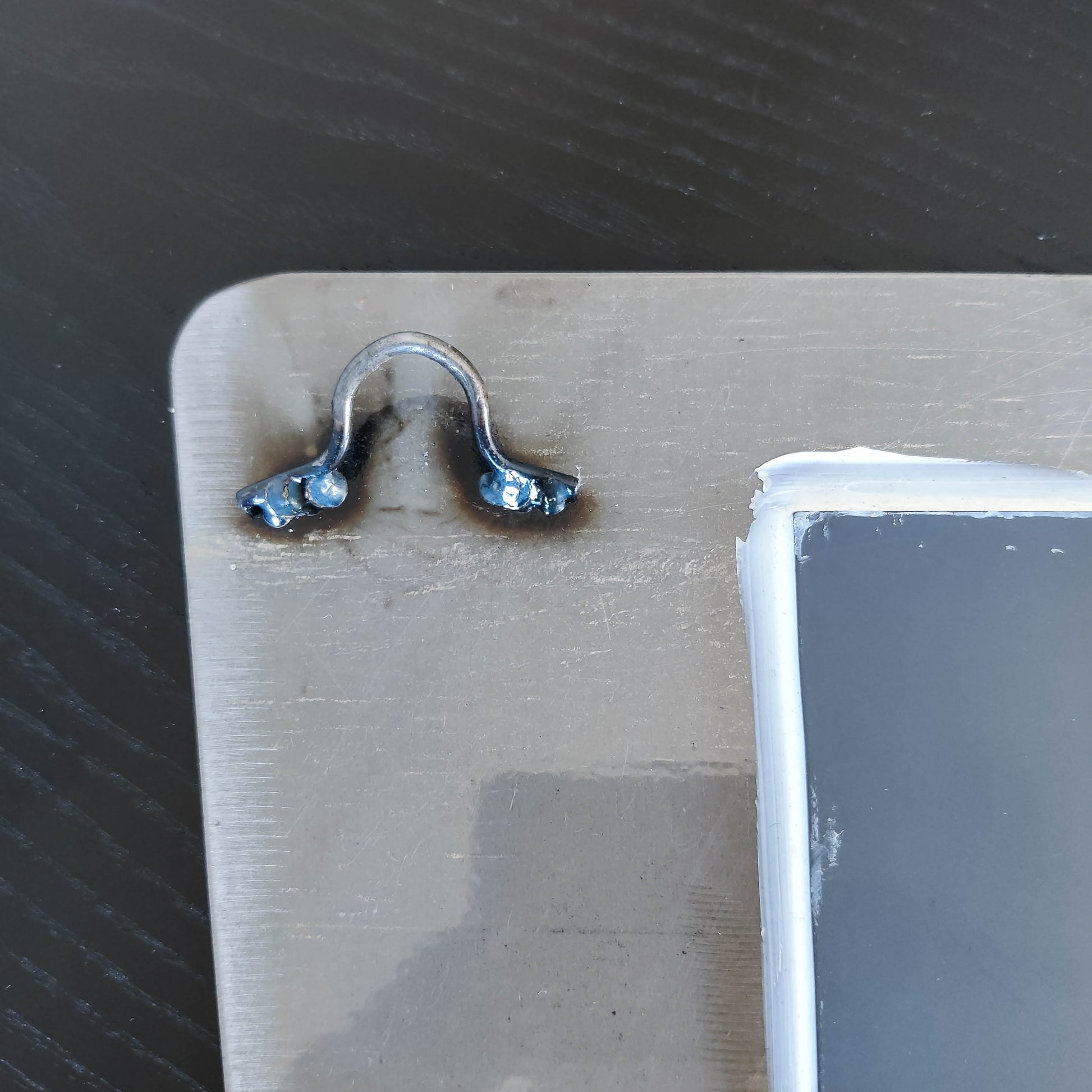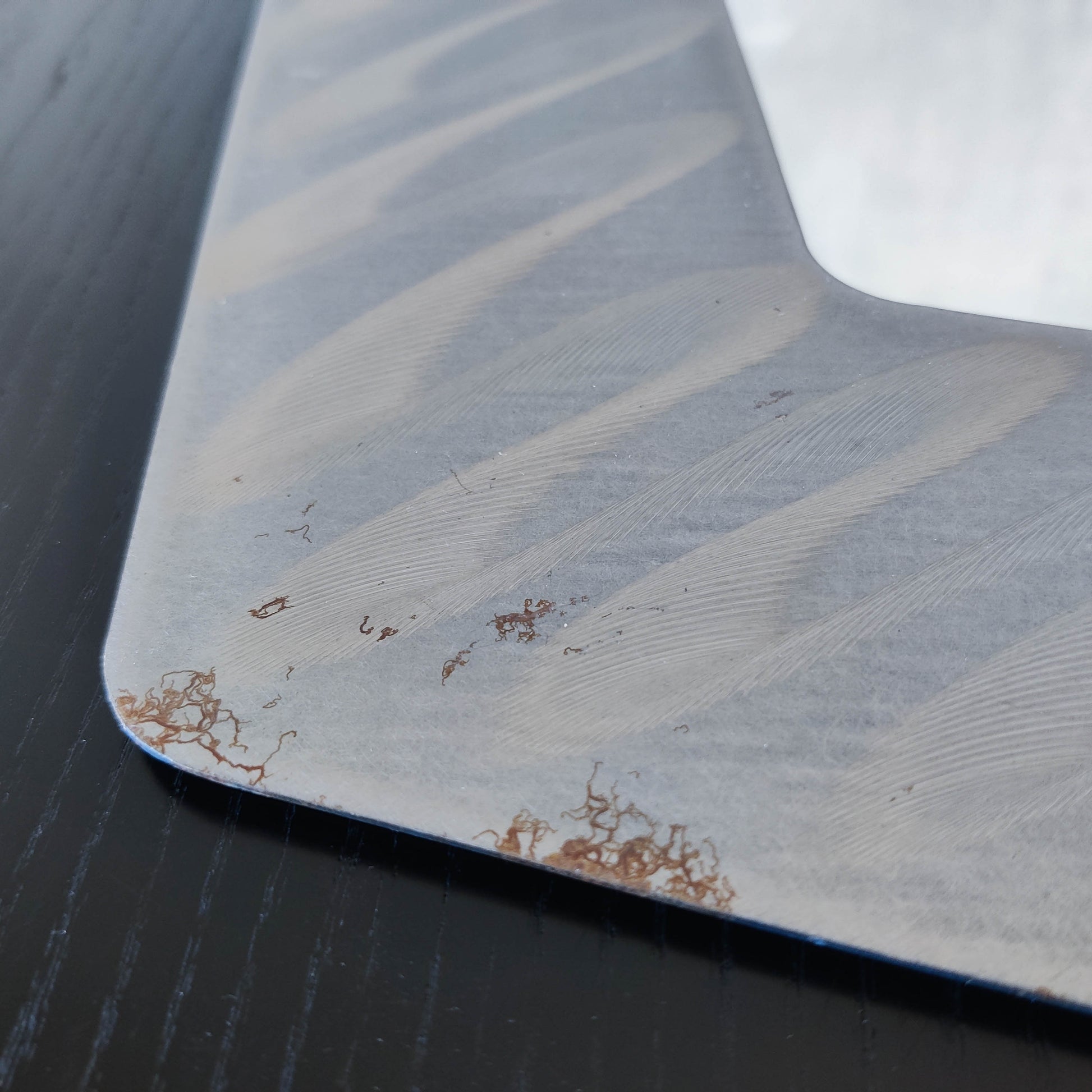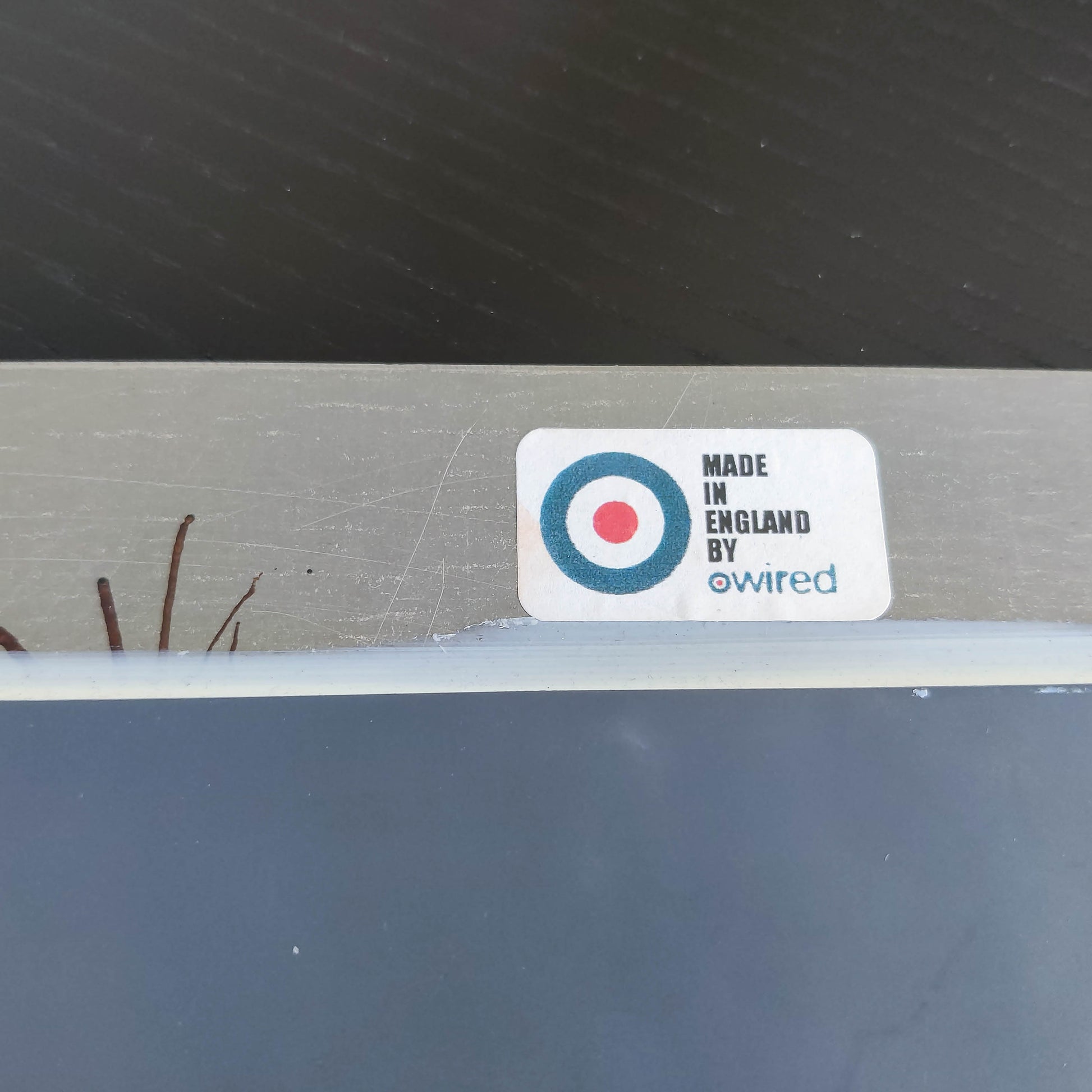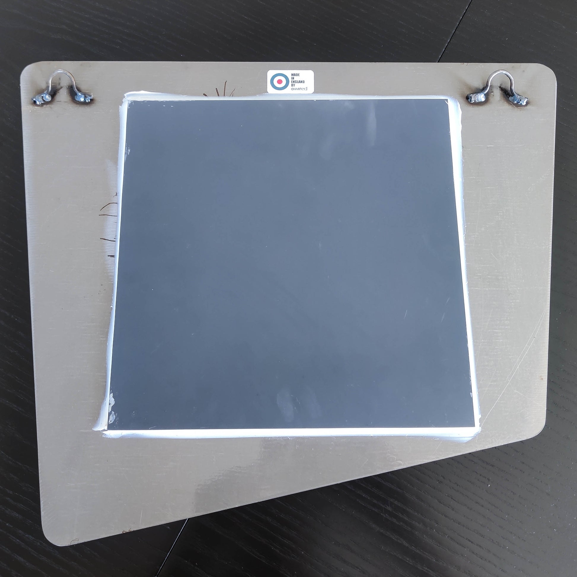 Asymmetric postmodern style steel torched mirror with lacquered finish. Made in England by Wired. Very well made with lovely welded hanging loops to back. Exaggerated curved corners. Quite heavy, approx. 2kg and will be a medium parcel. Please see photos and condition description.