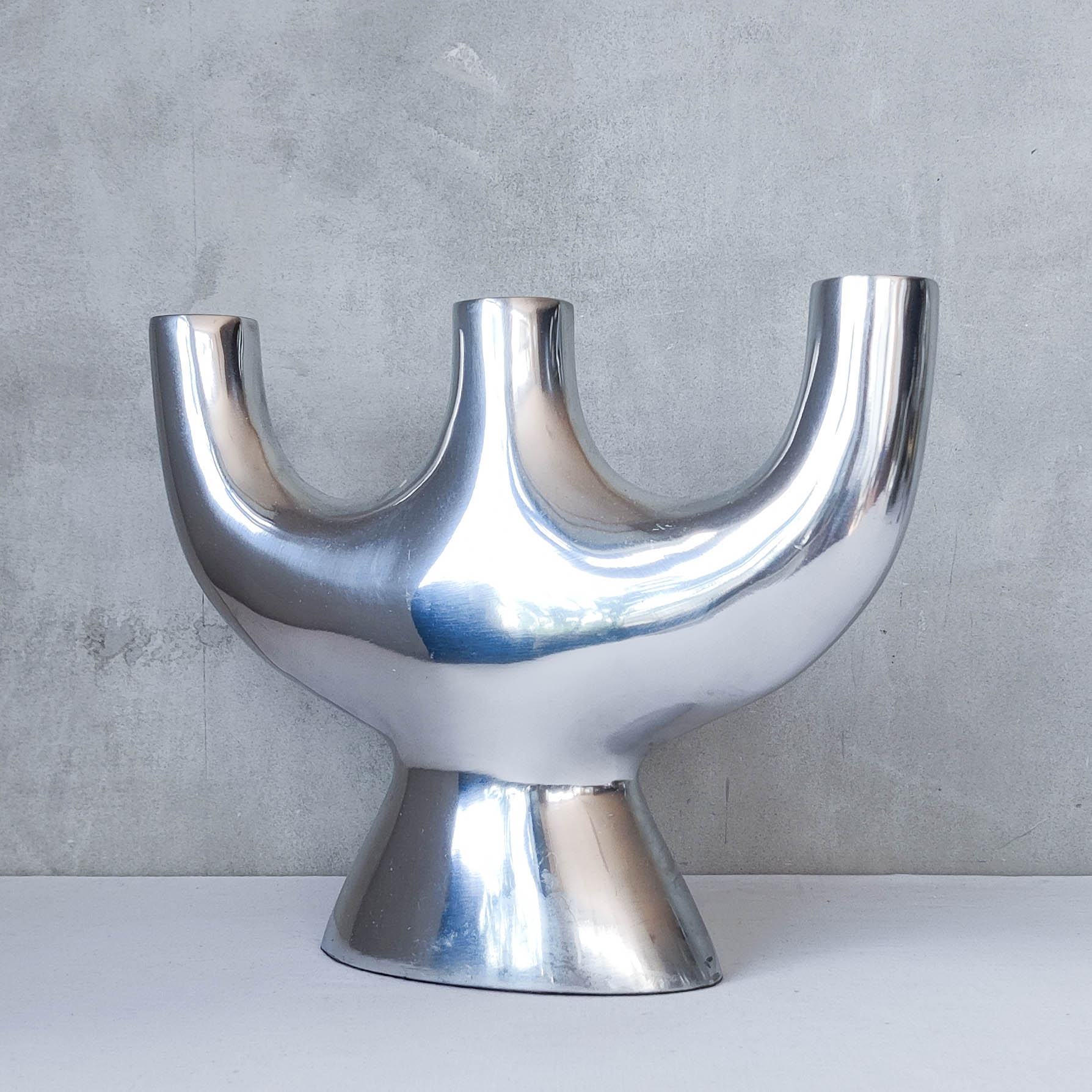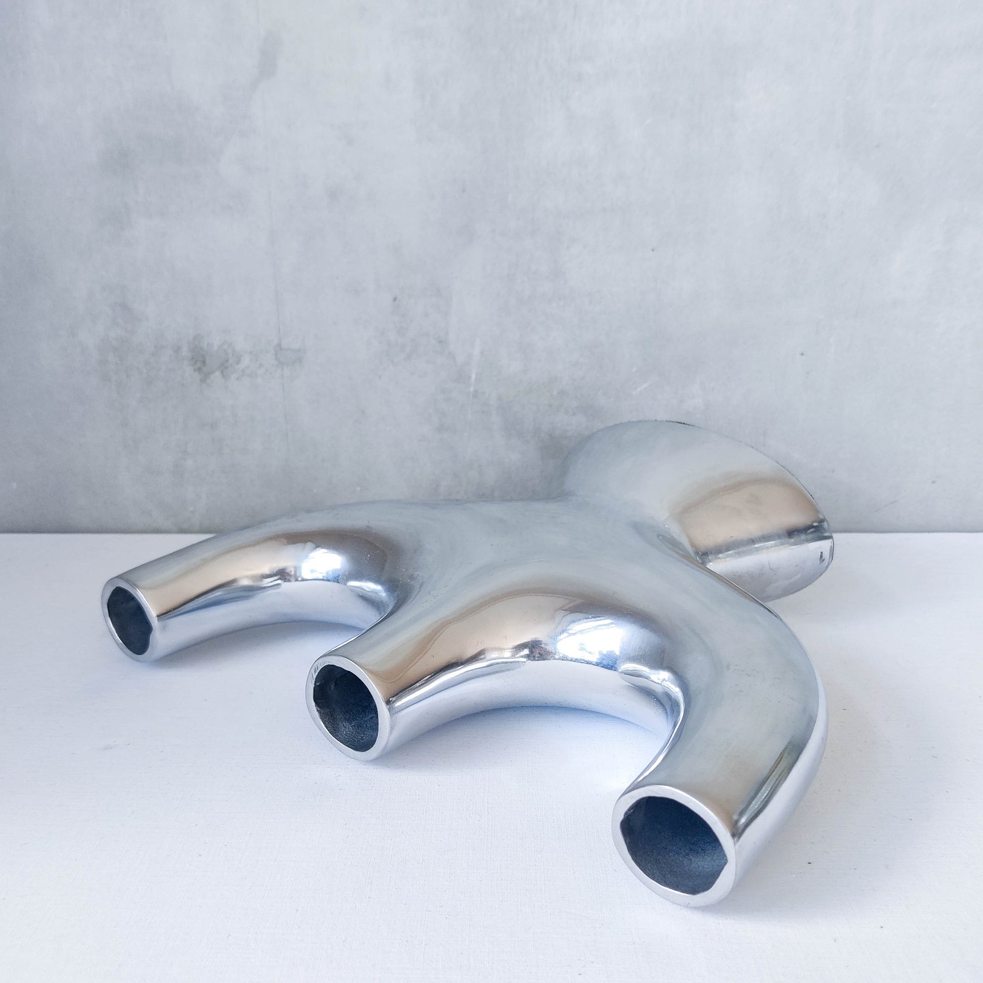 Sculptural modernist form tulip vase vessel with 3 openings. Heavy cast polished aluminium. Strong shape. Exact age unknown, assuming 00s.