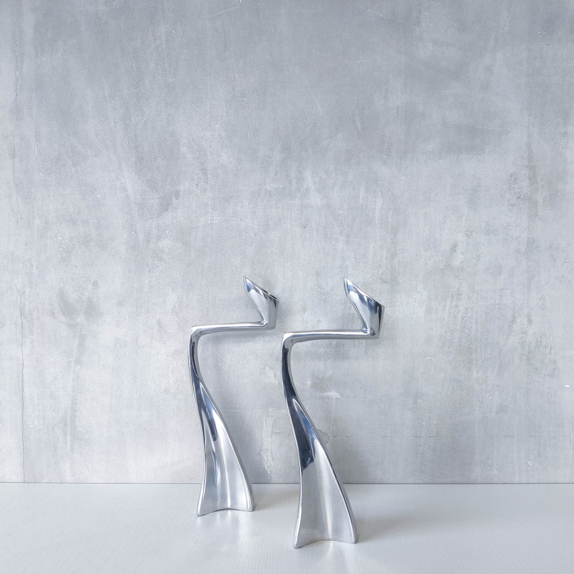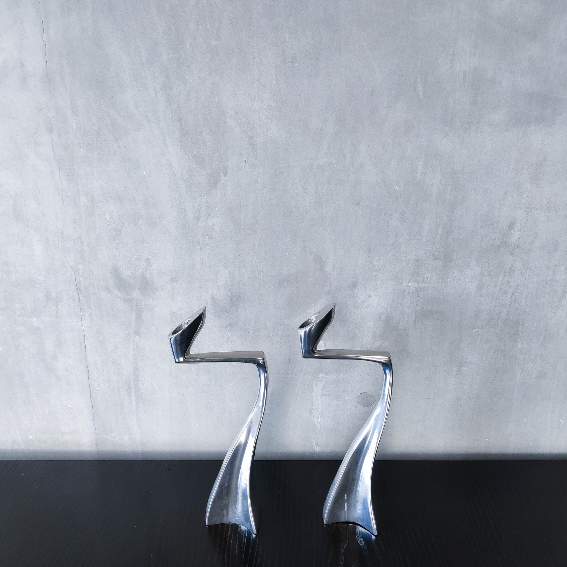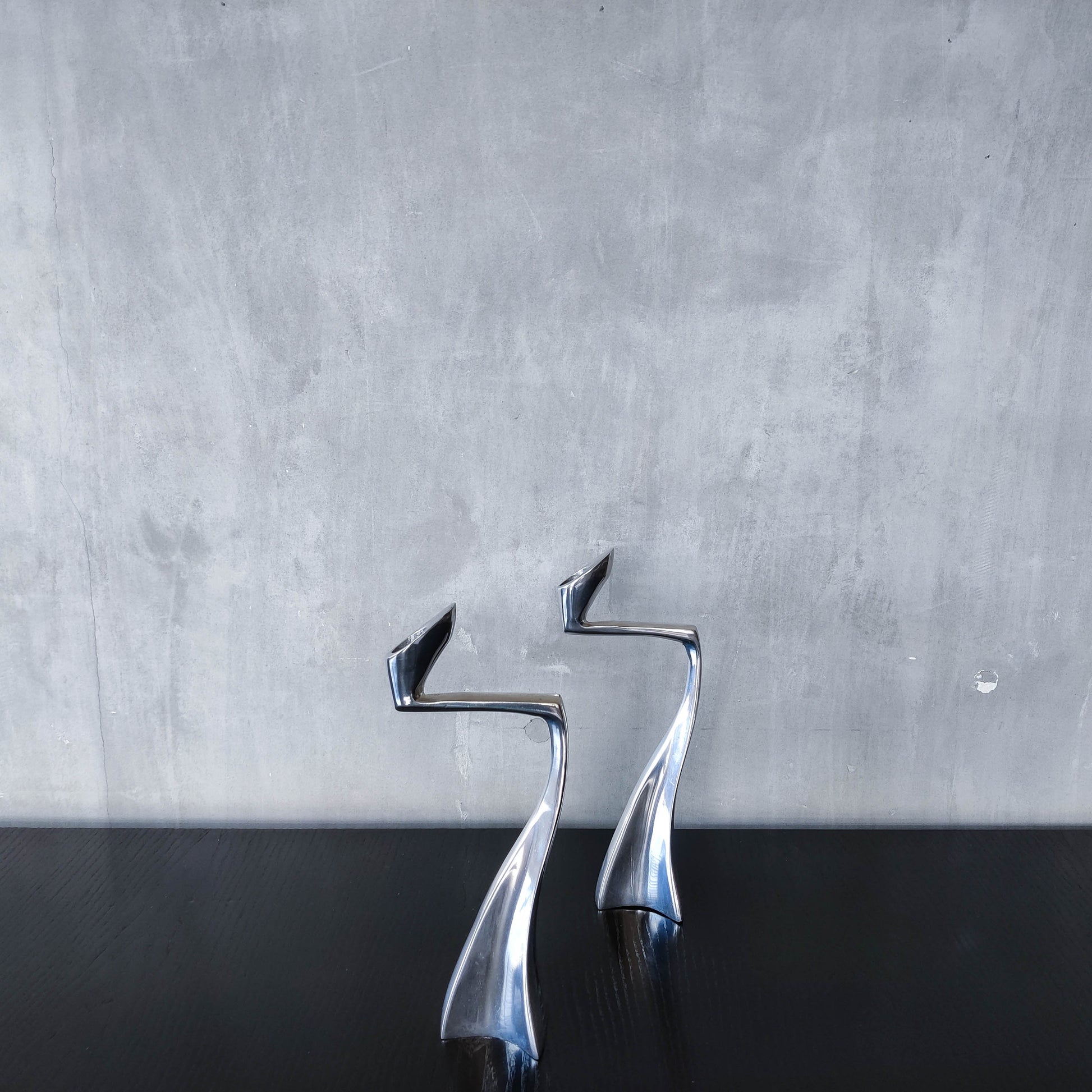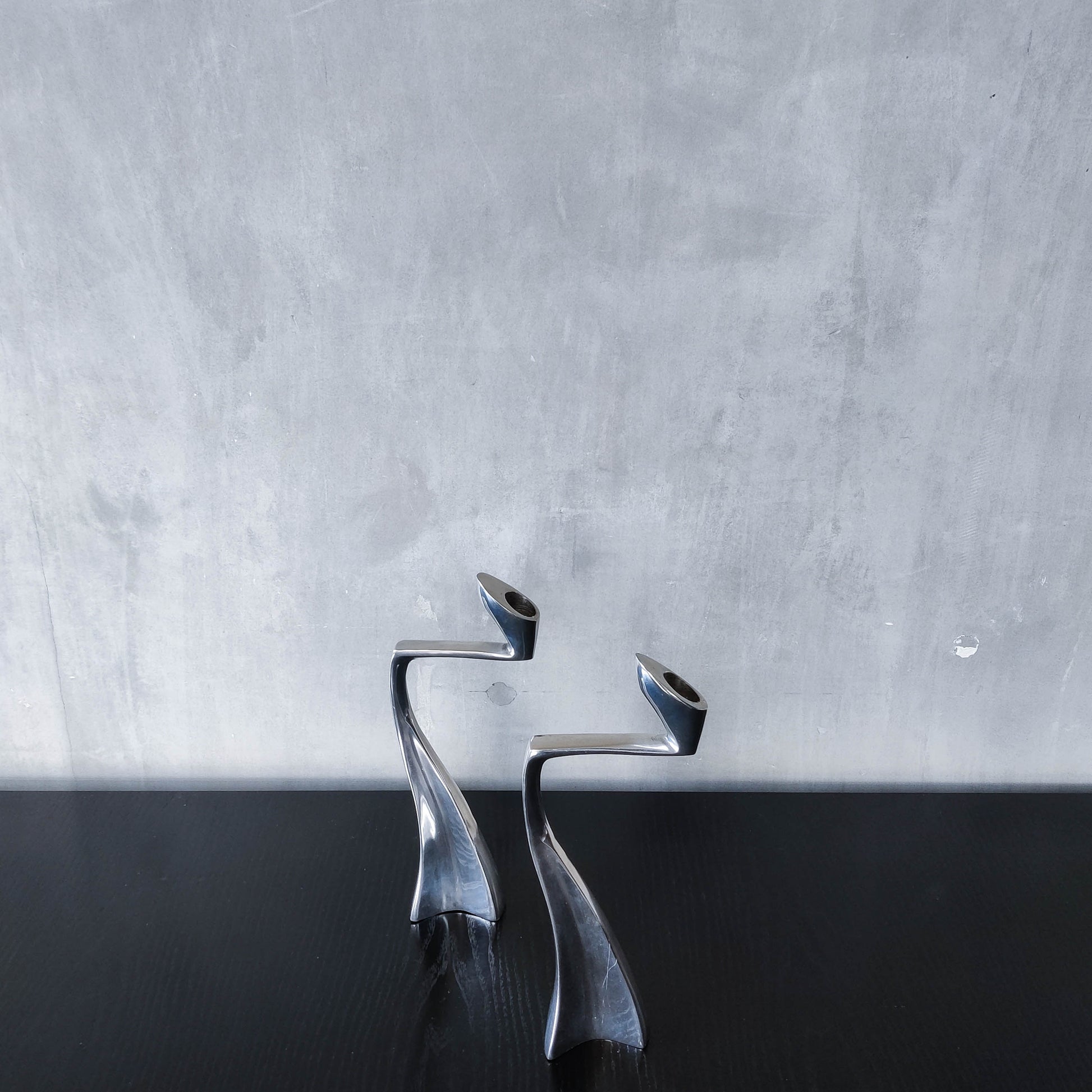 A pair of cast aluminium vintage 1990s candle holders in the style of Matthew Hilton (not stamped). Swan neck sculptural form. To fit dinner candles (sorry not included). Please see photos and condition description.