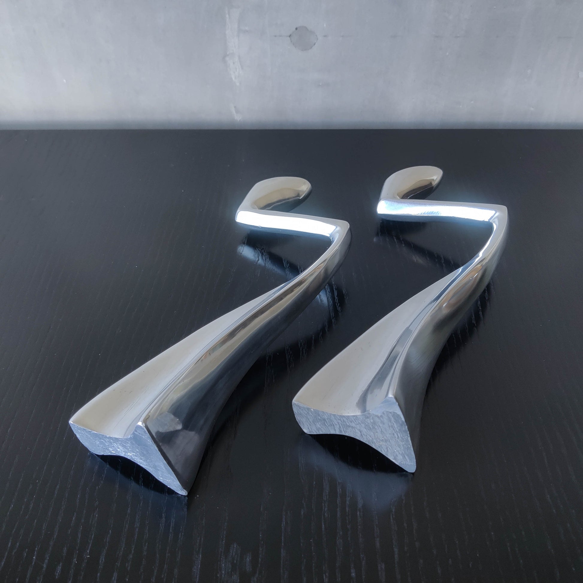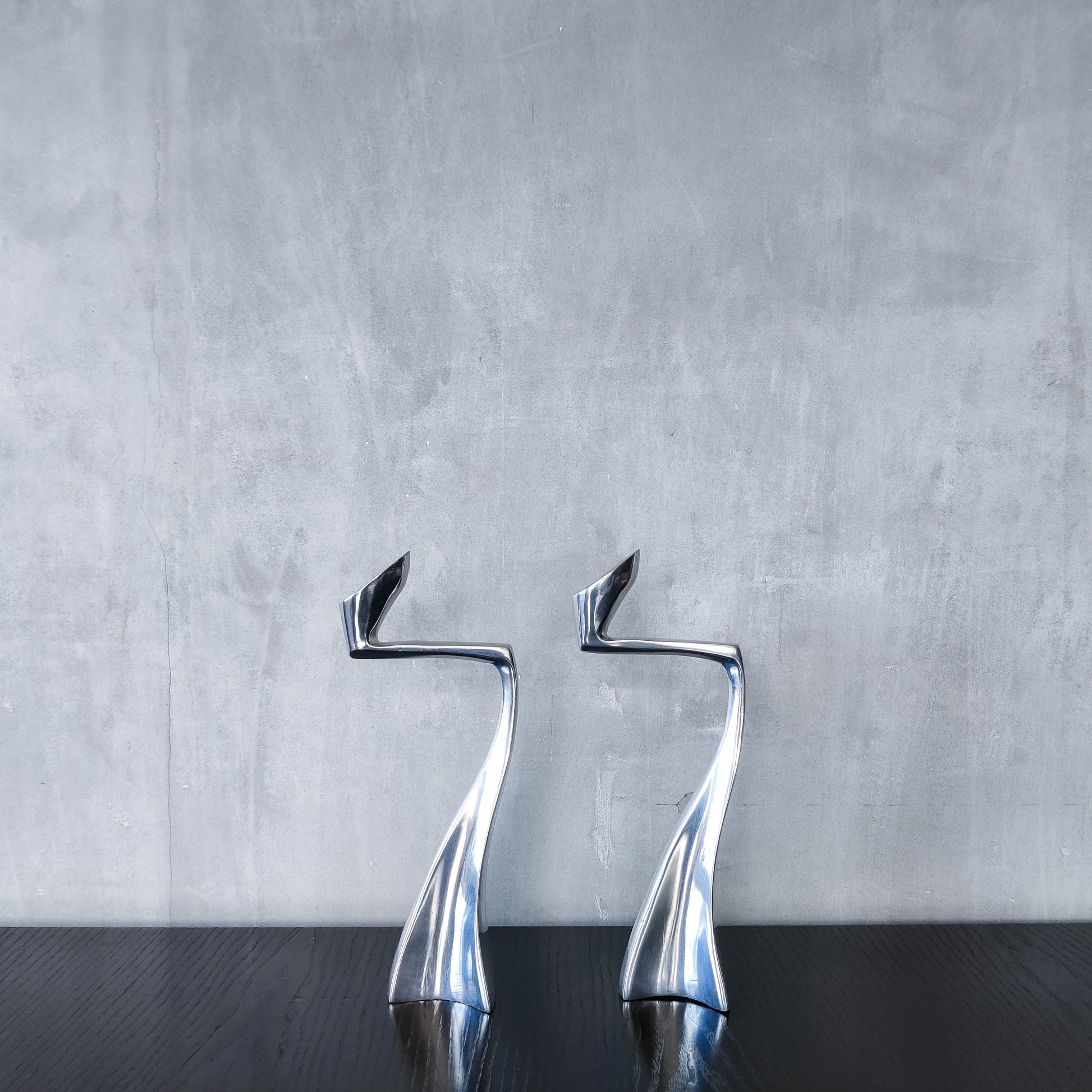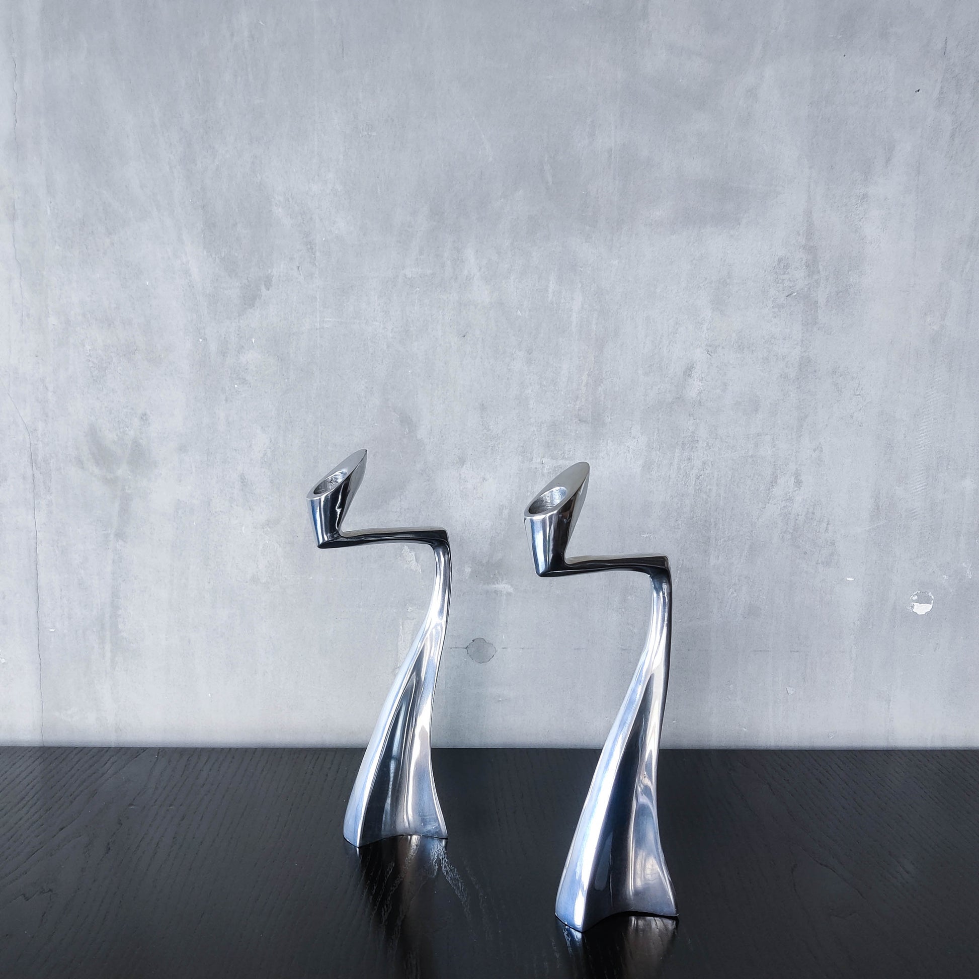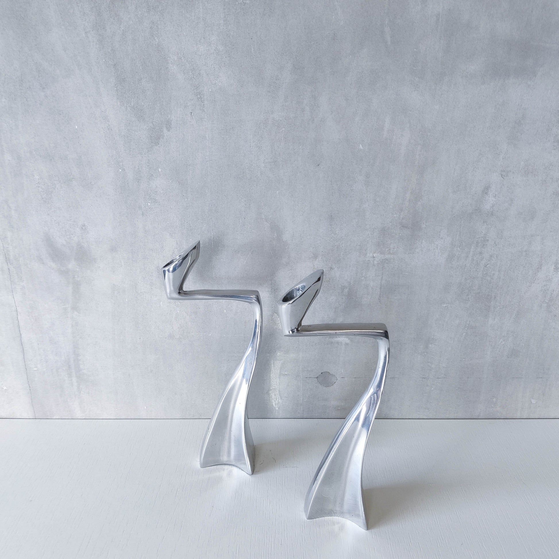 A pair of cast aluminium vintage 1990s candle holders in the style of Matthew Hilton (not stamped). Swan neck sculptural form. To fit dinner candles (sorry not included). Please see photos and condition description.
