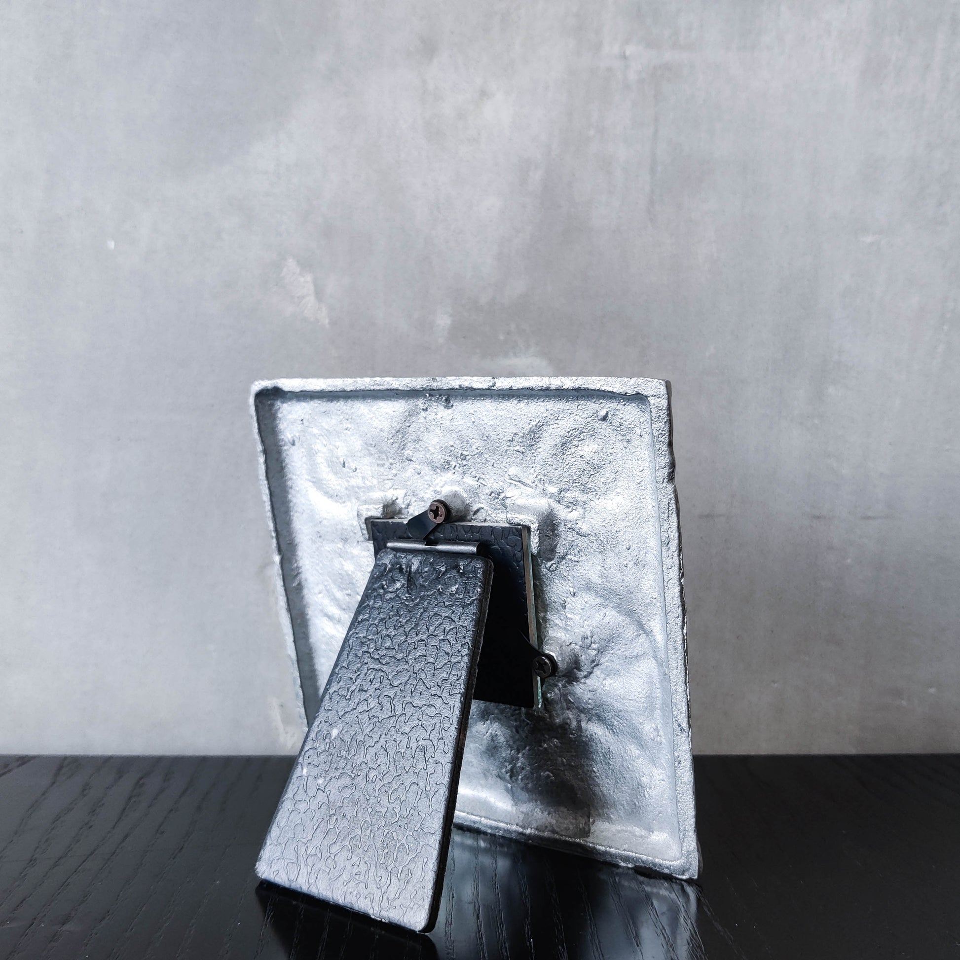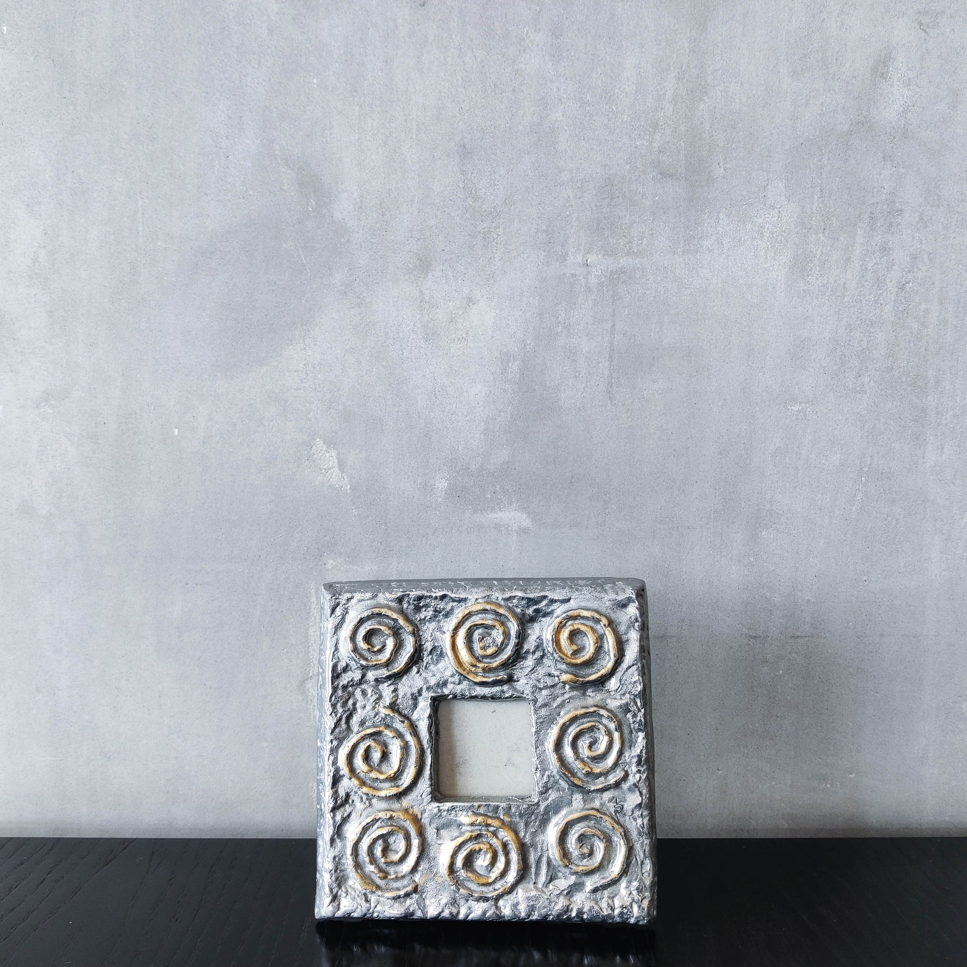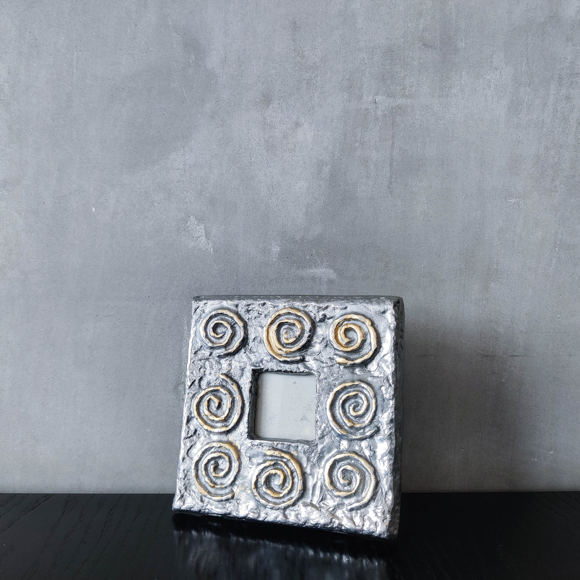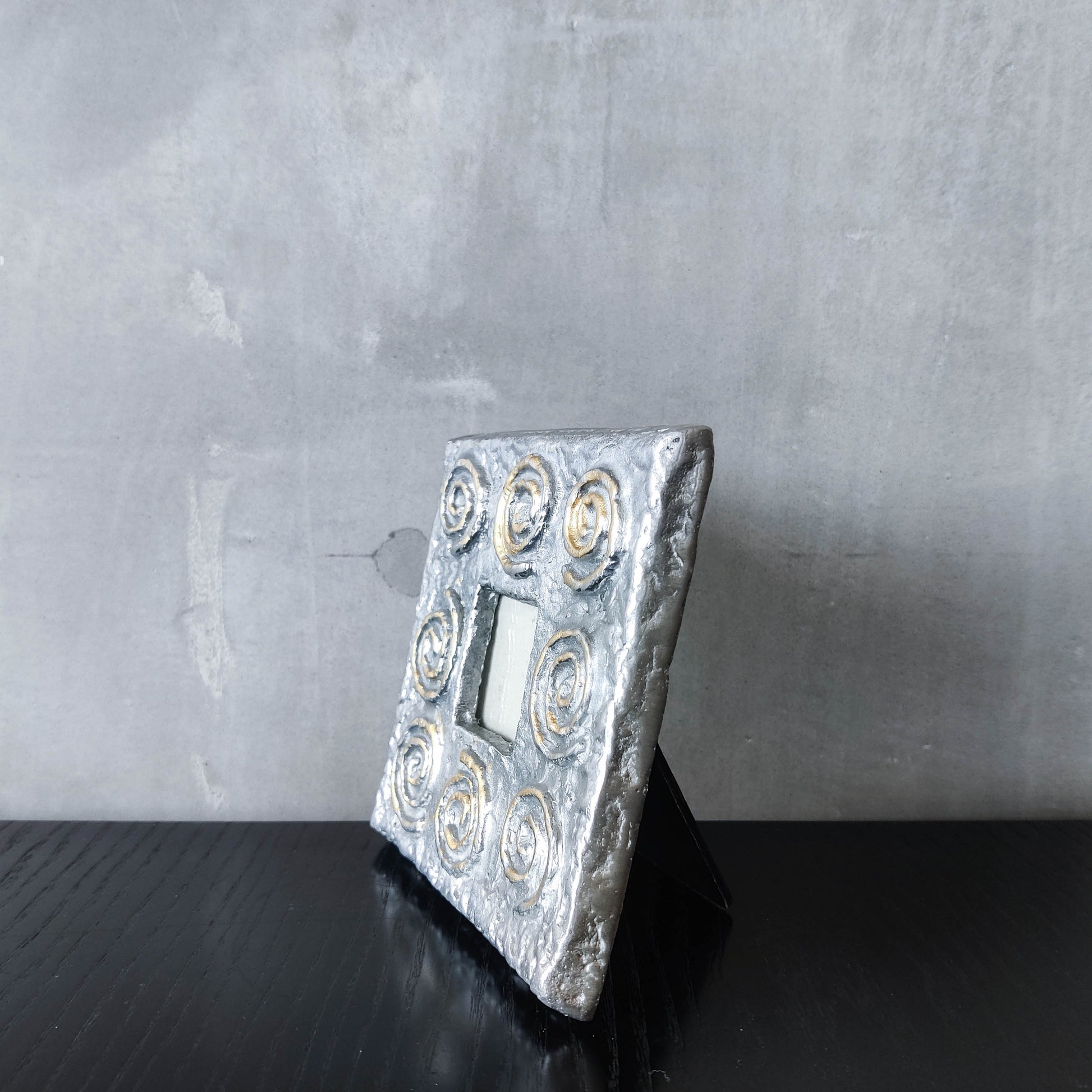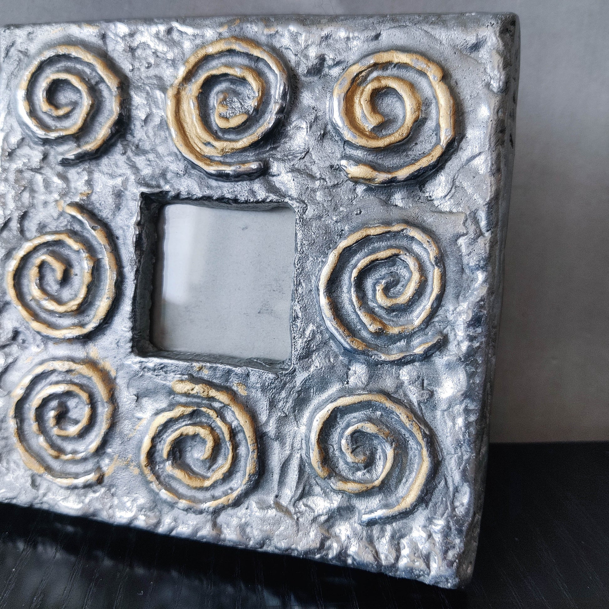 1990s cast aluminium chunky sculptural photo frame with texture and embossed spirals with sponged gold detail. Please see photos and condition.