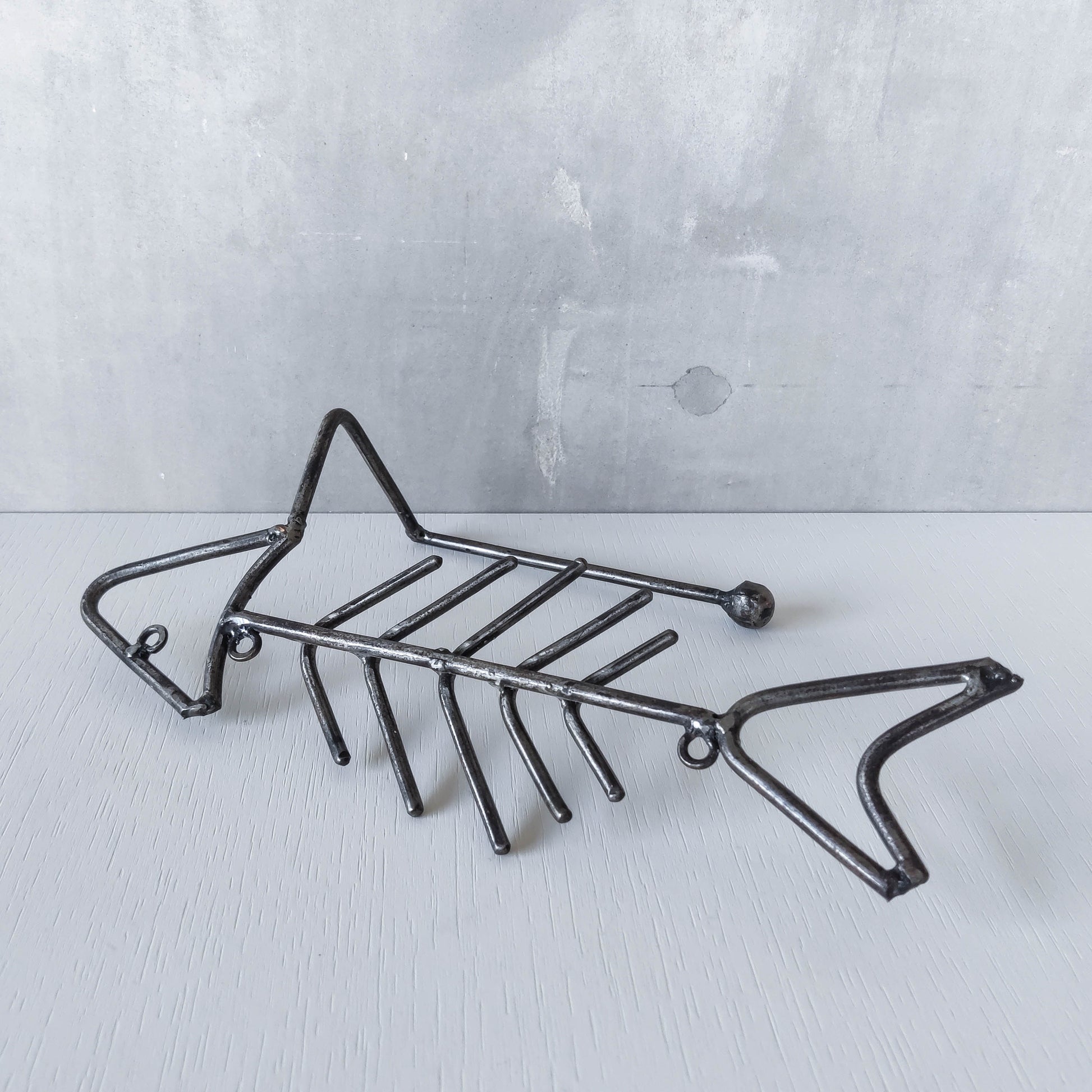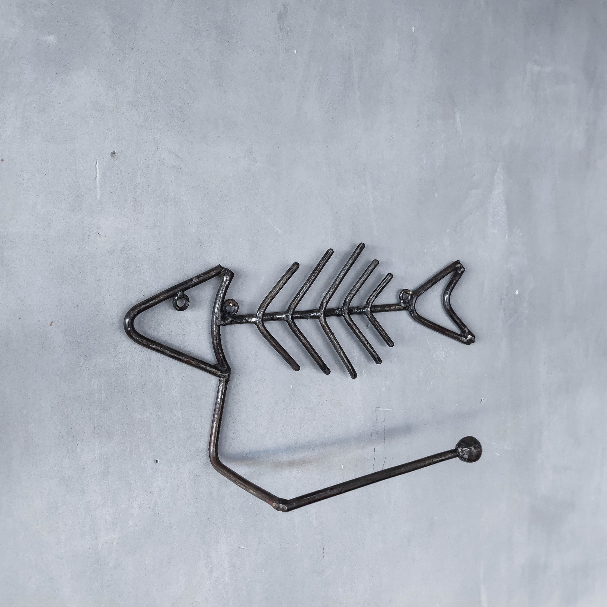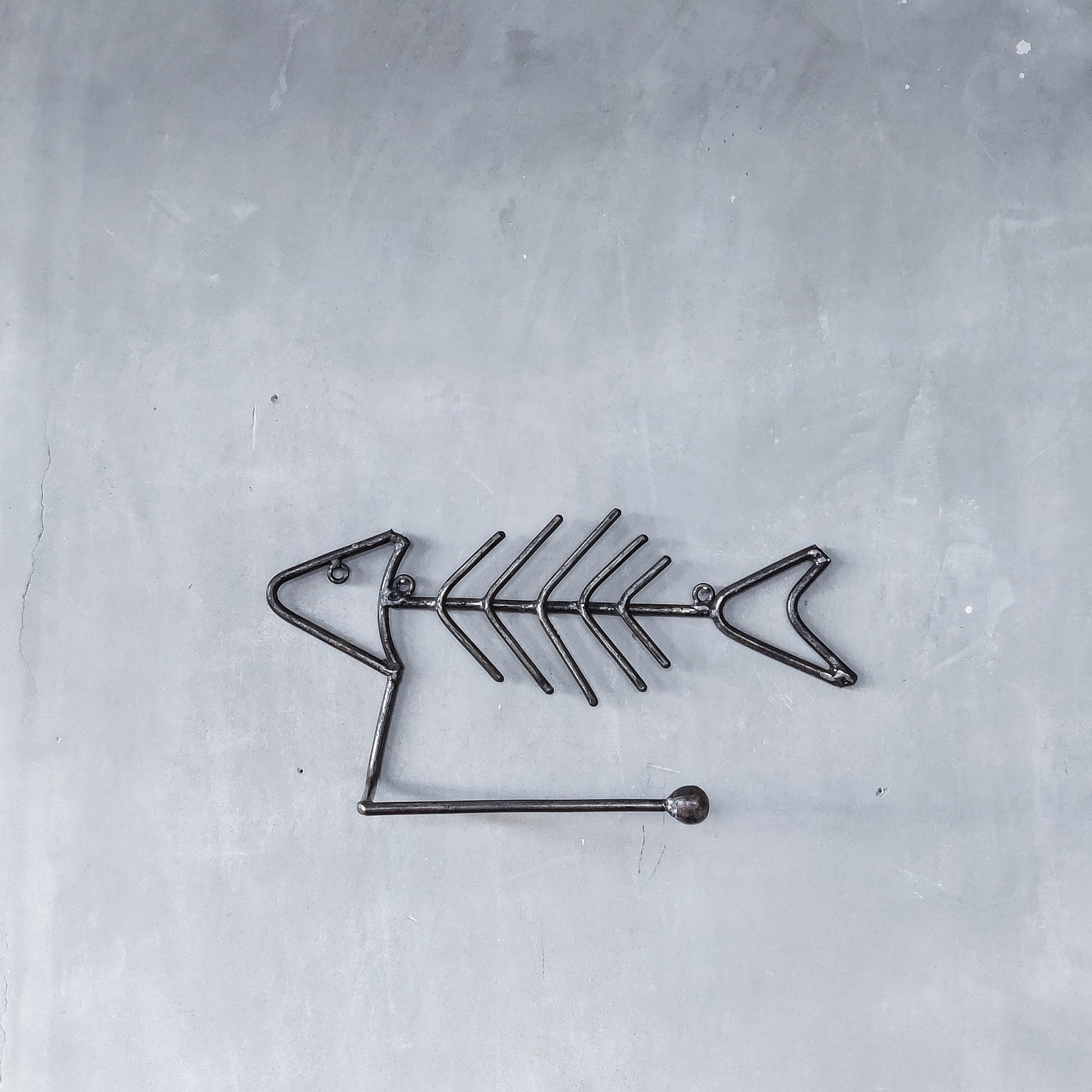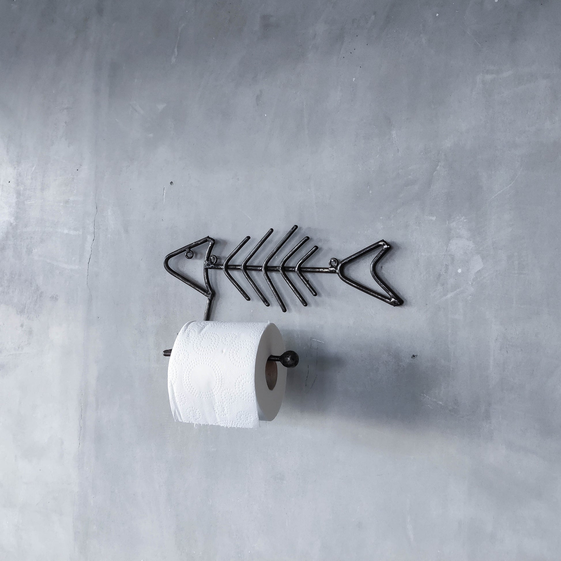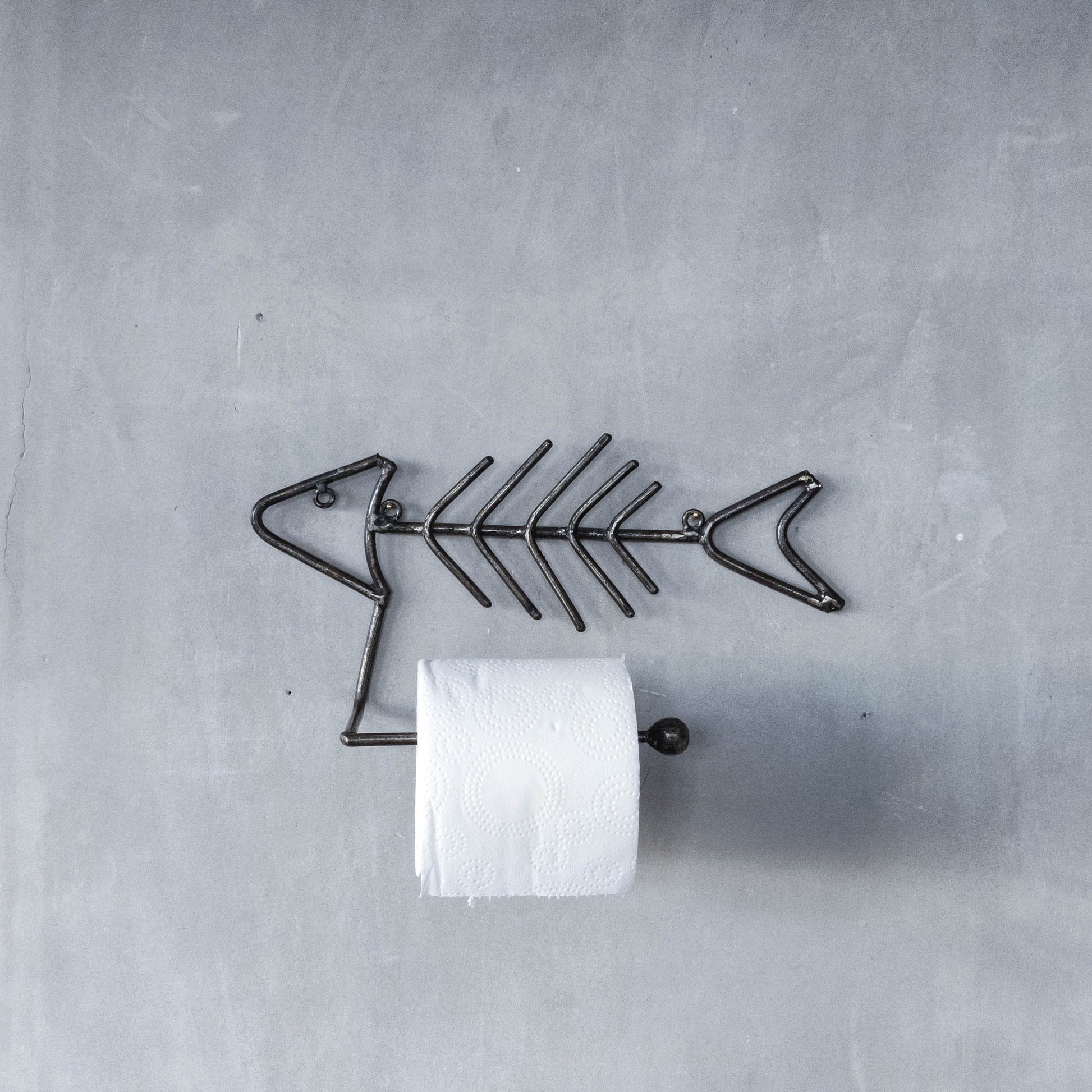 Vintage artisan made metalwork welded steel fish skeleton toilet roll holder
