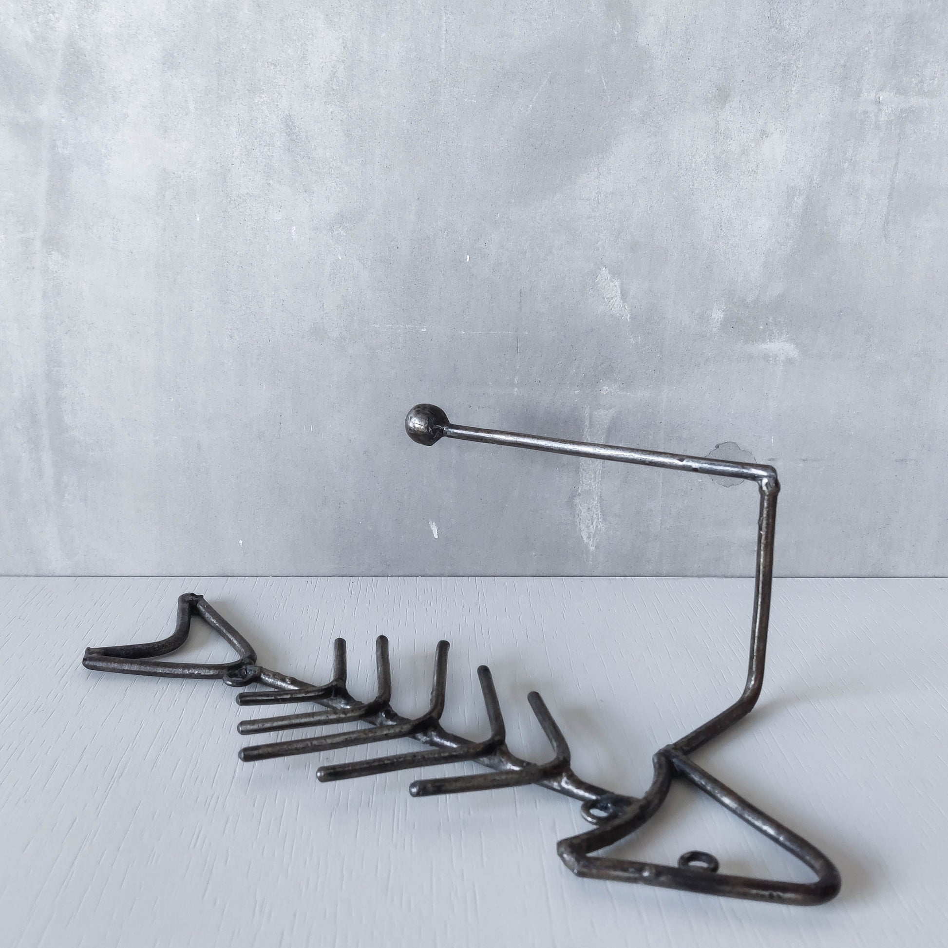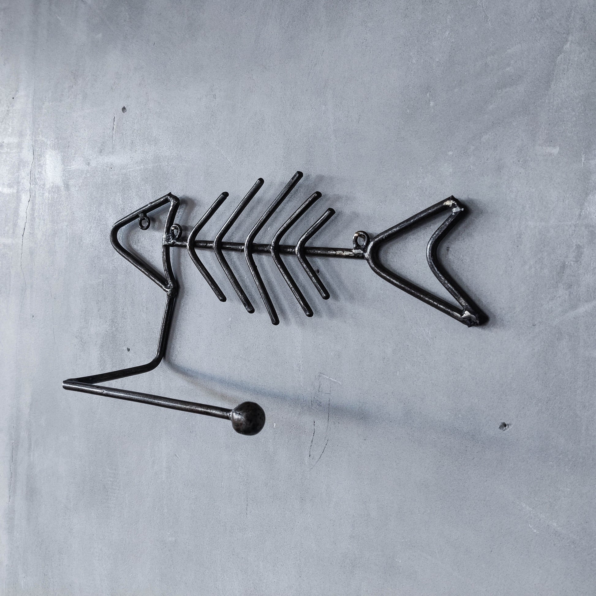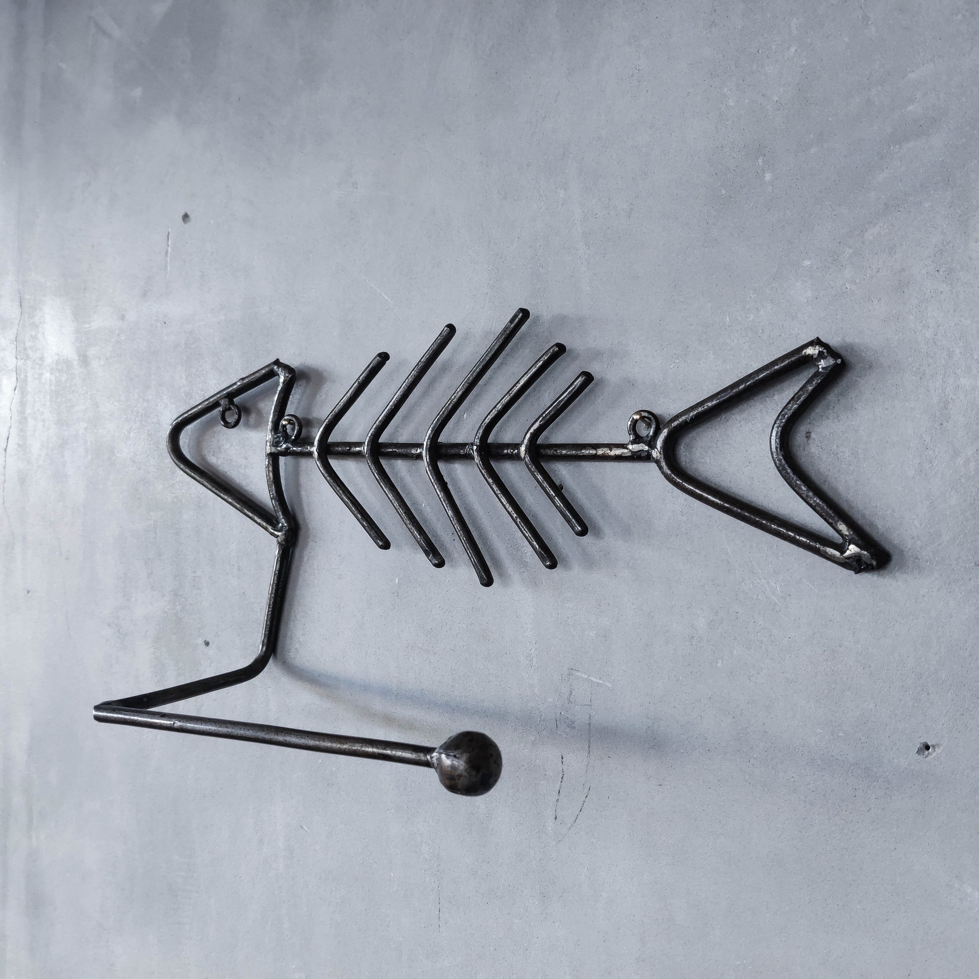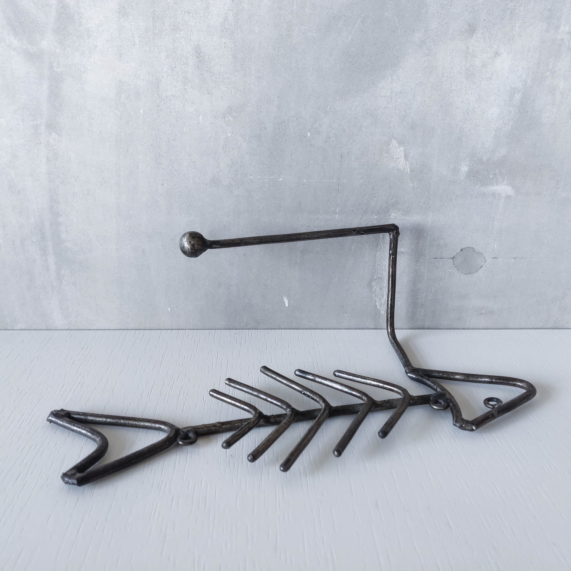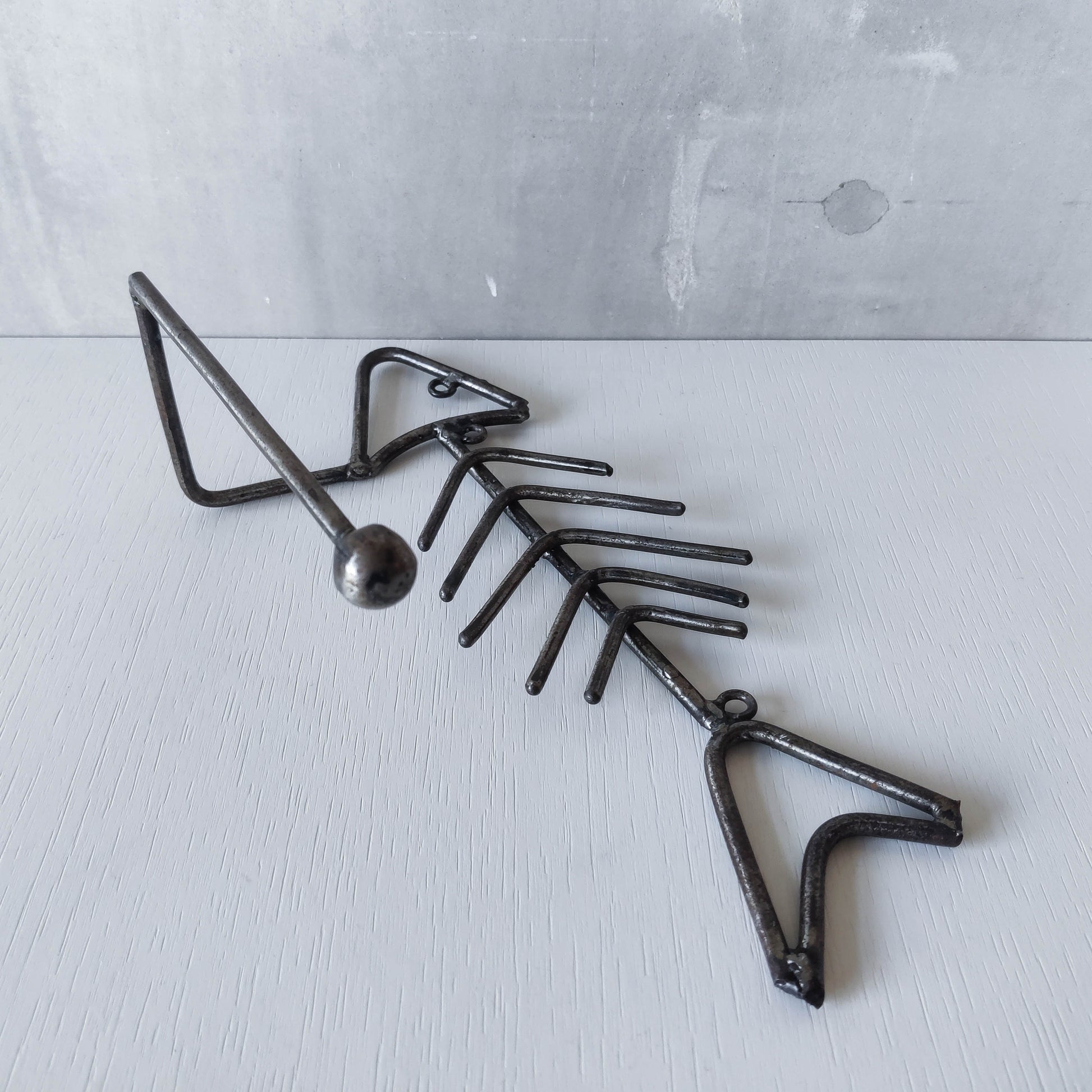 Vintage artisan made metalwork welded steel fish skeleton toilet roll holder
