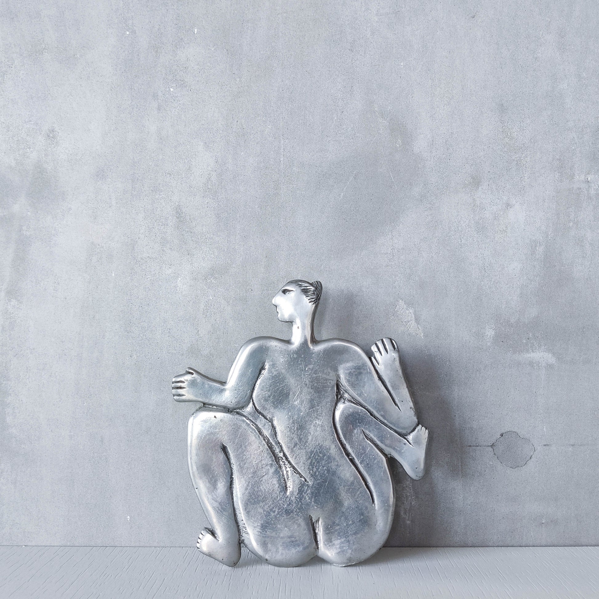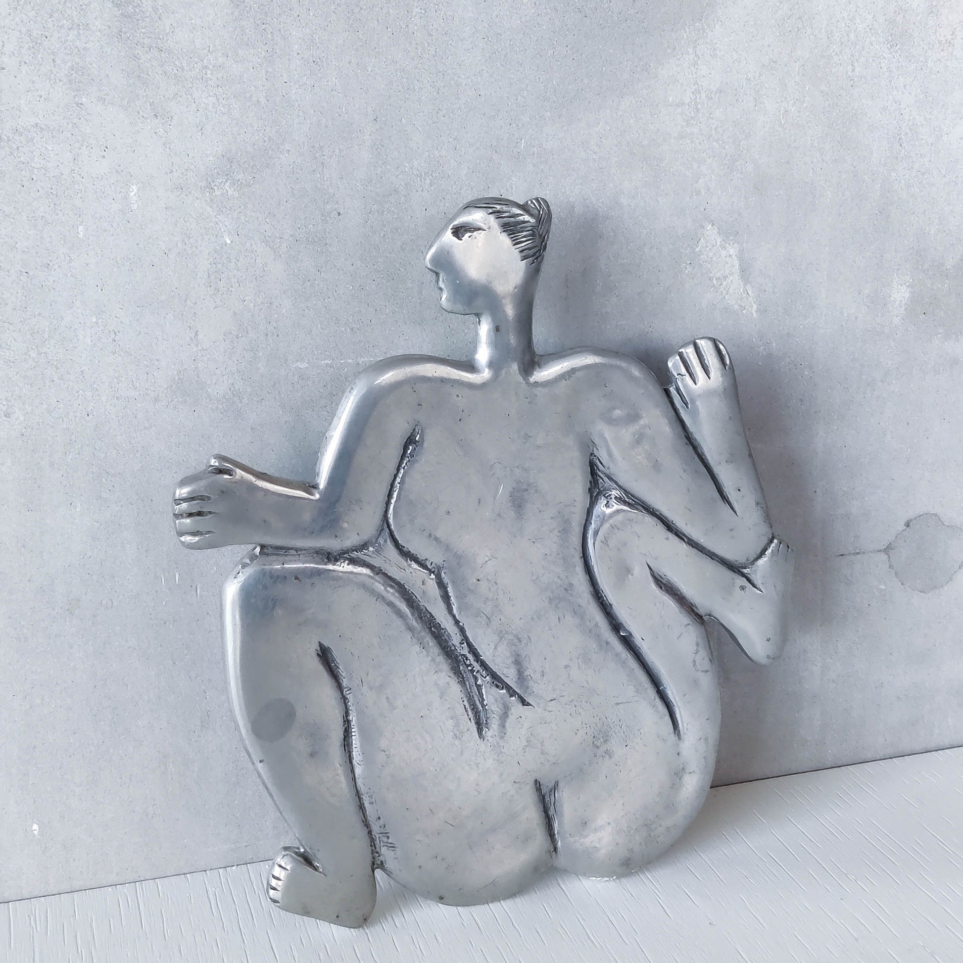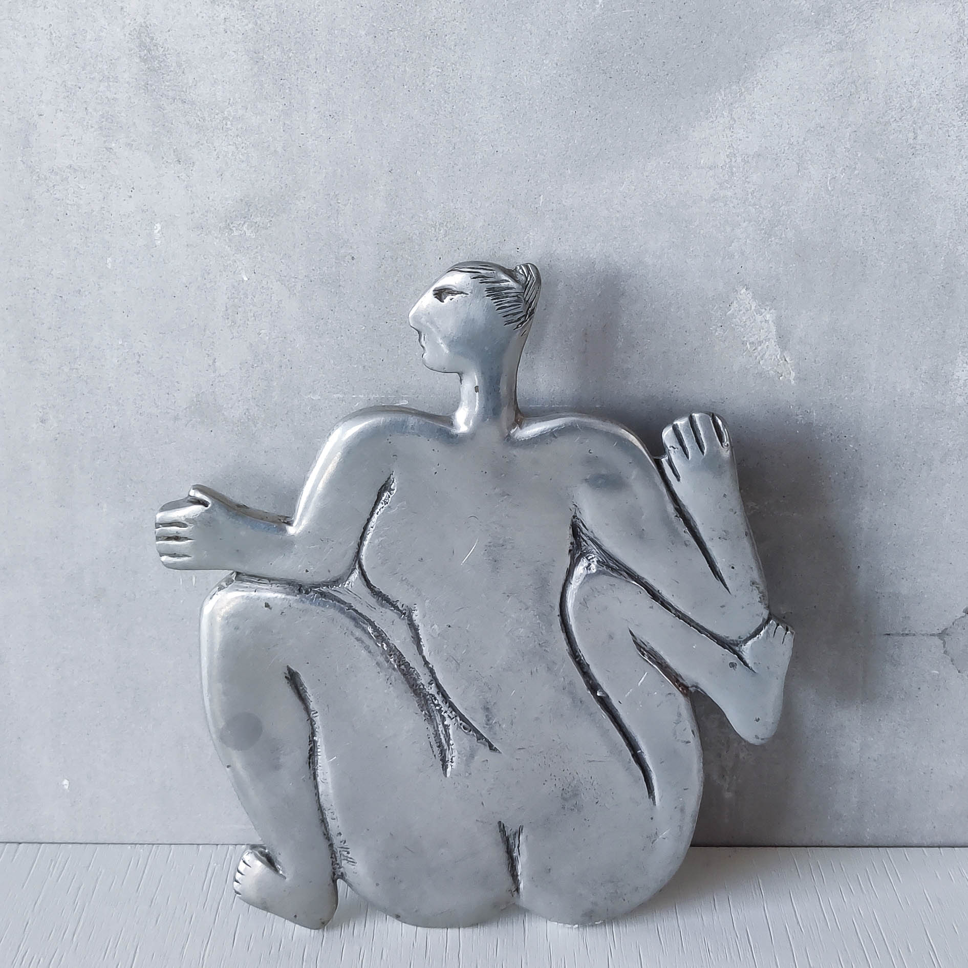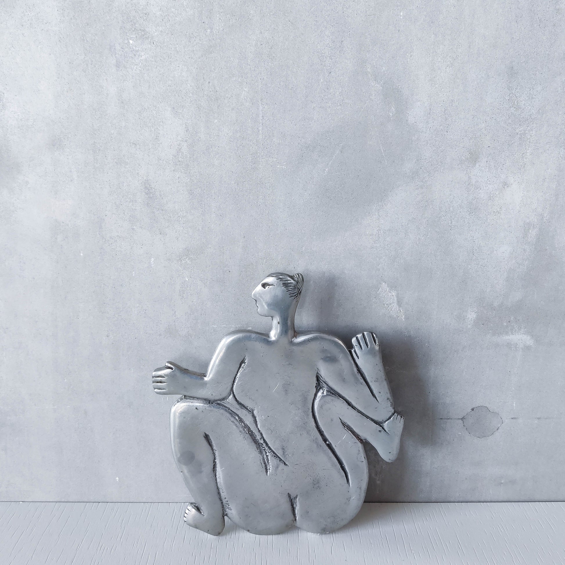 A wonderful early Carrol Boyes 'functional art' sculptural cast pewter stylised figure trivet with incised lines and tool marks. Great hands and feet! Quite chunky with 3 cast legs (which have rubber covers). Please see photos and condition description.