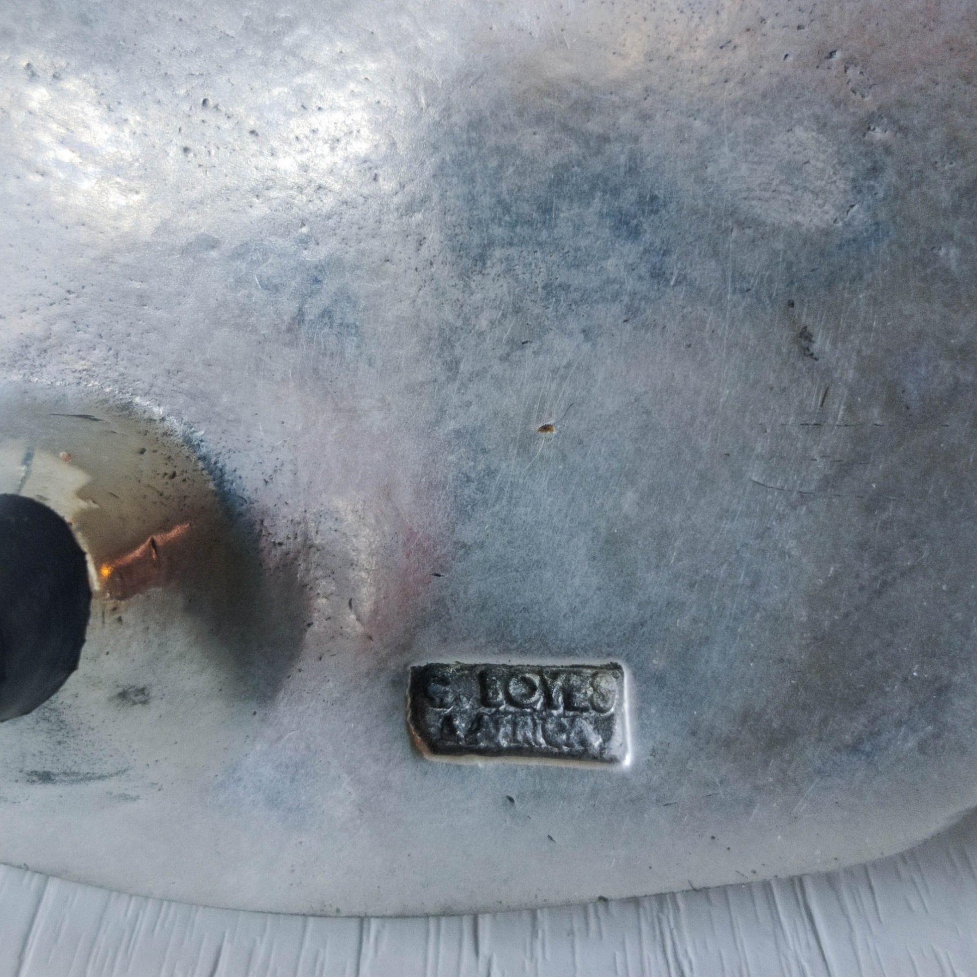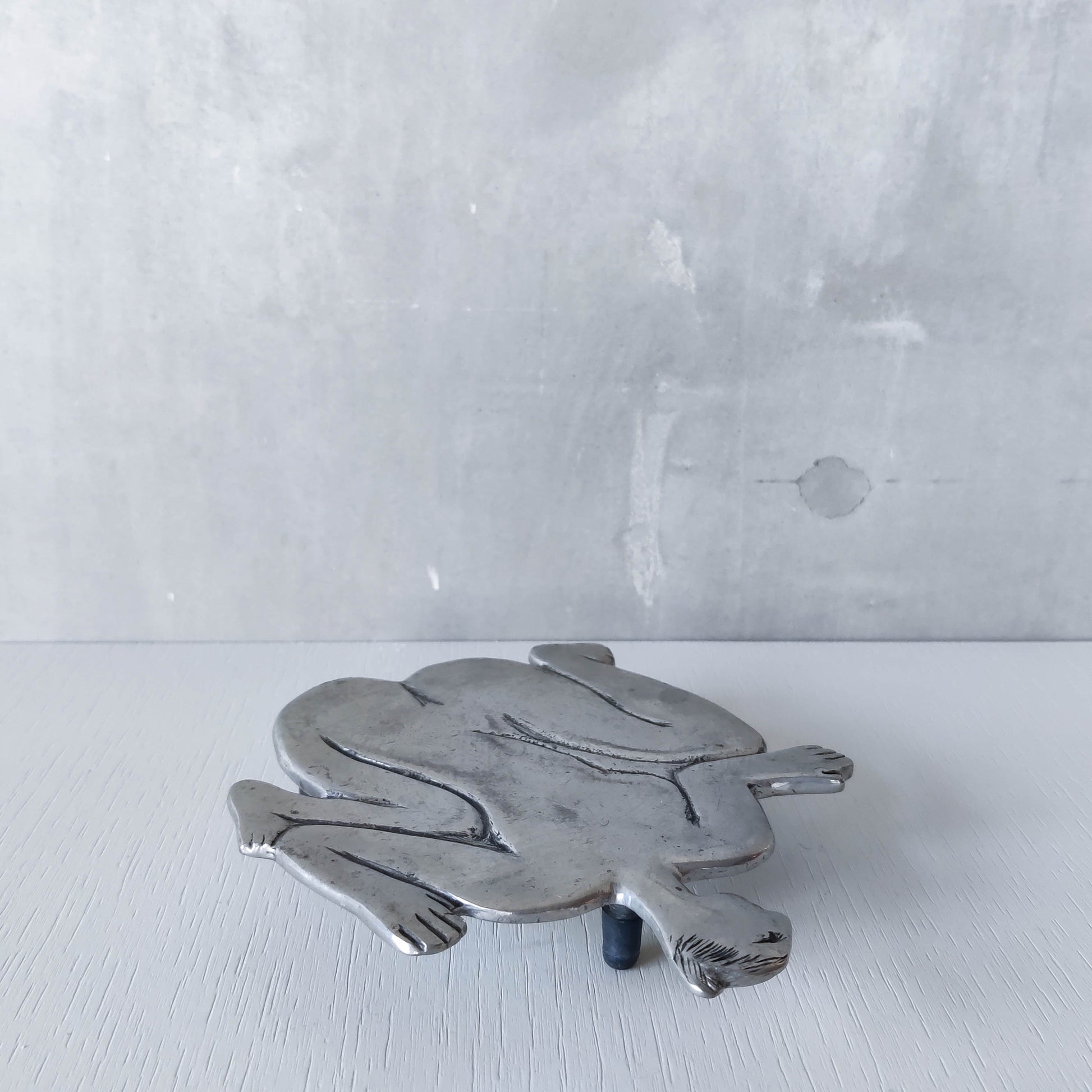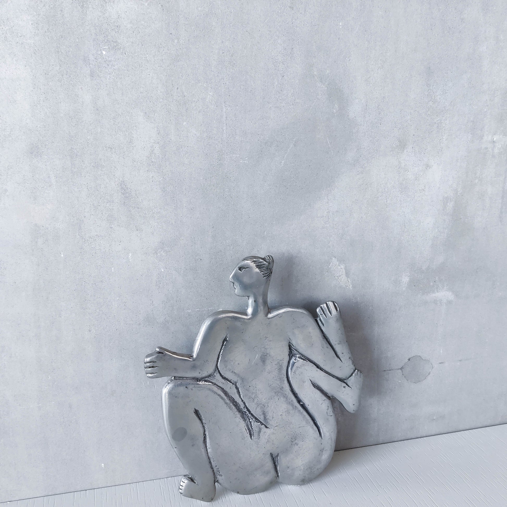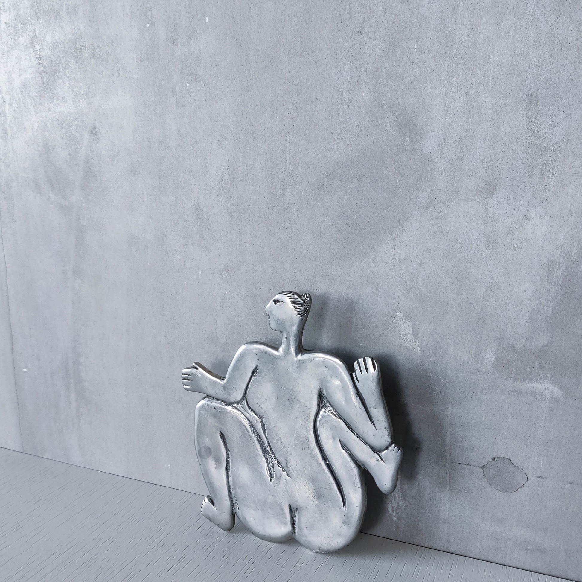 A wonderful early Carrol Boyes 'functional art' sculptural cast pewter stylised figure trivet with incised lines and tool marks. Great hands and feet! Quite chunky with 3 cast legs (which have rubber covers). Please see photos and condition description.