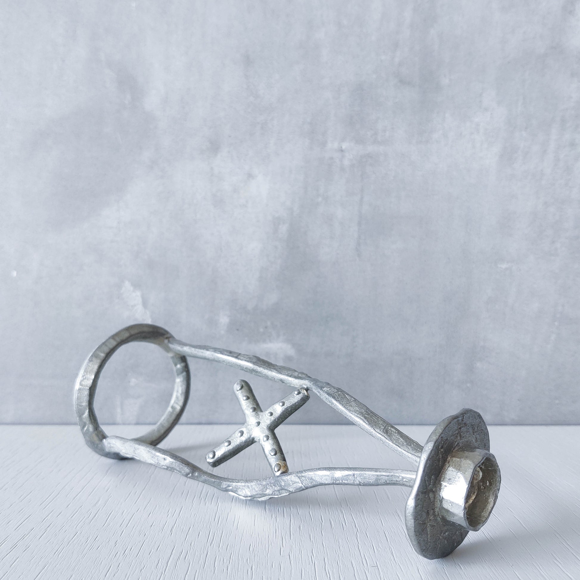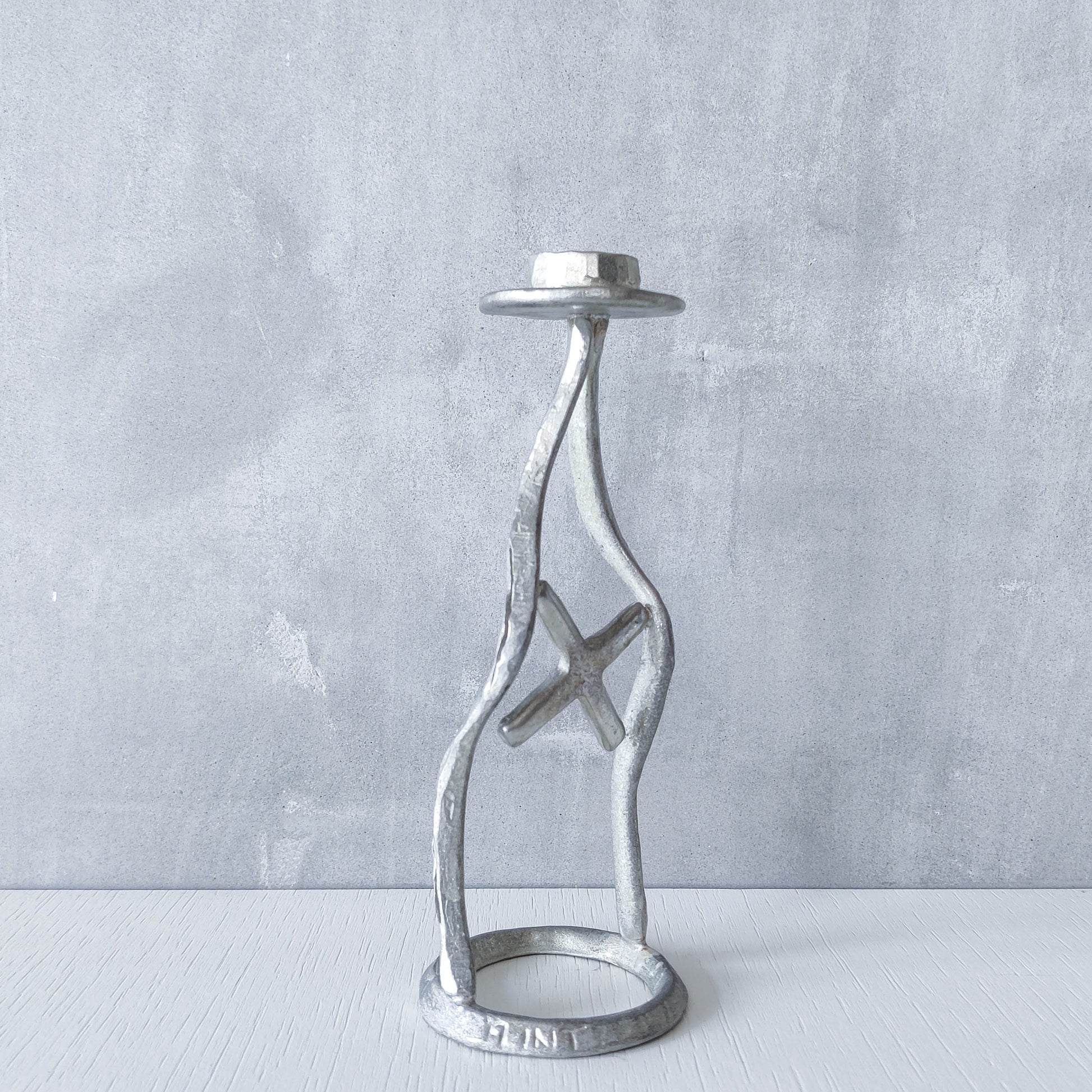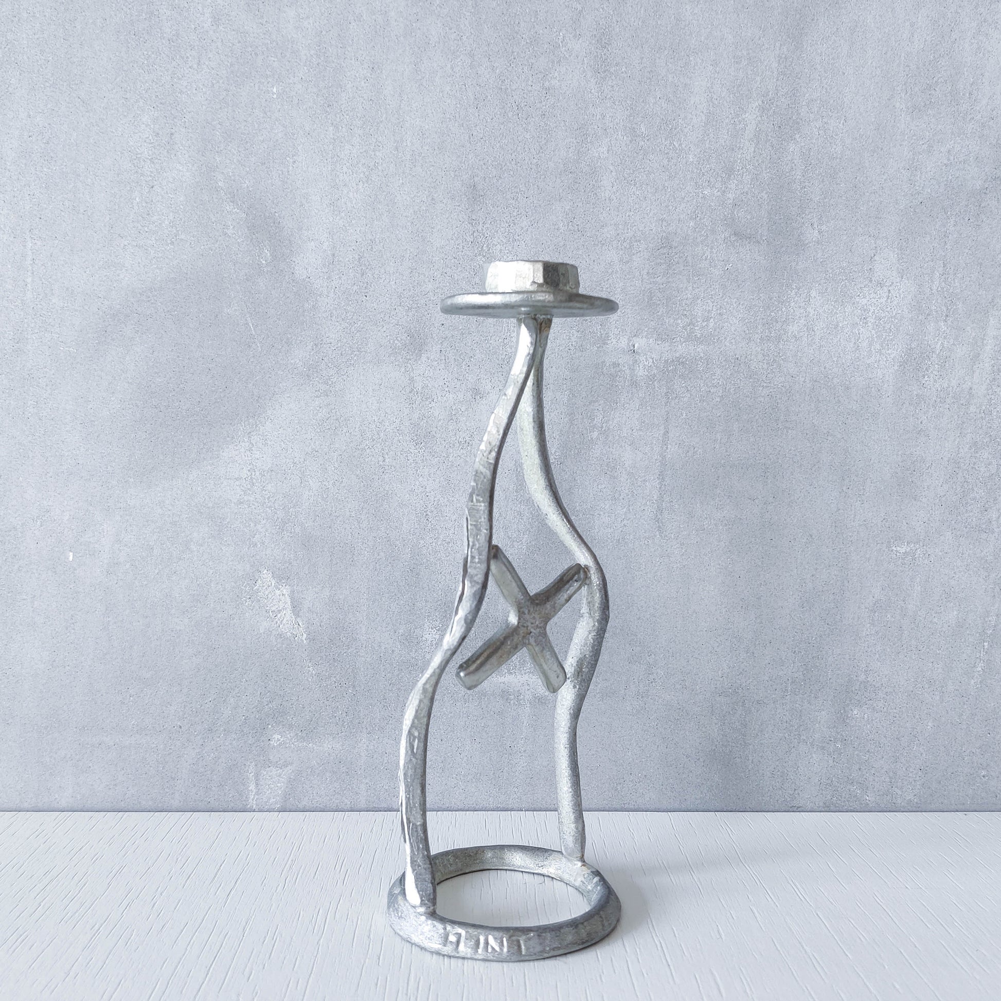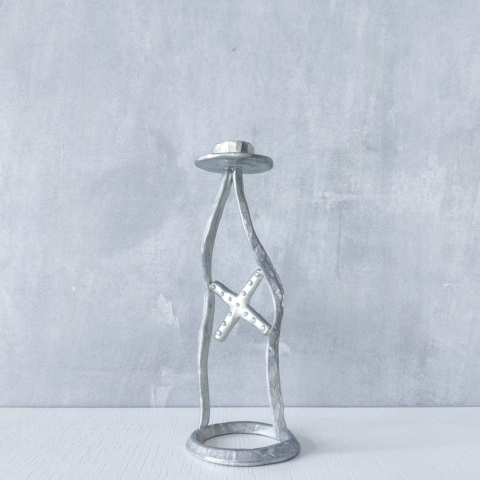 Vintage hand sand cast aluminium artisan sculpted metal cross wavy candlestick