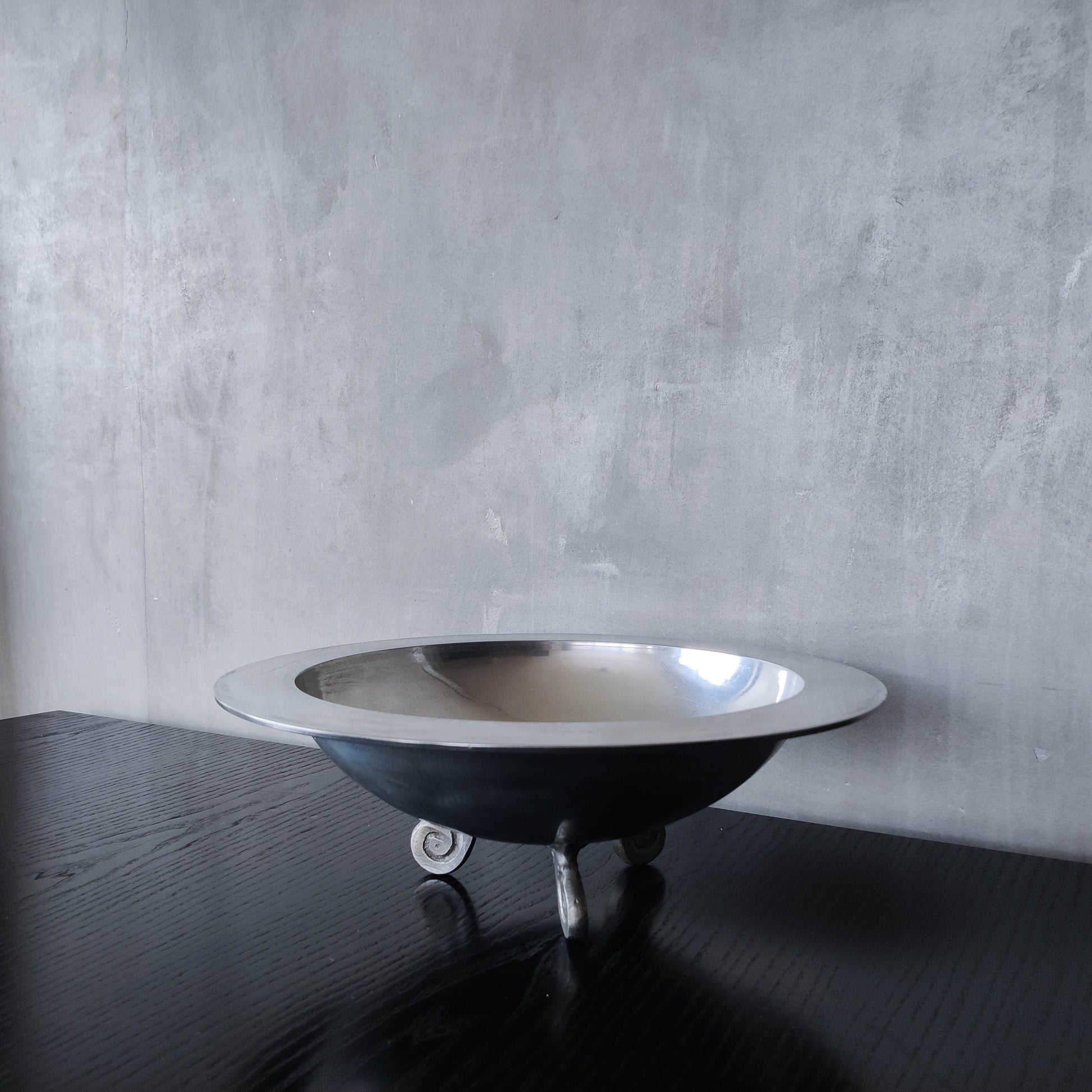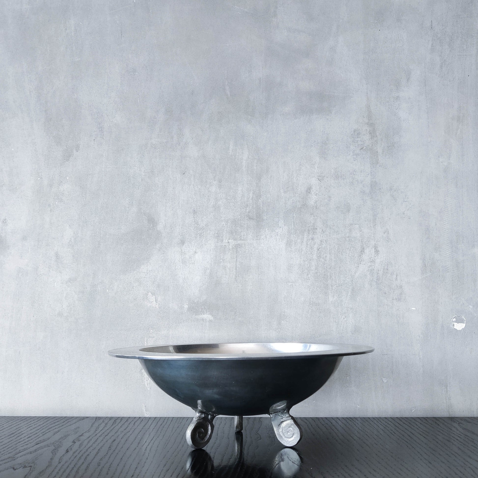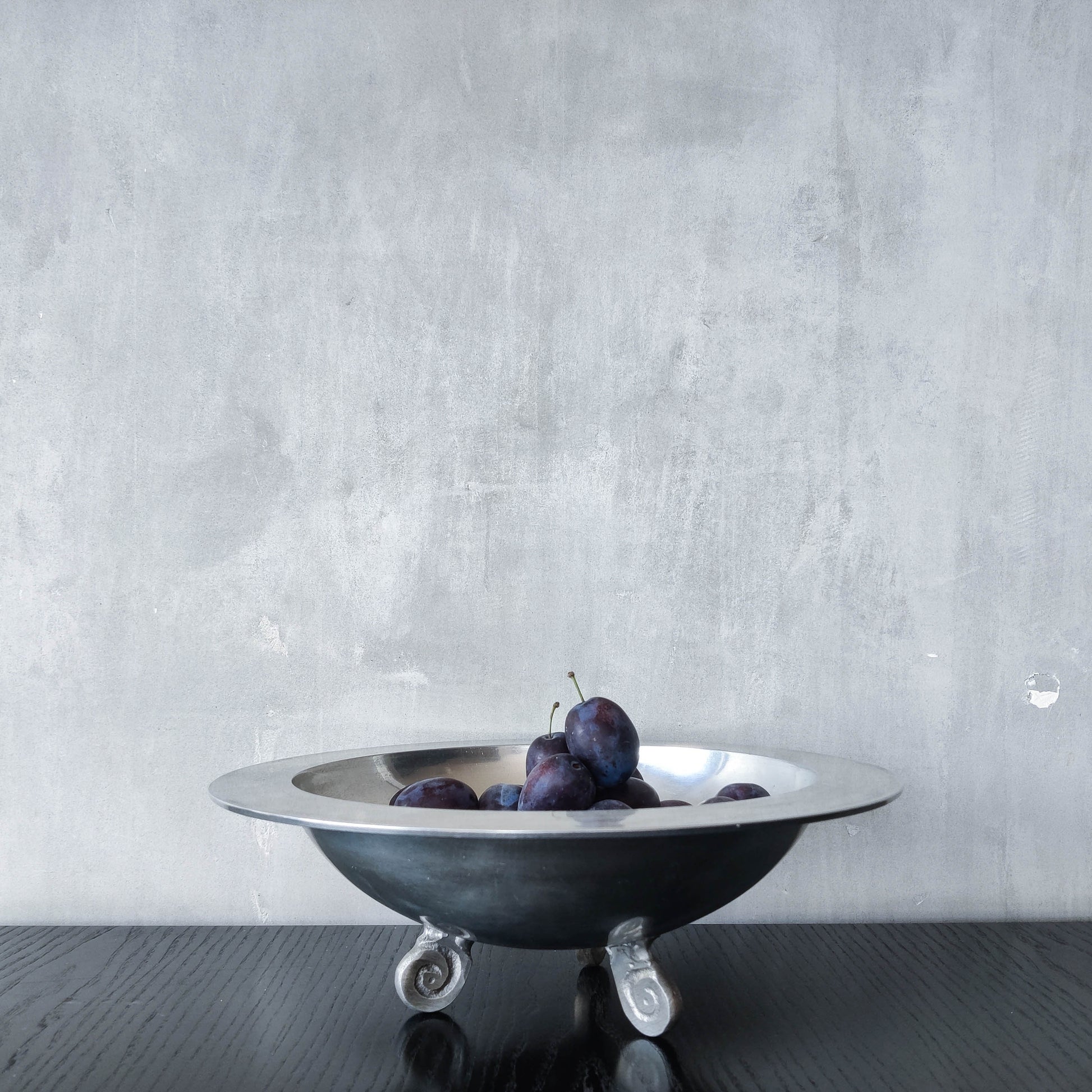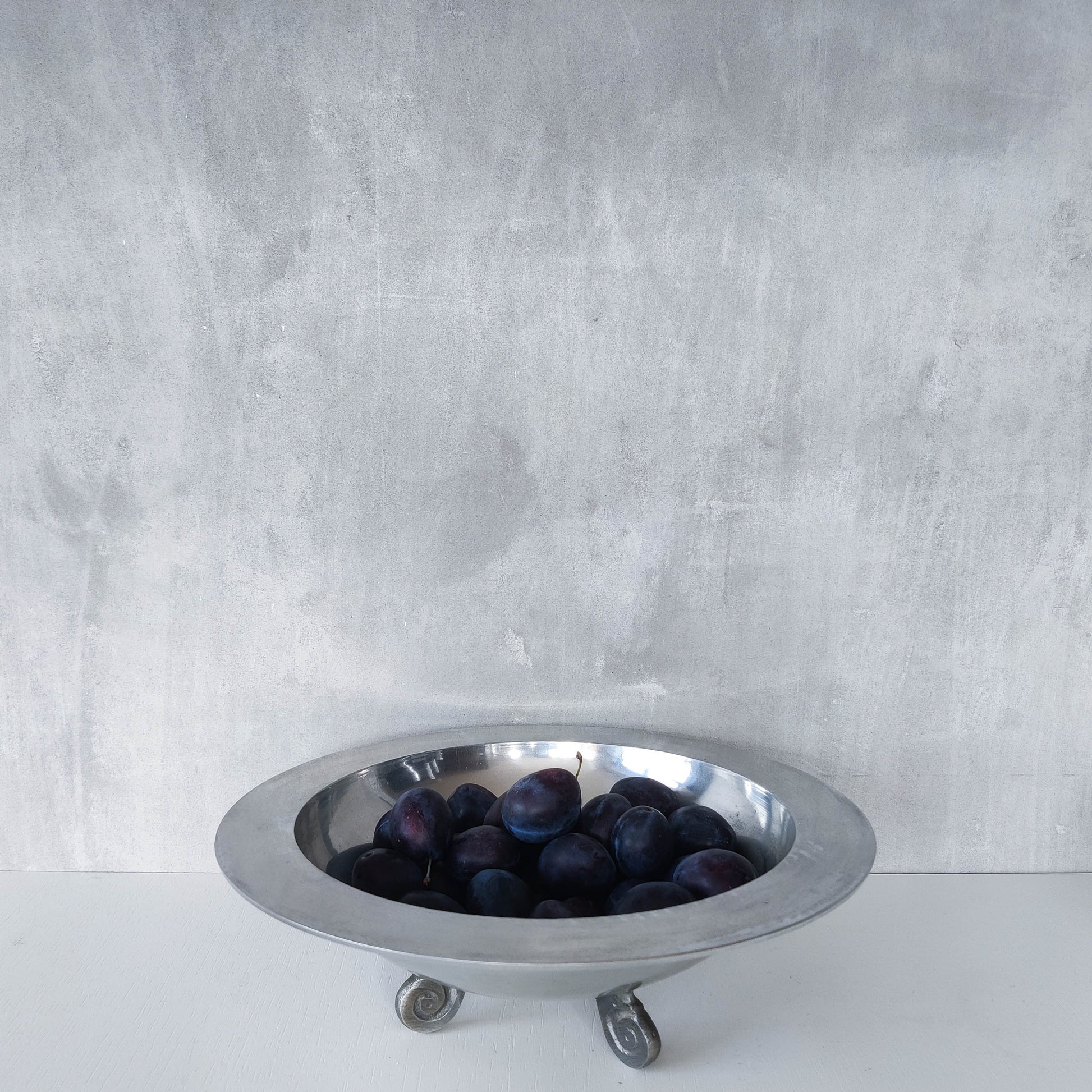 Sculptural cast aluminium spiral three footed fruit bowl/centerpiece. Age unknown. Sculptural hand cast and inscribed spiral feet, welded with a slightly raw finish. Plums for scale. Please see photos and condition description.