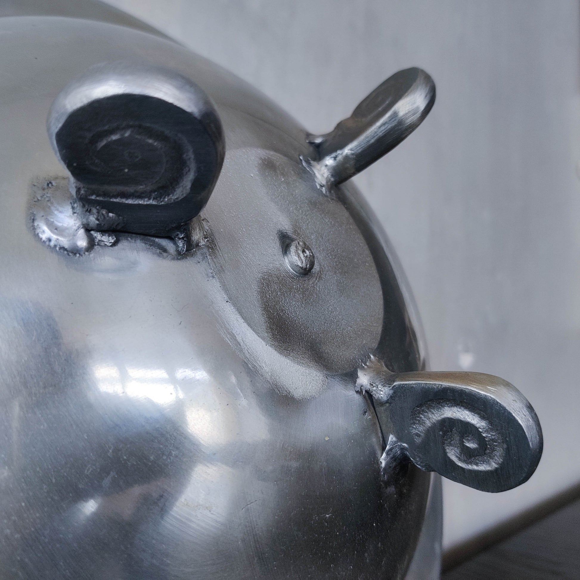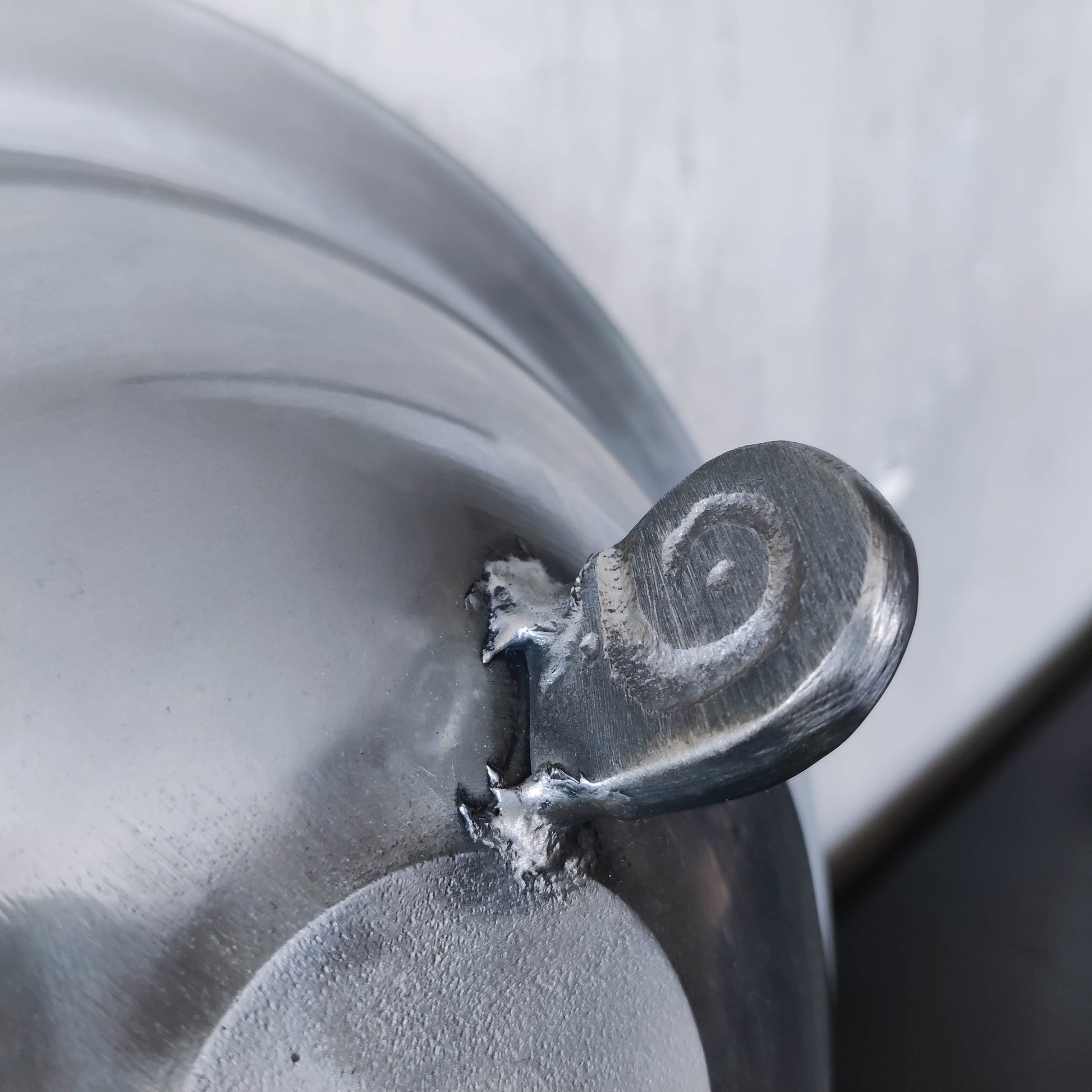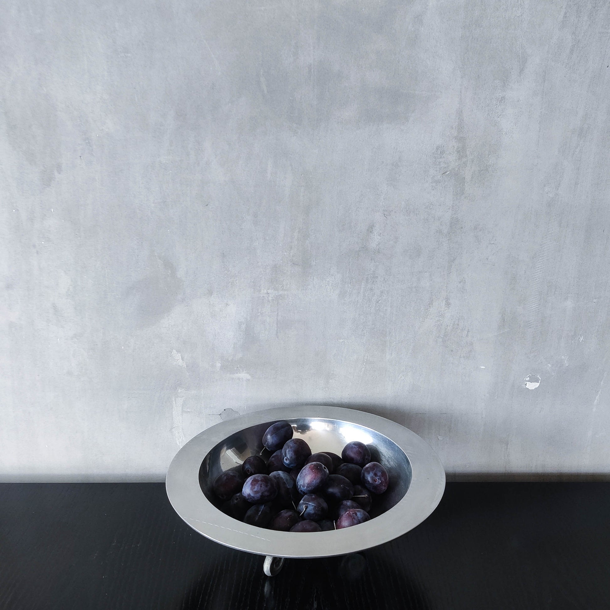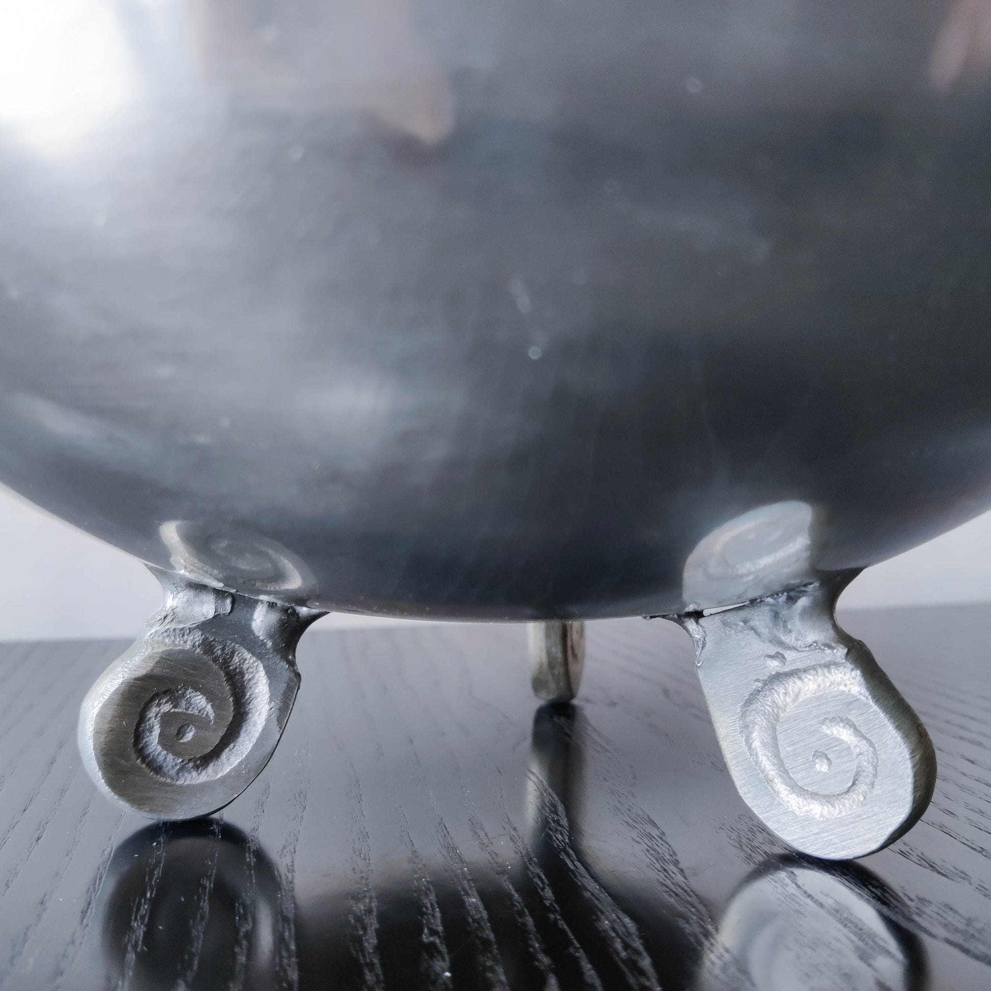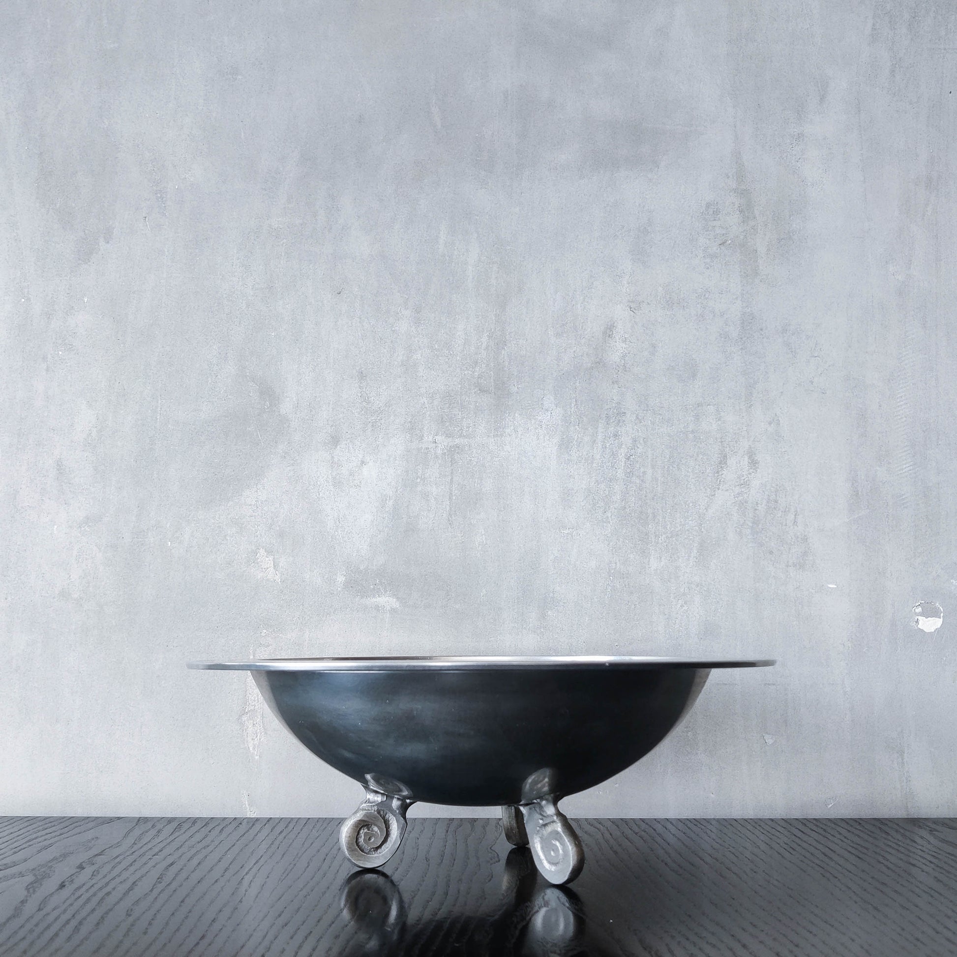 Sculptural cast aluminium spiral three footed fruit bowl/centerpiece. Age unknown. Sculptural hand cast and inscribed spiral feet, welded with a slightly raw finish. Plums for scale. Please see photos and condition description.