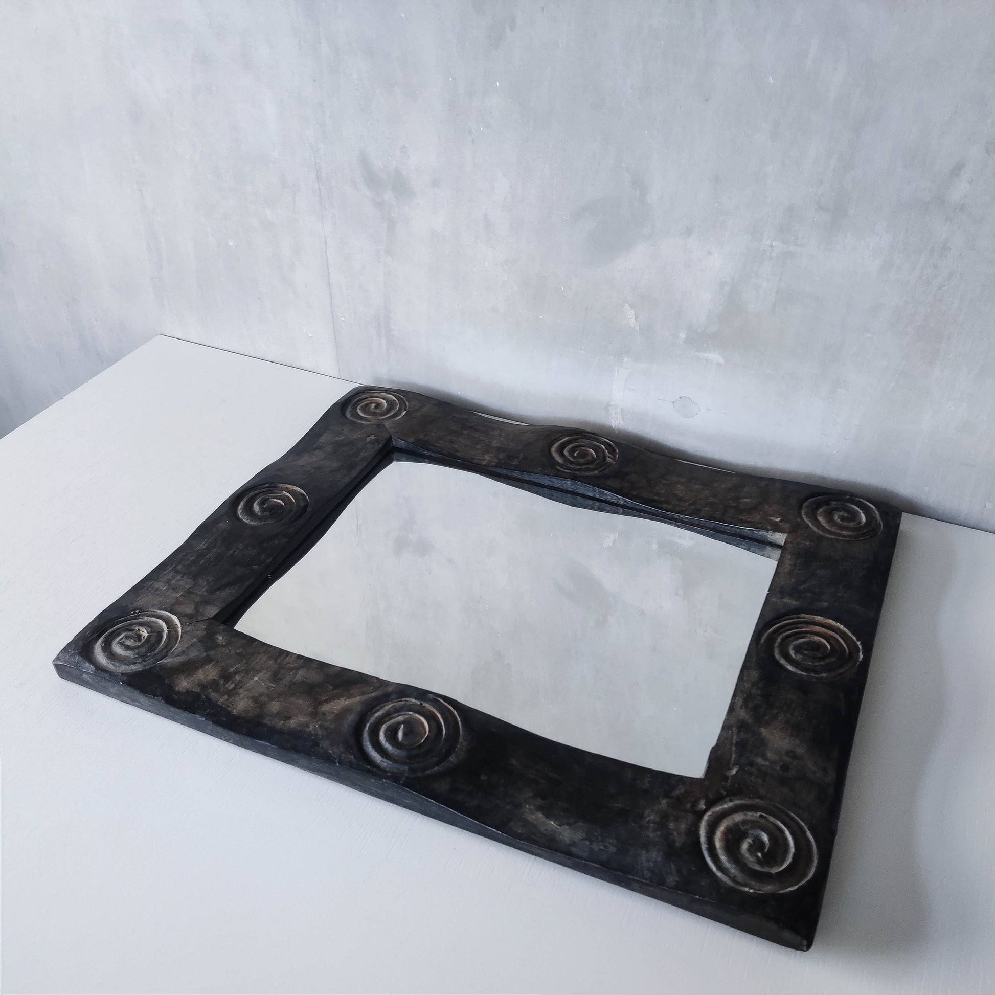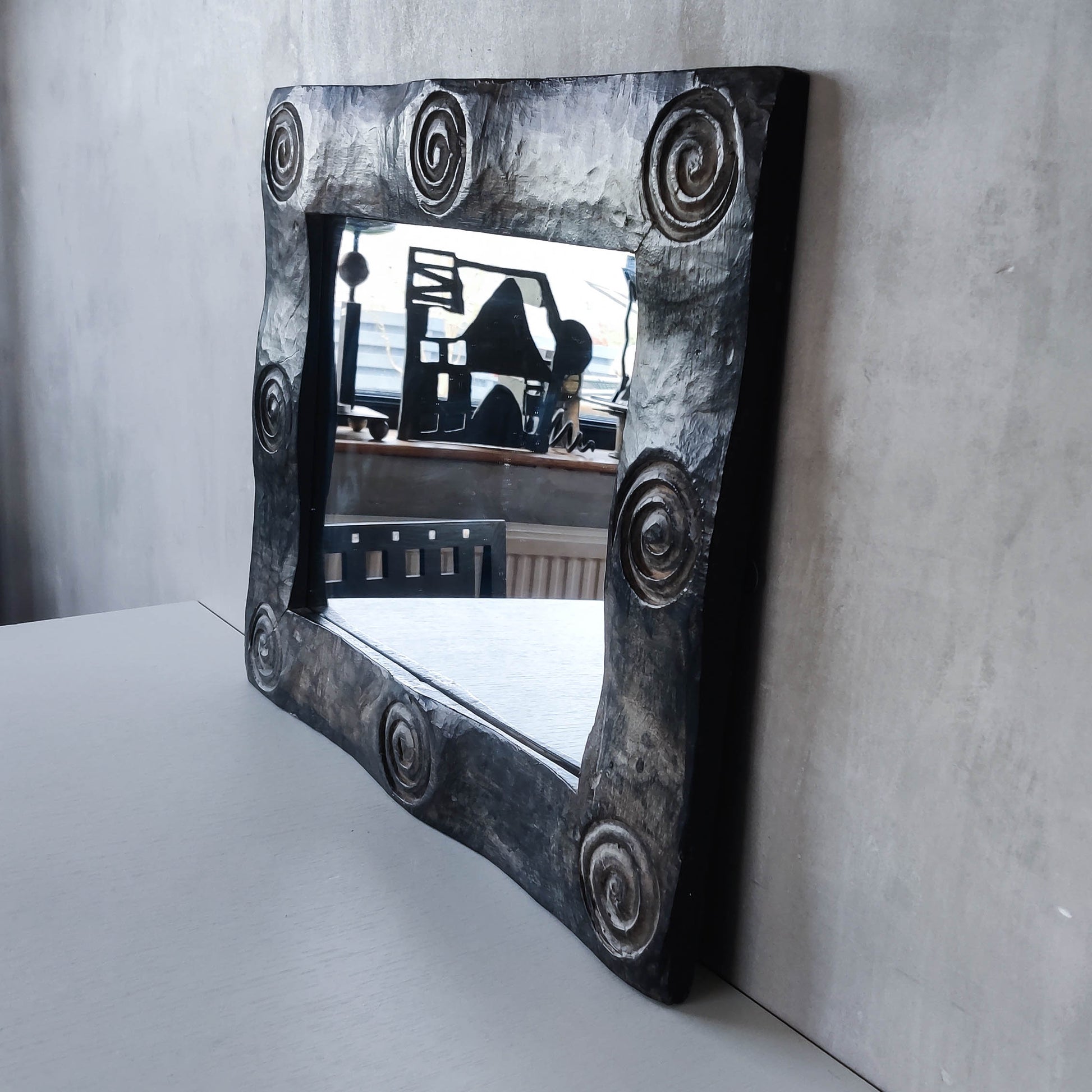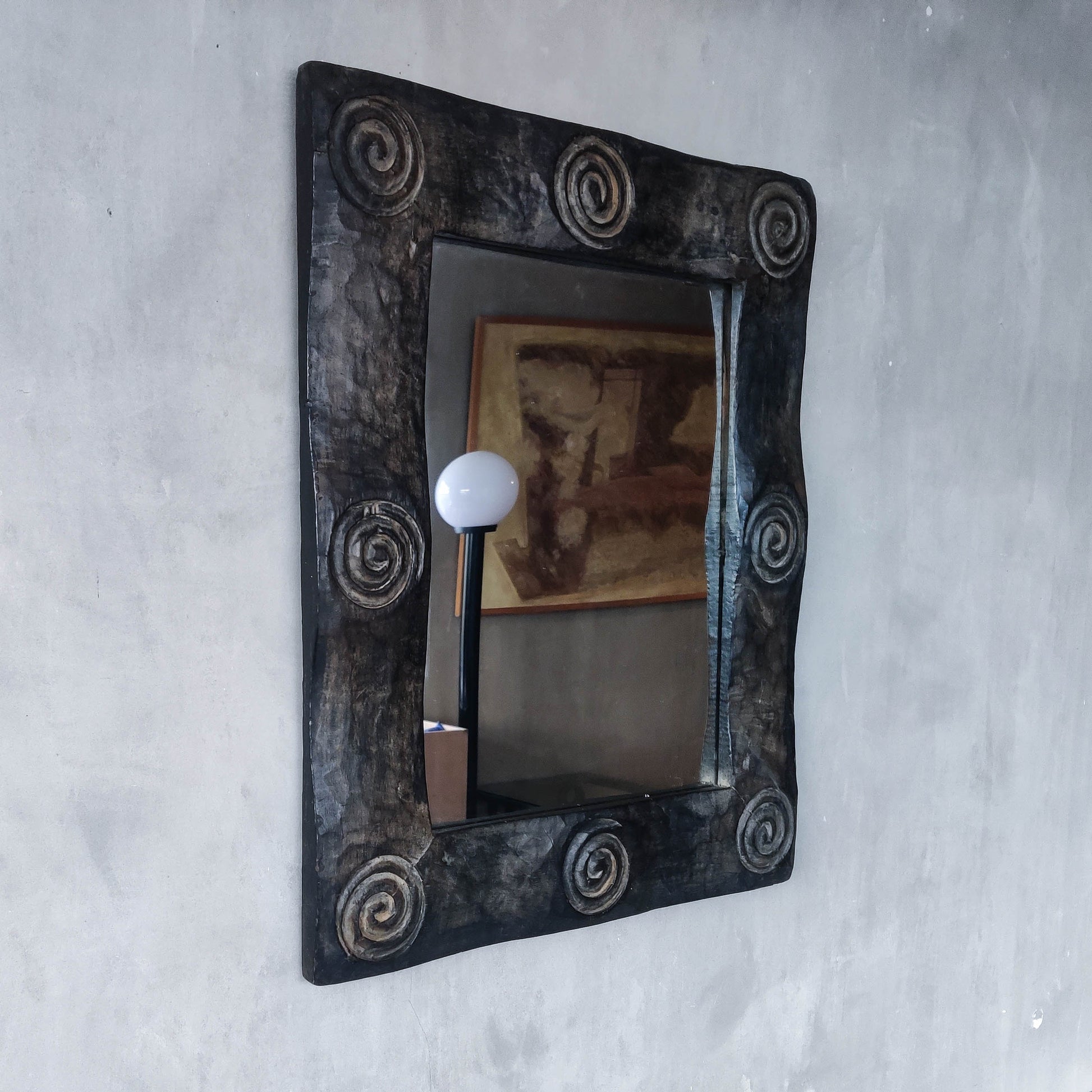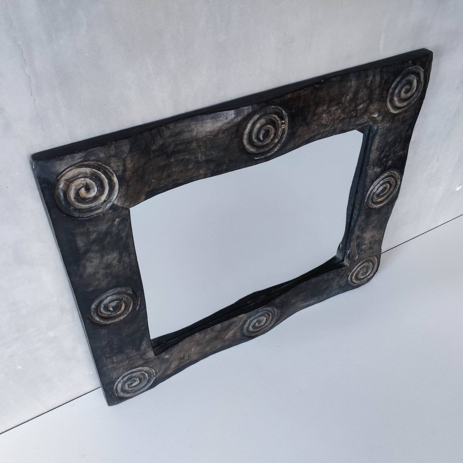 Solid wood recent vintage (exact age unknown) sculptural chunky hardwood hand carved mirror with undulating form and carved sprial motifs and tool marks. Please see photos and condition description.
