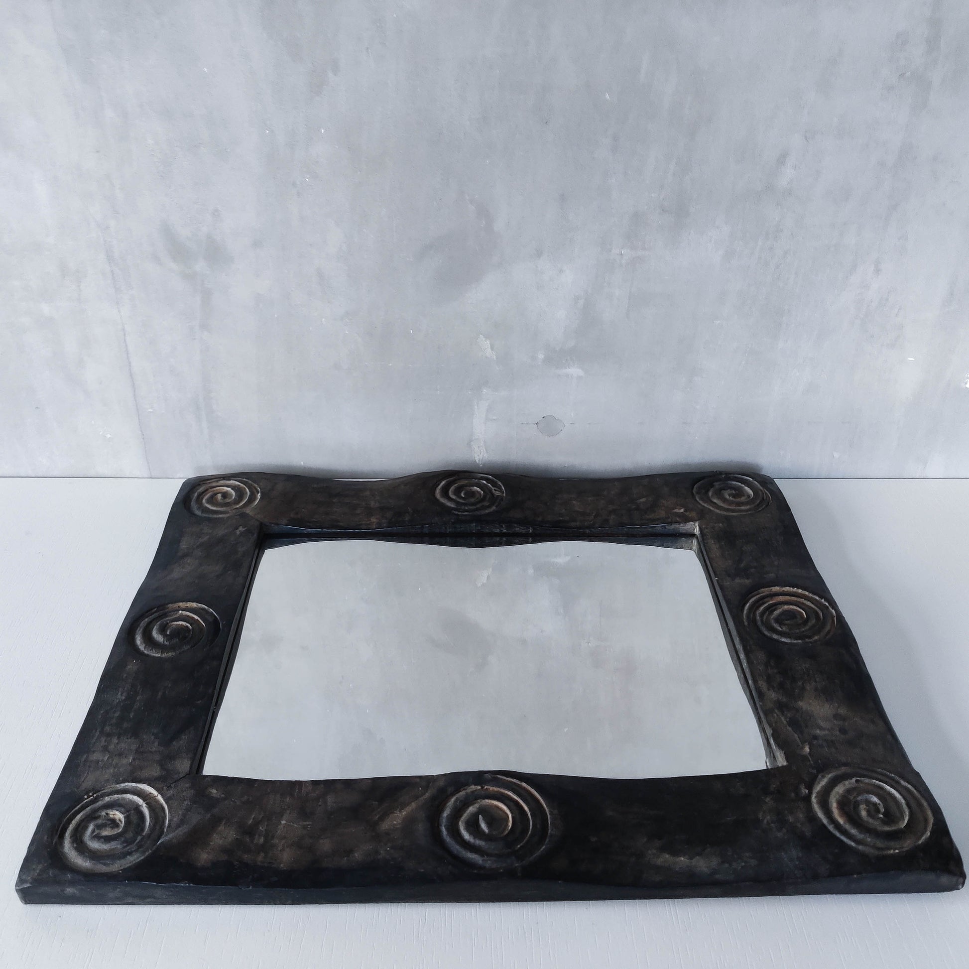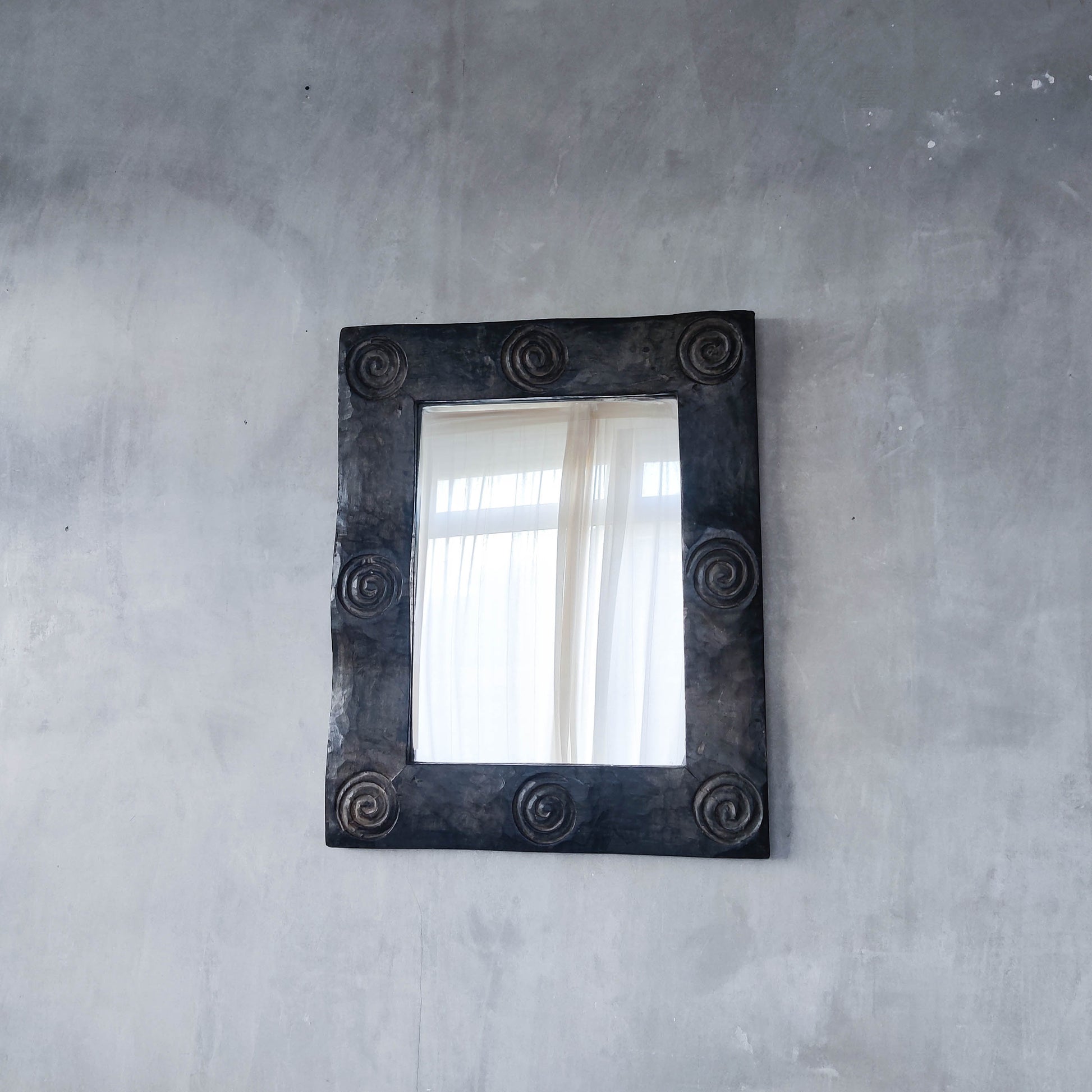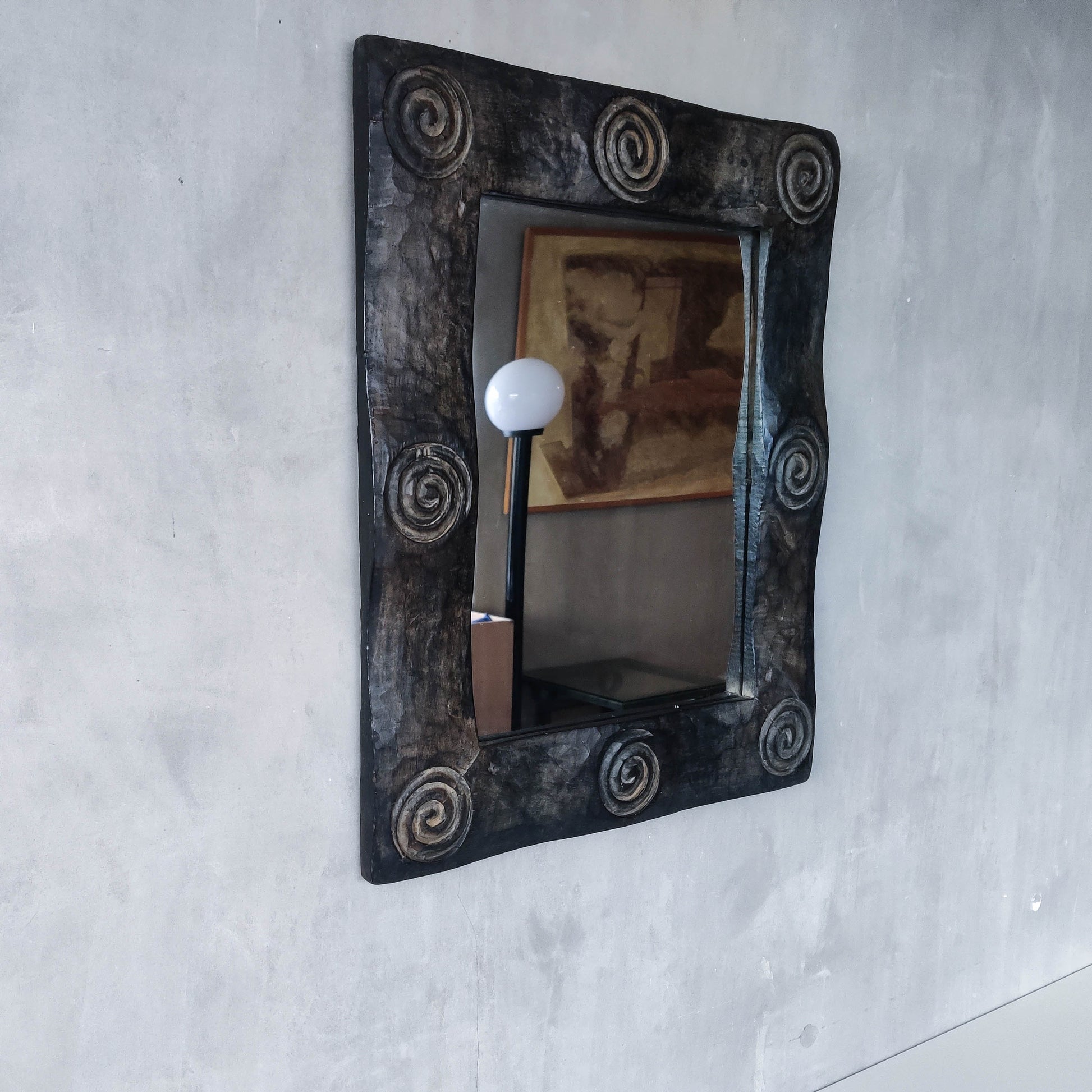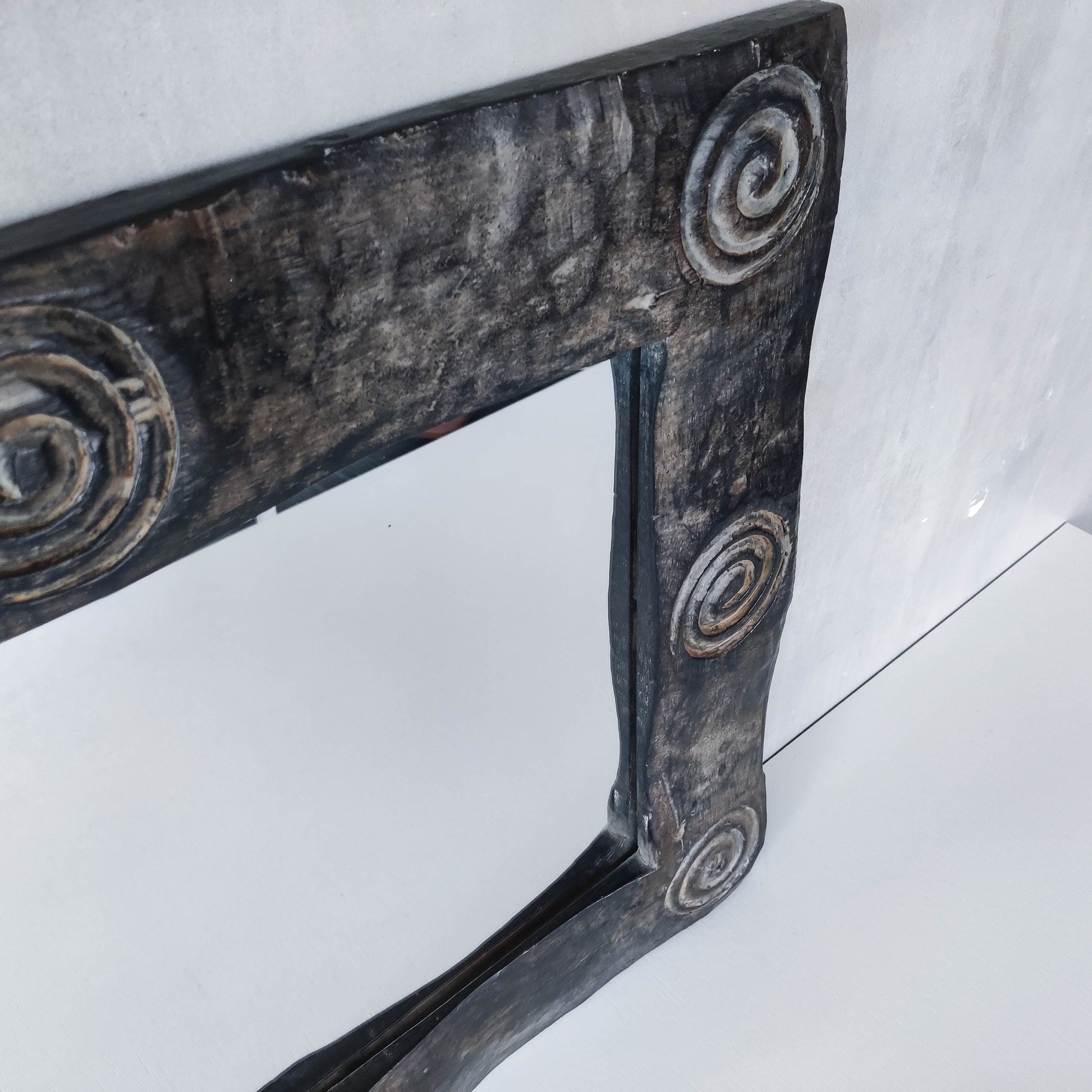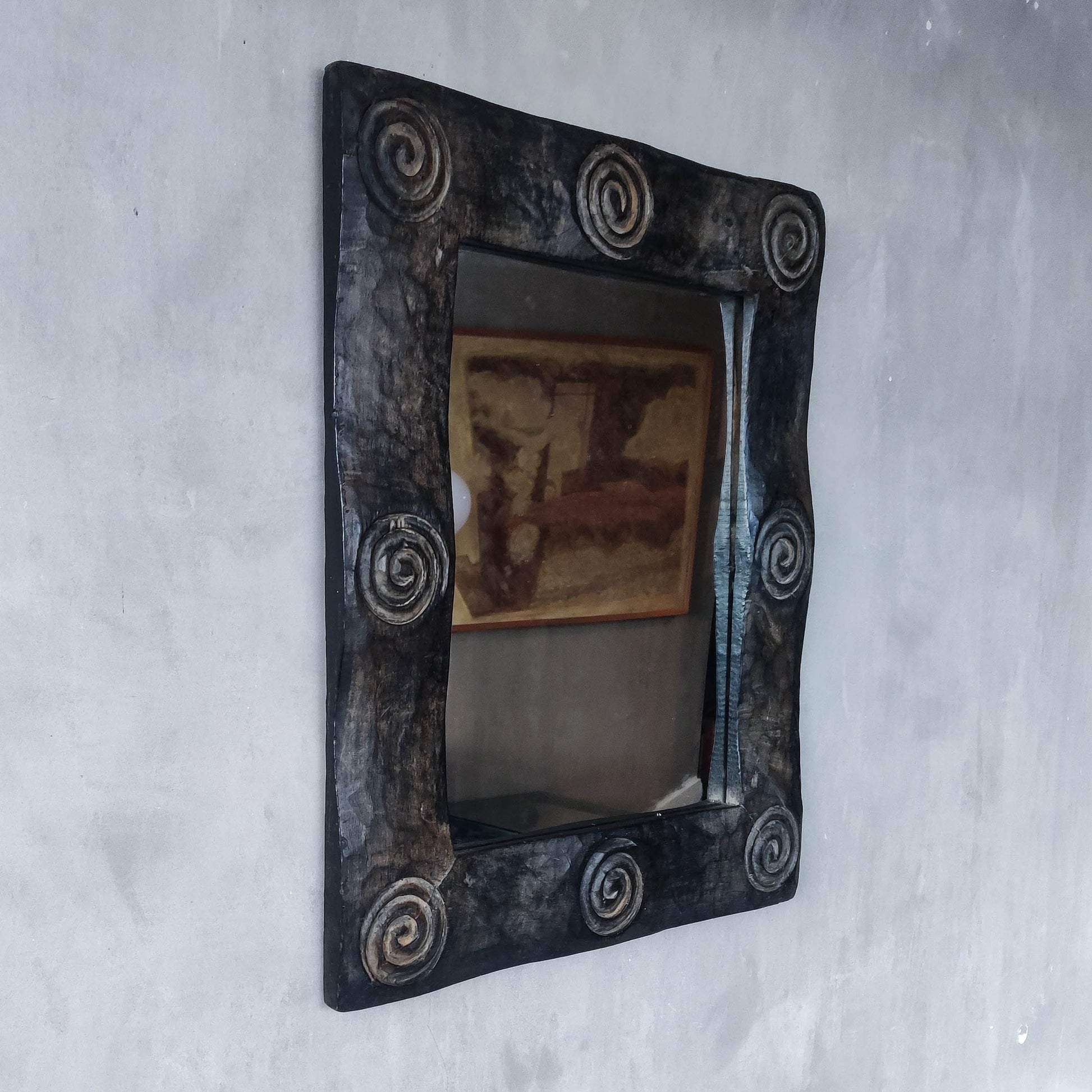 Solid wood recent vintage (exact age unknown) sculptural chunky hardwood hand carved mirror with undulating form and carved sprial motifs and tool marks. Please see photos and condition description.