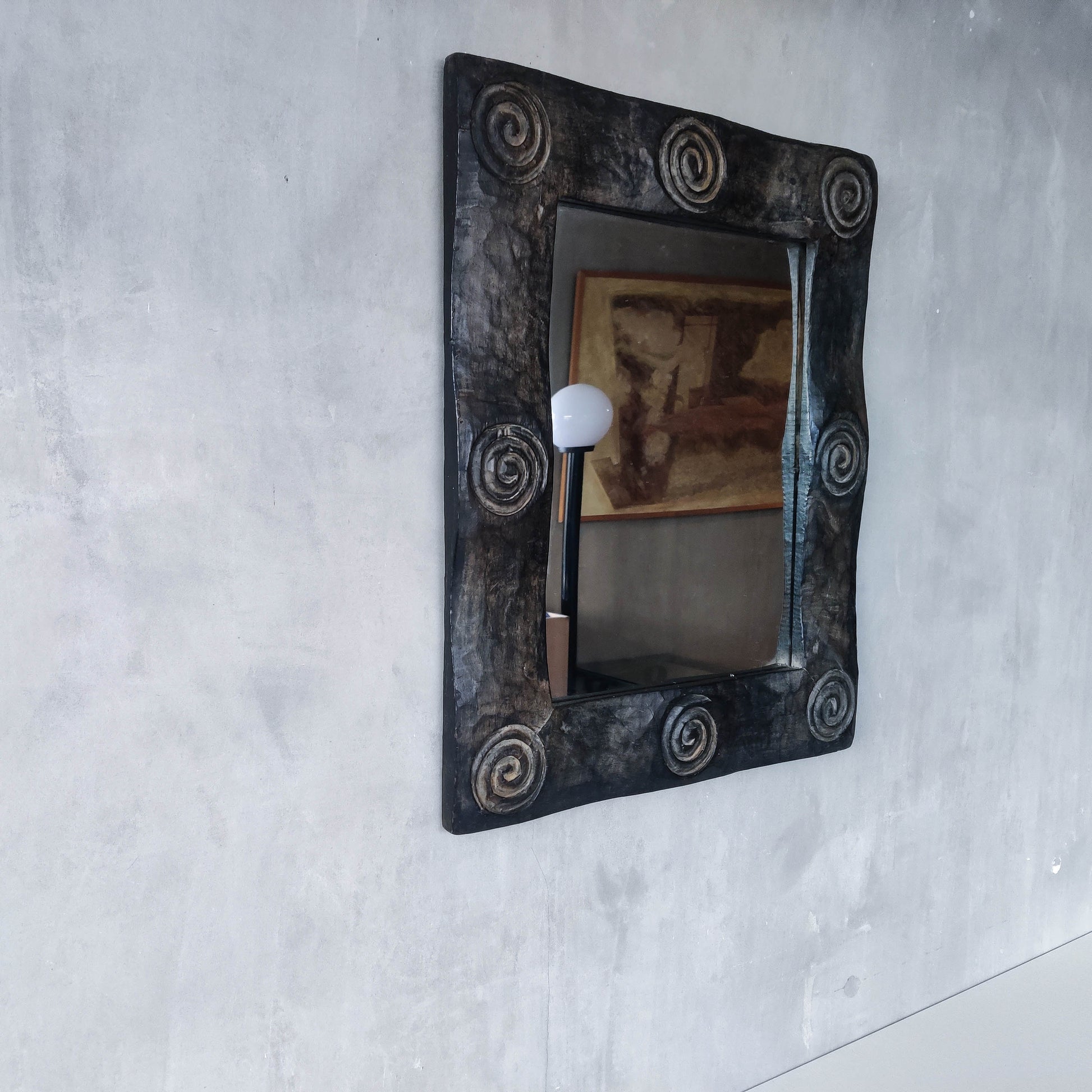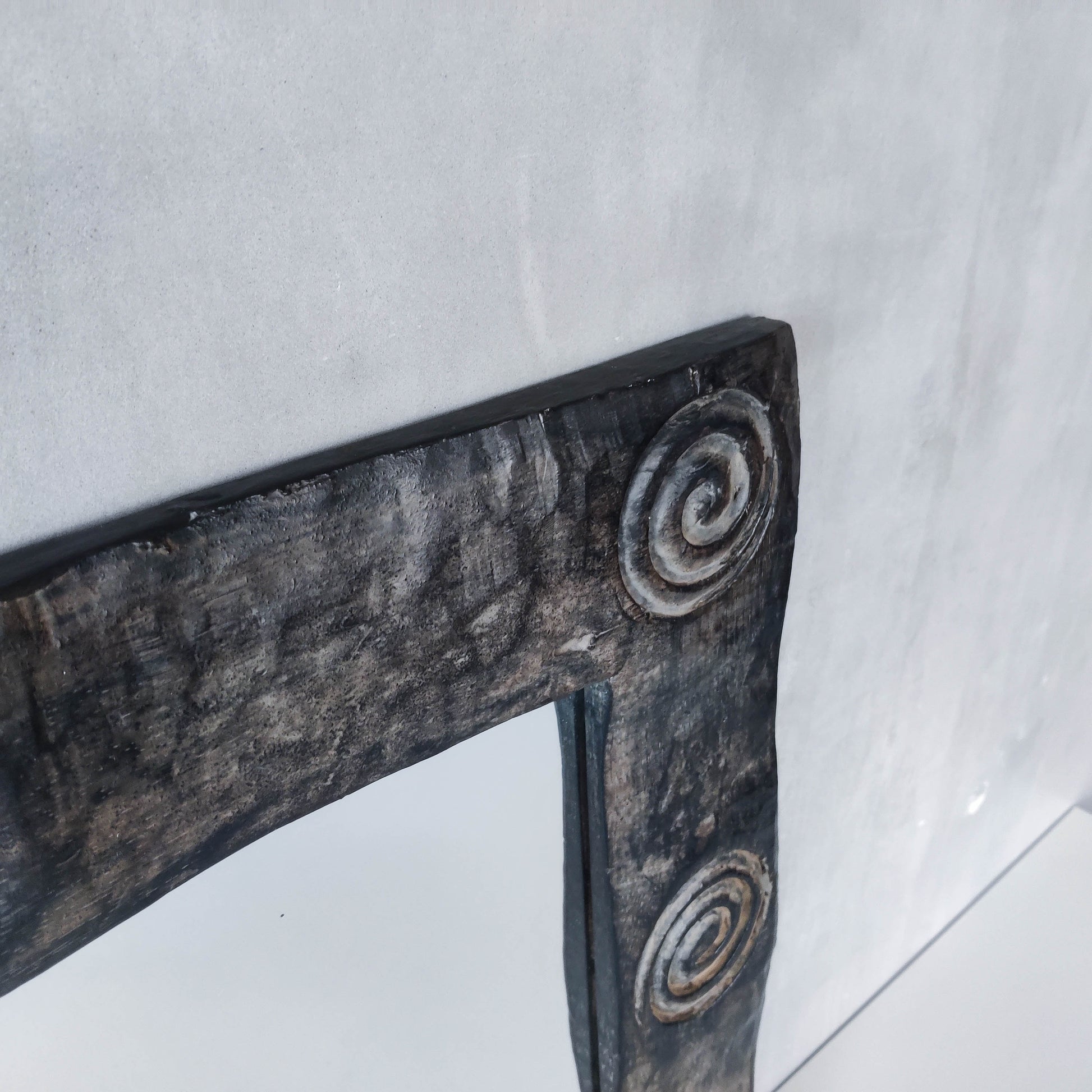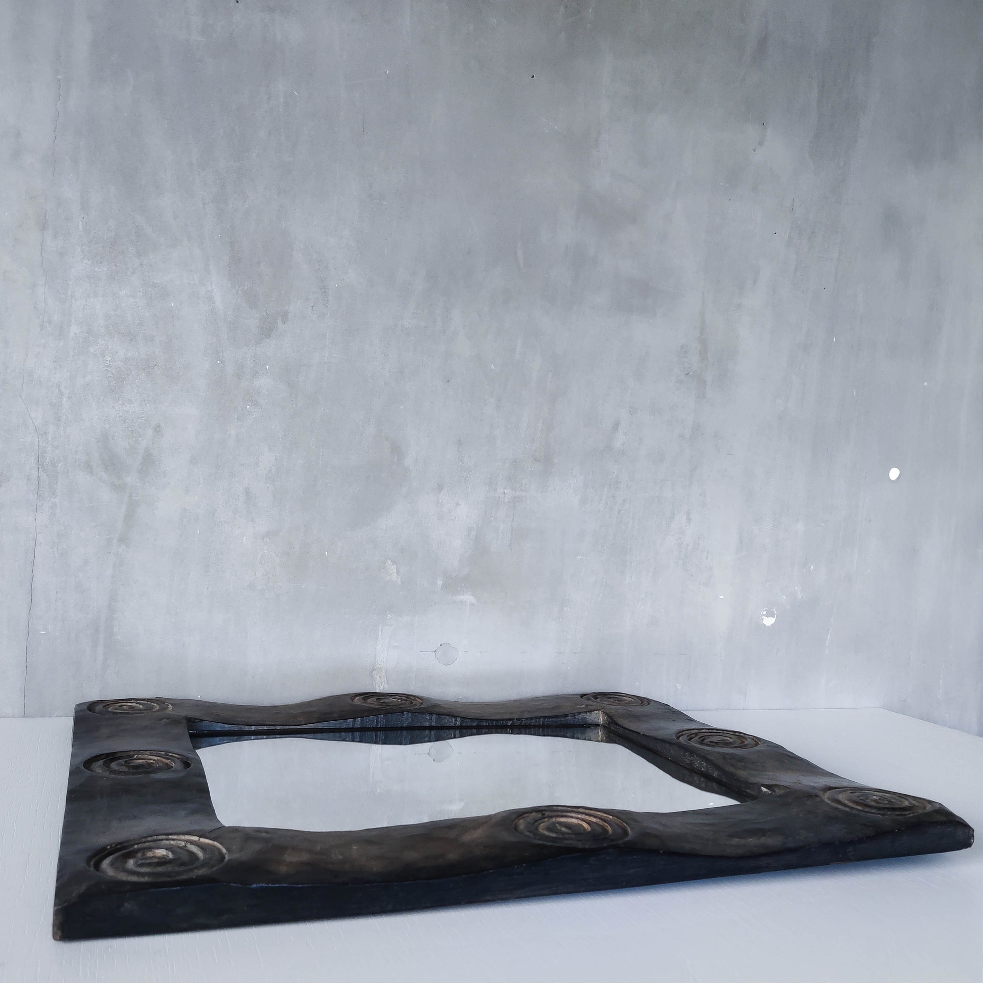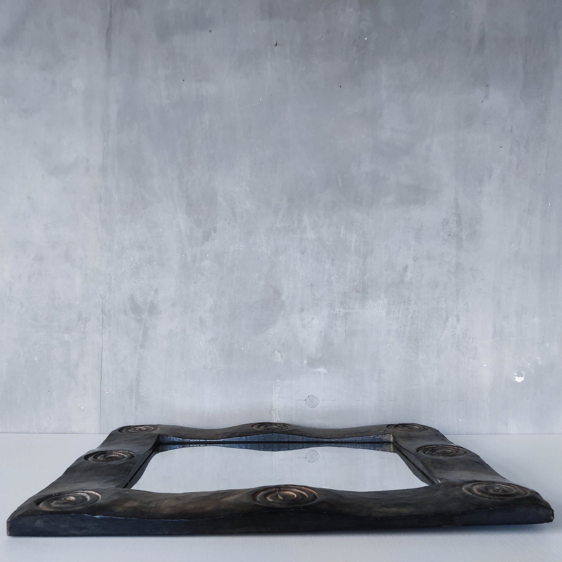 Solid wood recent vintage (exact age unknown) sculptural chunky hardwood hand carved mirror with undulating form and carved sprial motifs and tool marks. Please see photos and condition description.