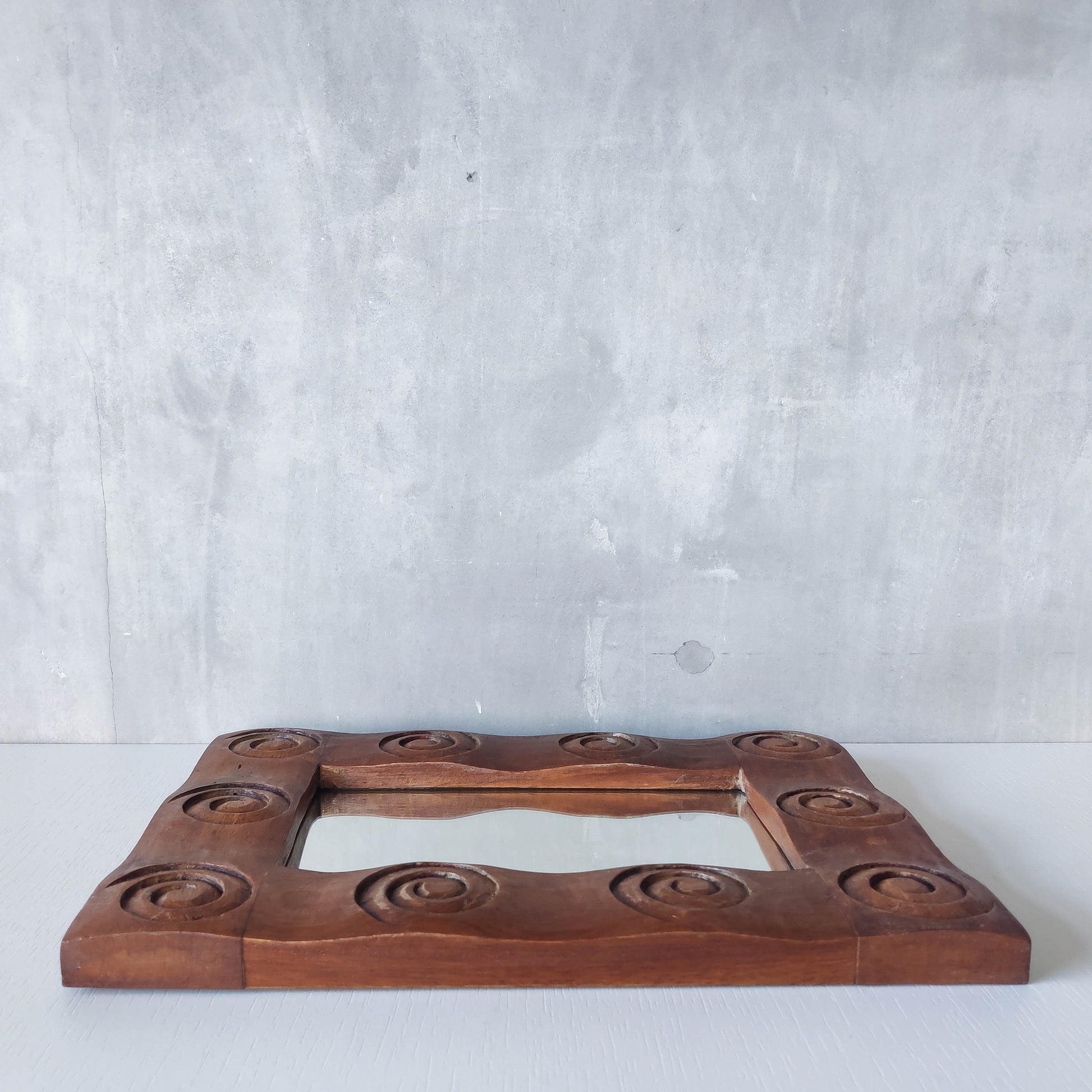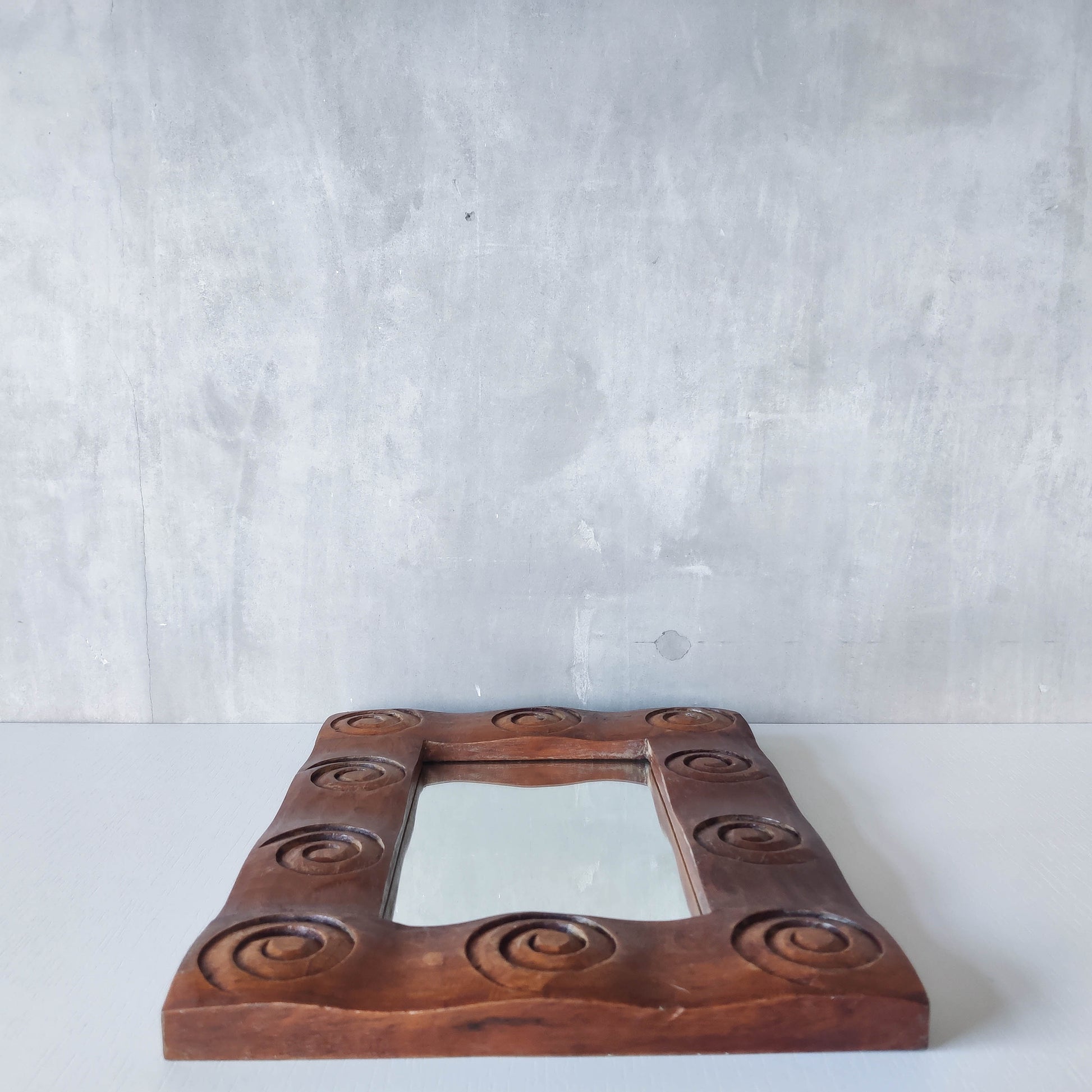 Solid wood recent vintage sculptural chunky hardwood hand carved mirror with undulating form and carved sprial motifs. Lovely colour. Please see photos and condition description.