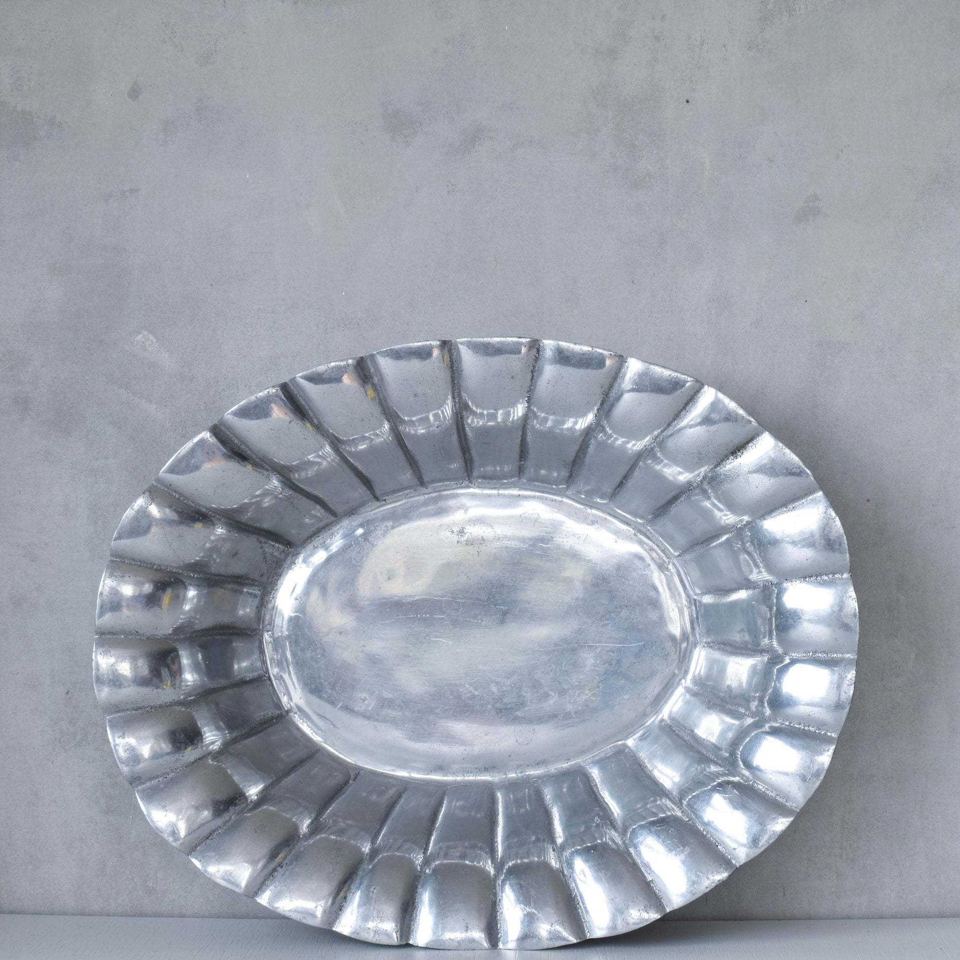 Wonderful large heavy hand sand cast aluminium made in Mexico scalloped fruit bowl/centerpiece.