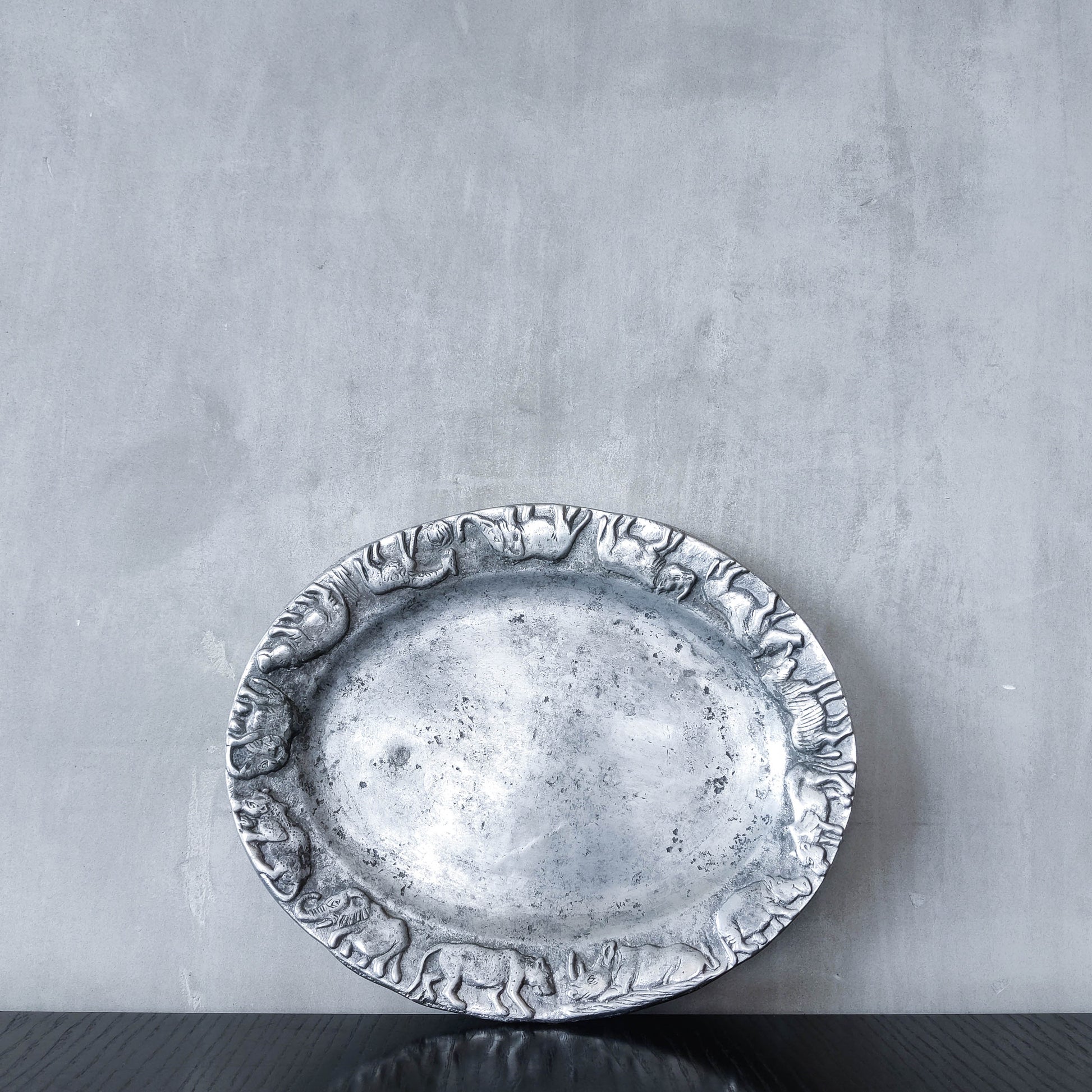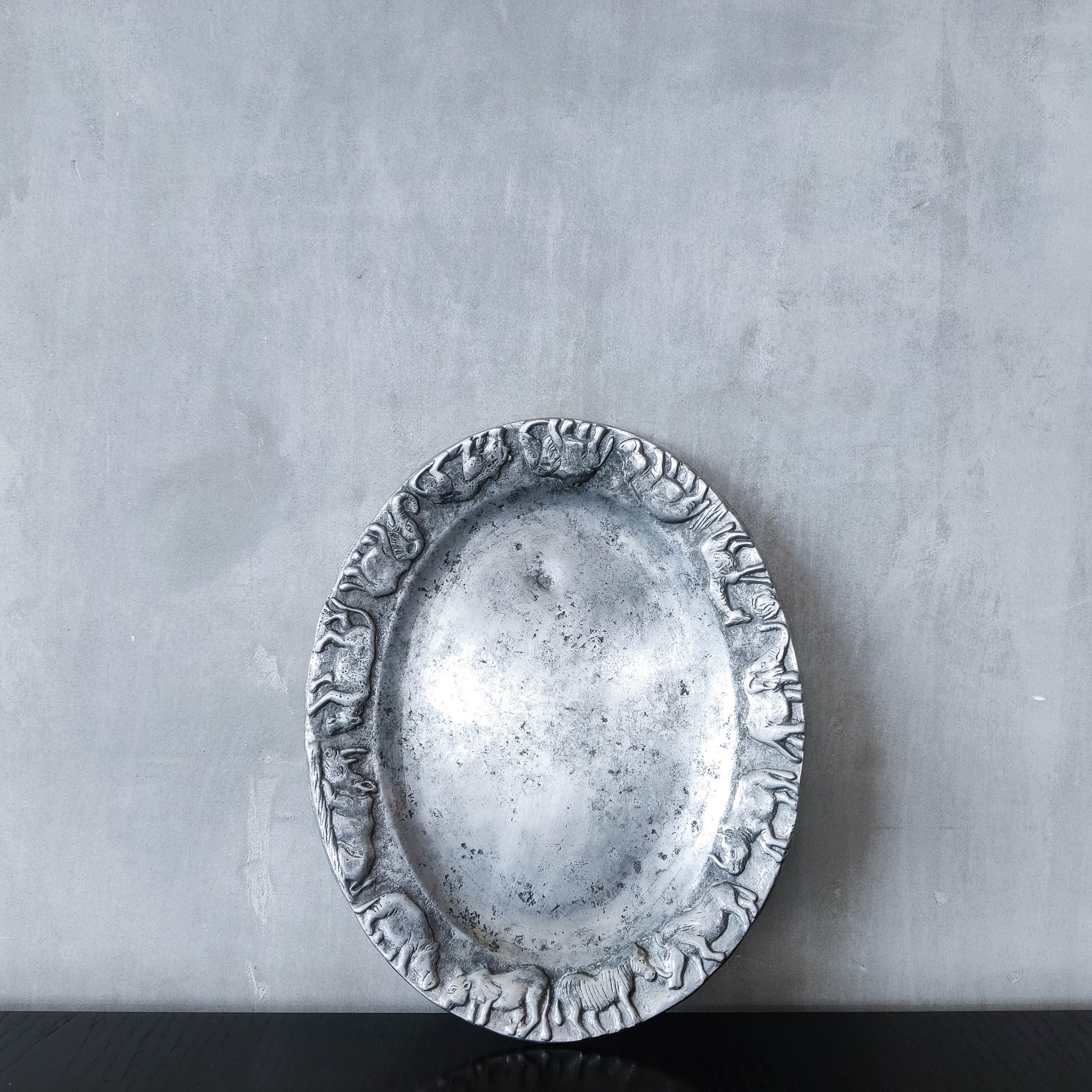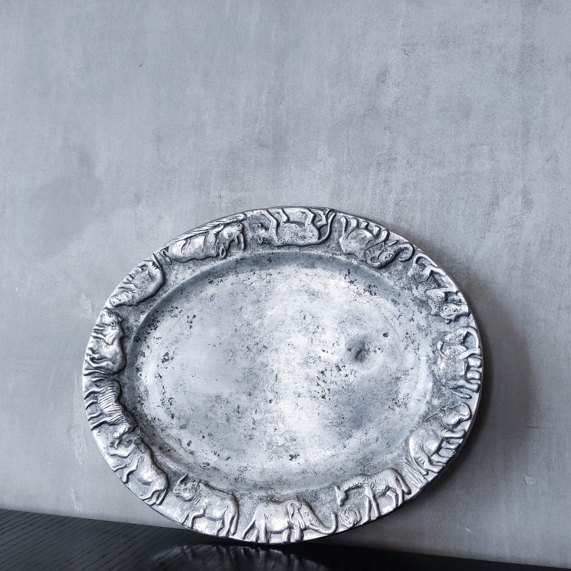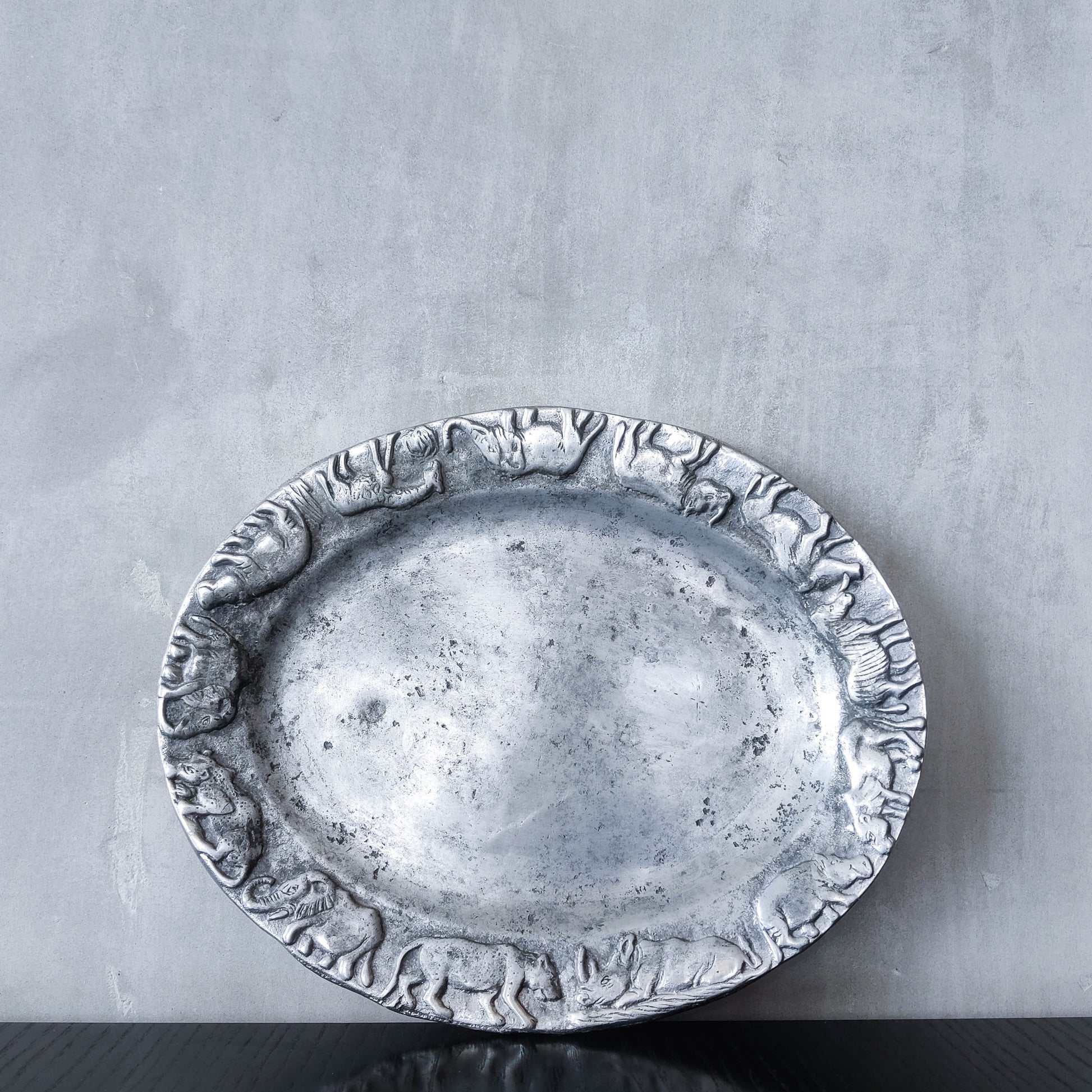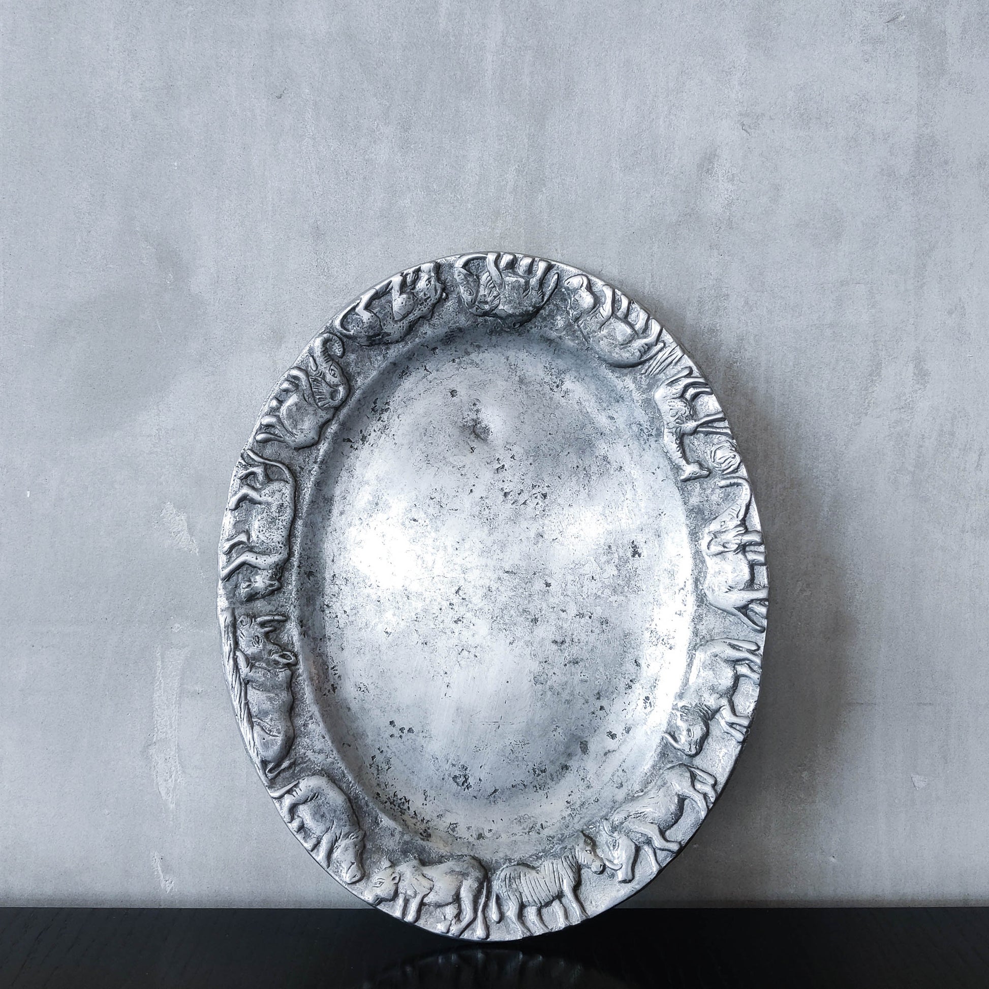 Sculptural heavy hand cast aluminium oval platter display dish with African animal motifs. Thick and with slightly wobbly organic form. Really rather worn and priced accordingly. Still a lovely piece for a still life/prop etc. Please see photos and condition description.
