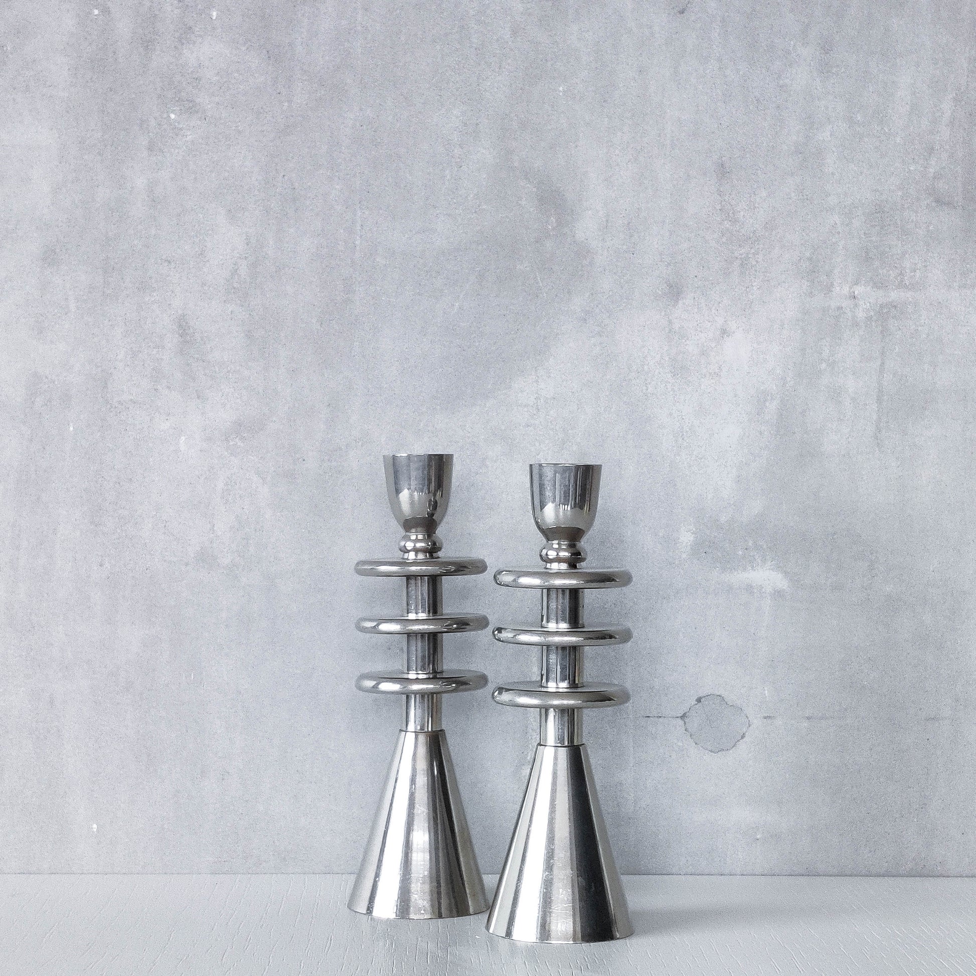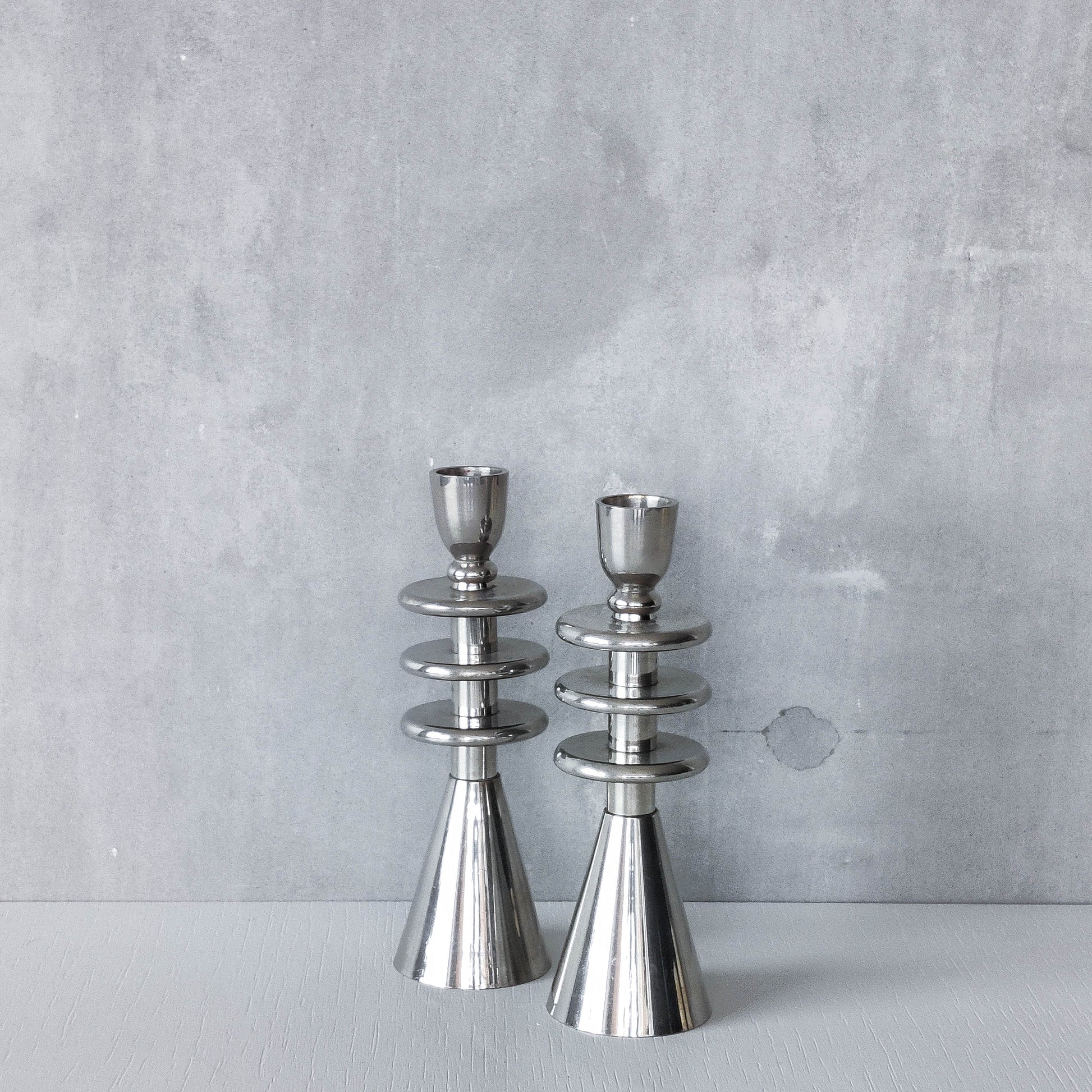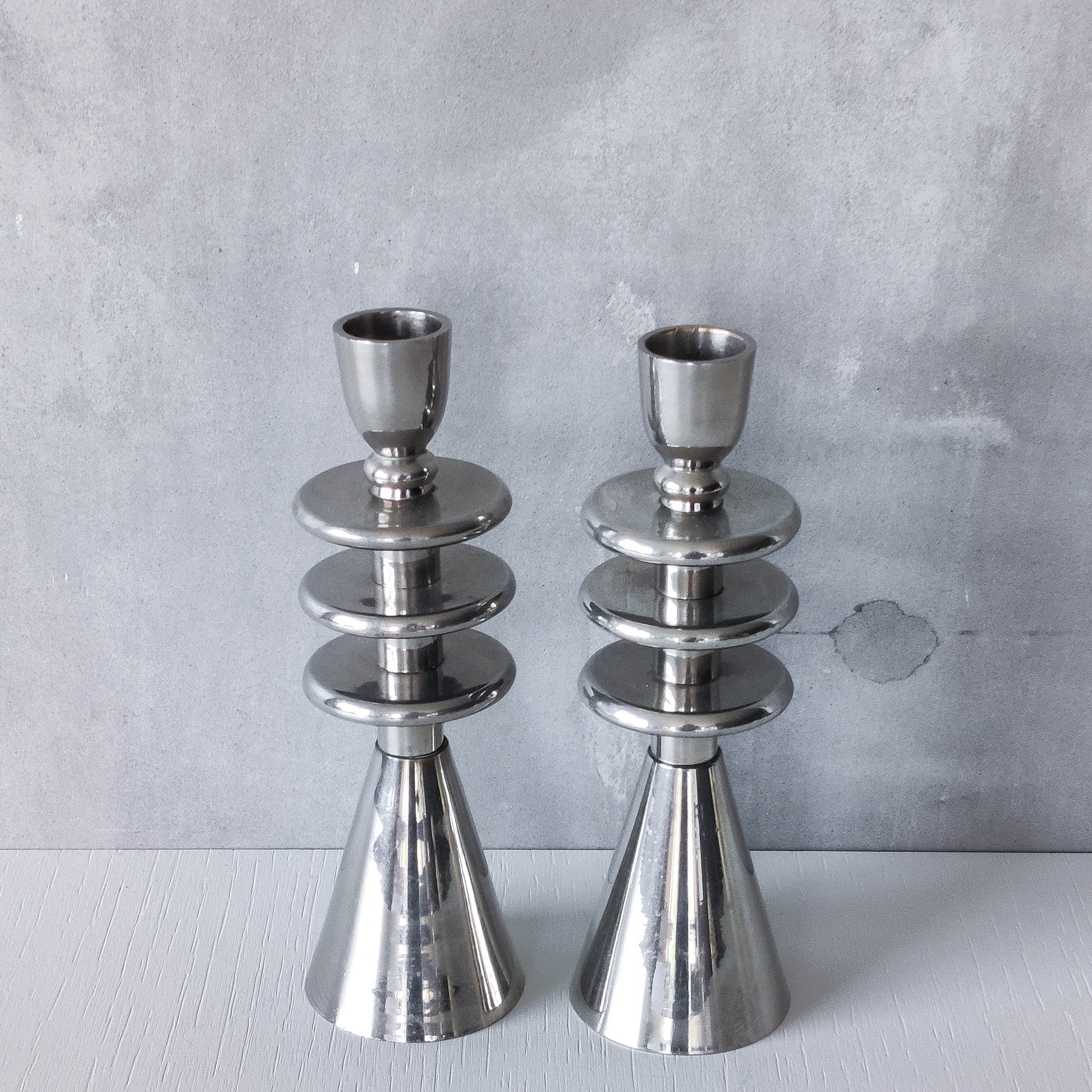 Pair of tiered geometric modernist form sculptural candlesticks. Appear to be chrome but could be polished aluminium (hollow cast and formed of connected pieces). To fit dinner candles (sorry candles not included). Please see photos and condition description.