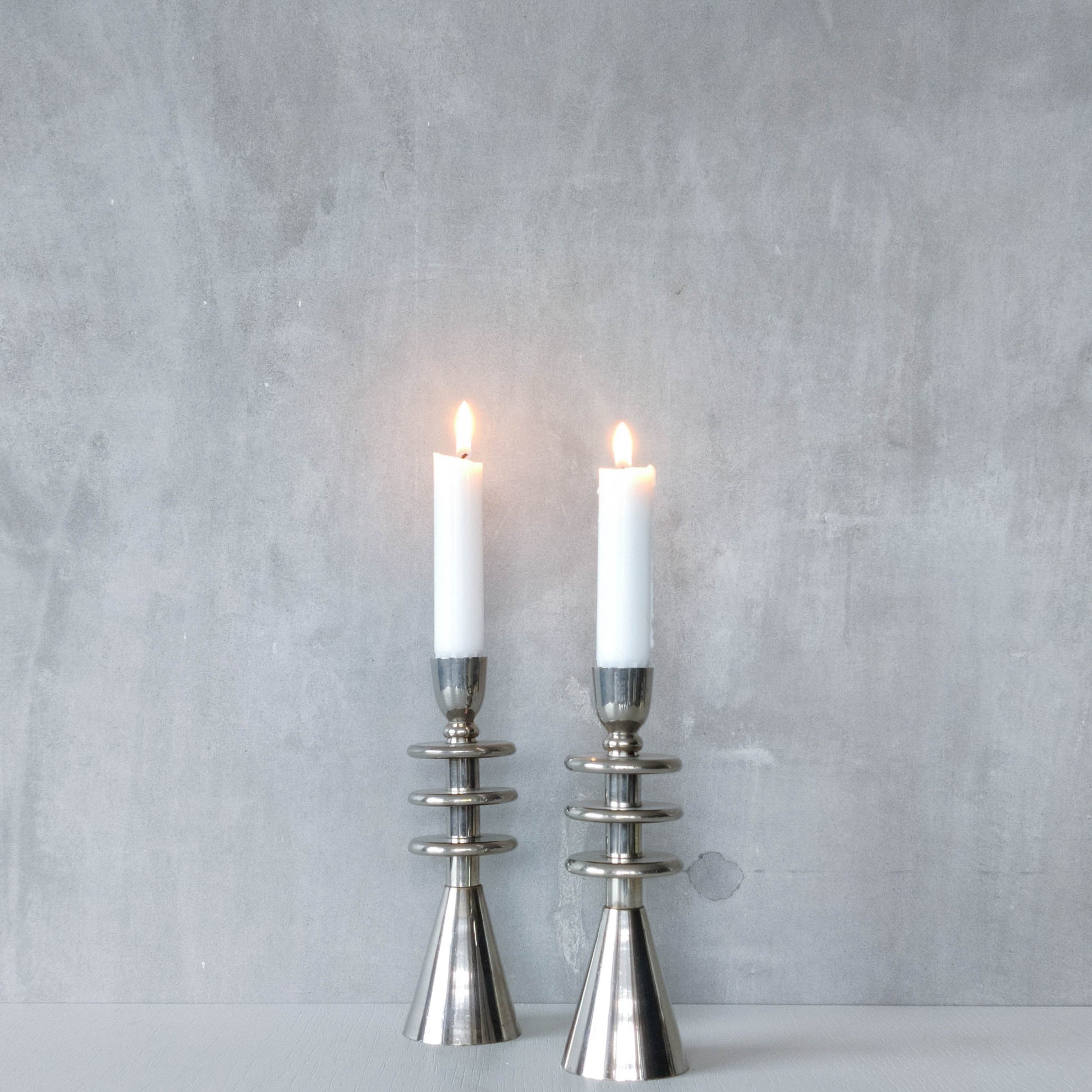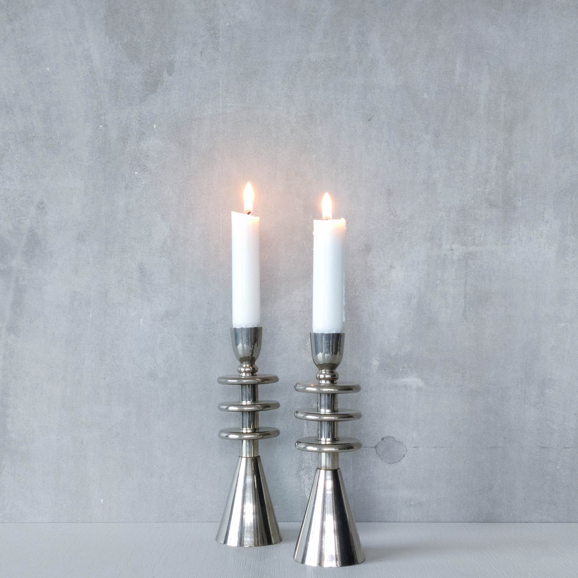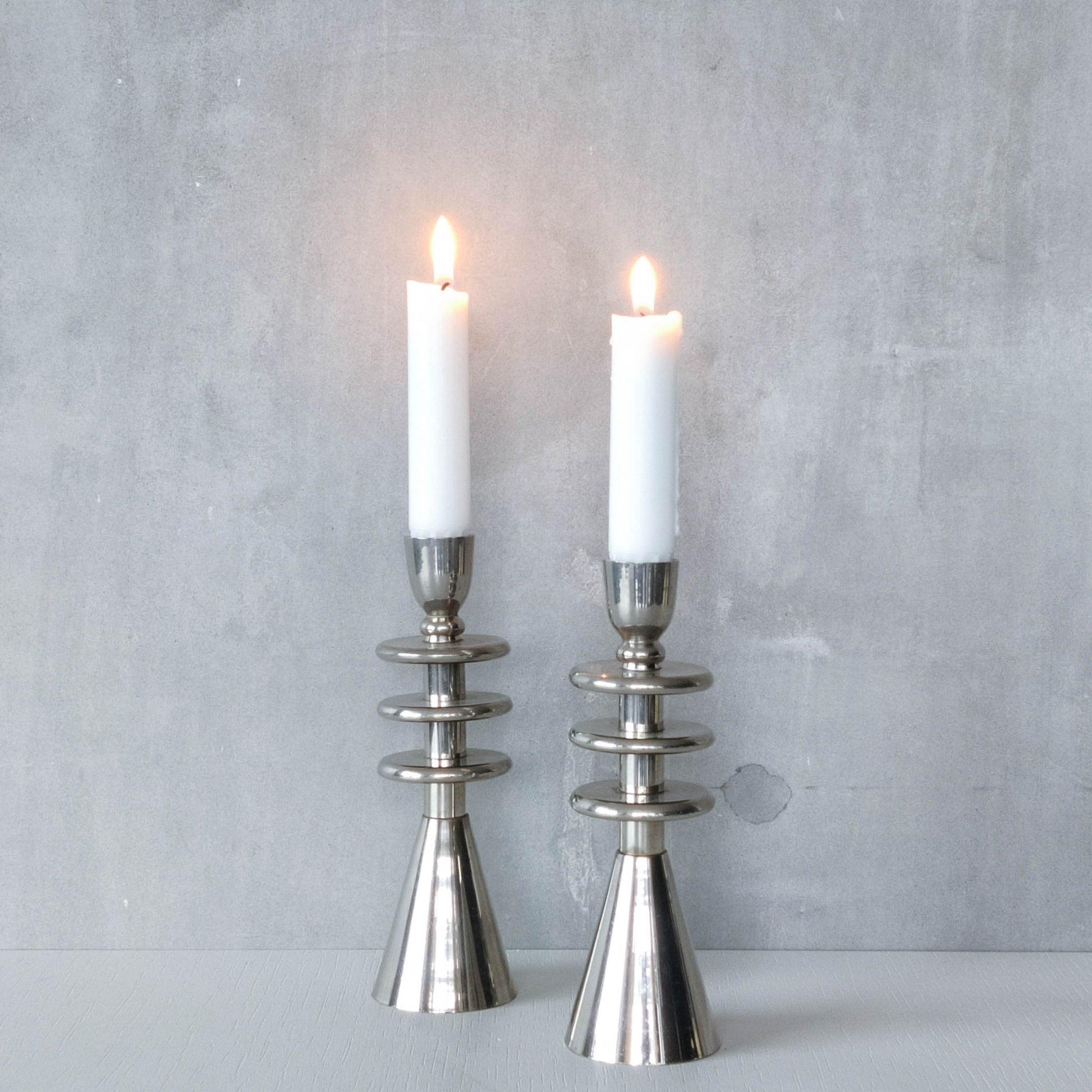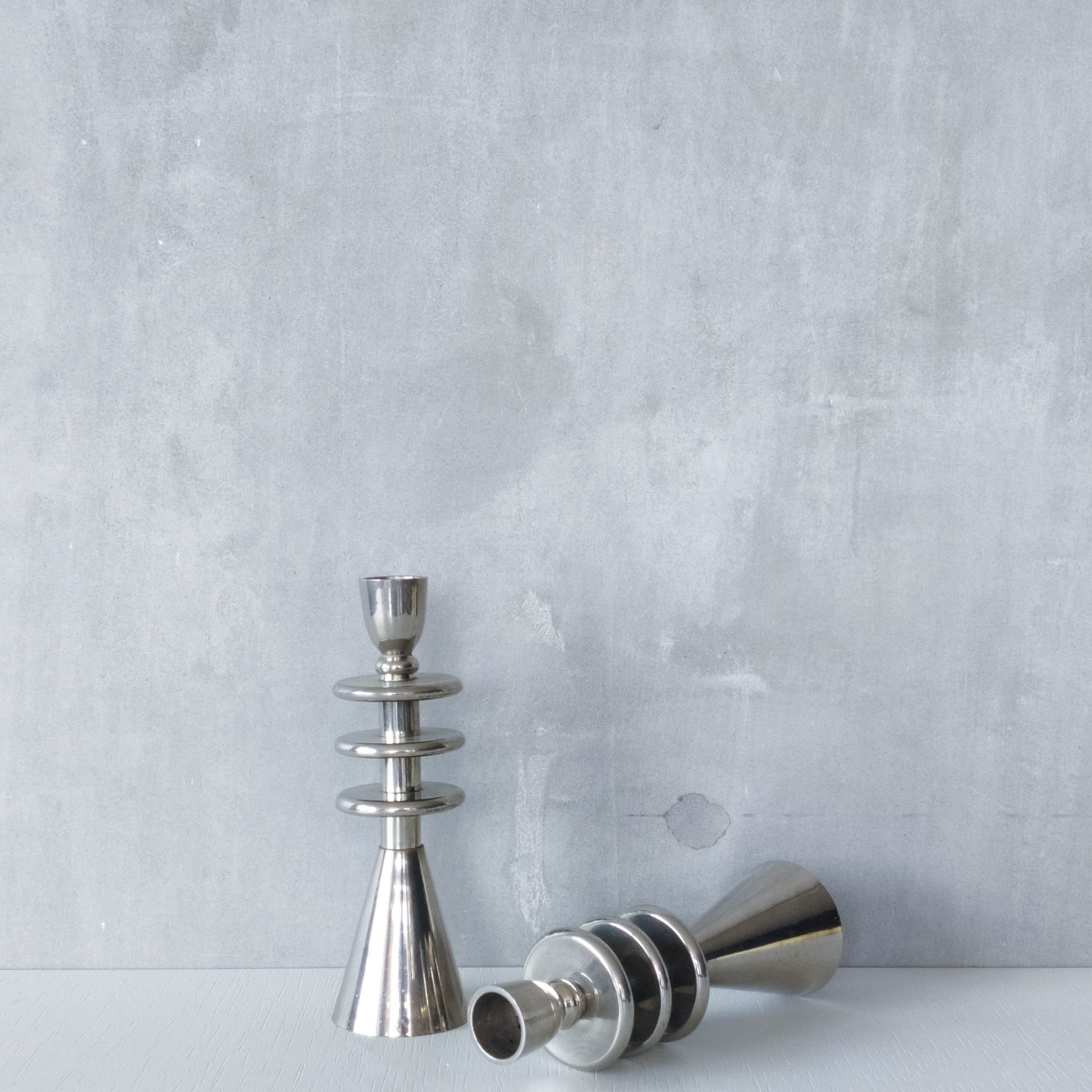 Pair of tiered geometric modernist form sculptural candlesticks. Appear to be chrome but could be polished aluminium (hollow cast and formed of connected pieces). To fit dinner candles (sorry candles not included). Please see photos and condition description.