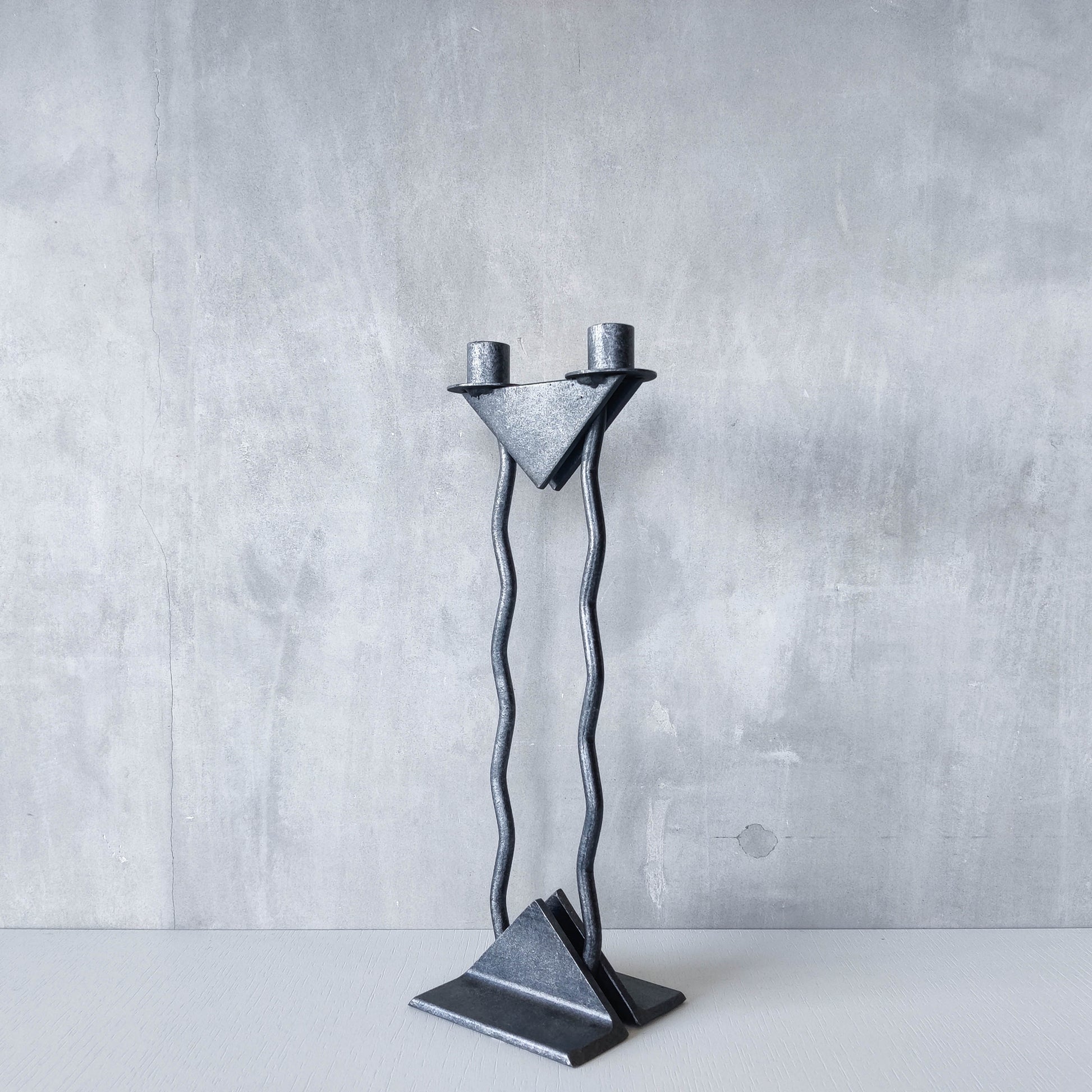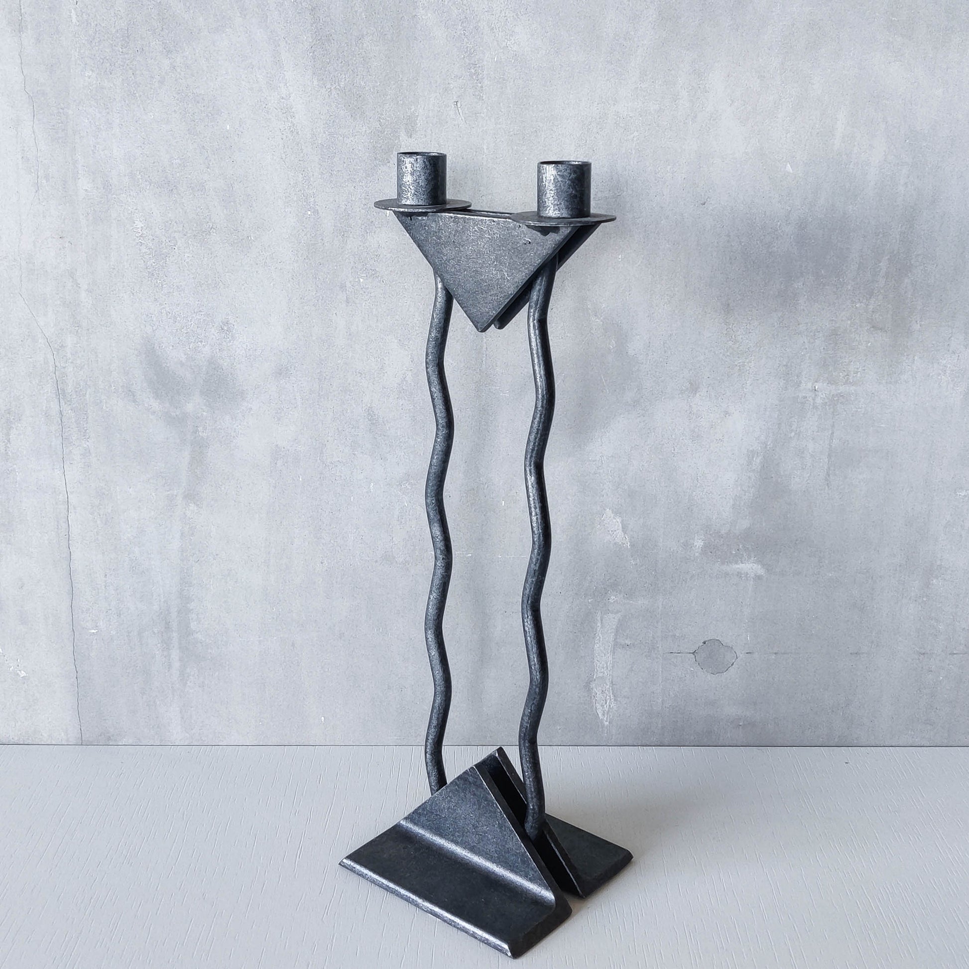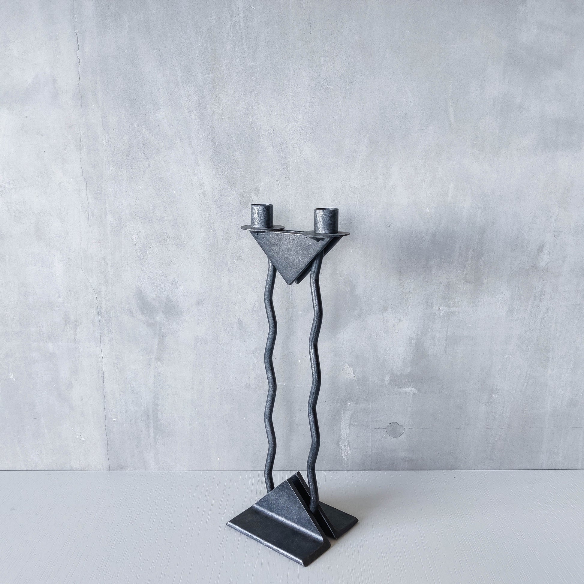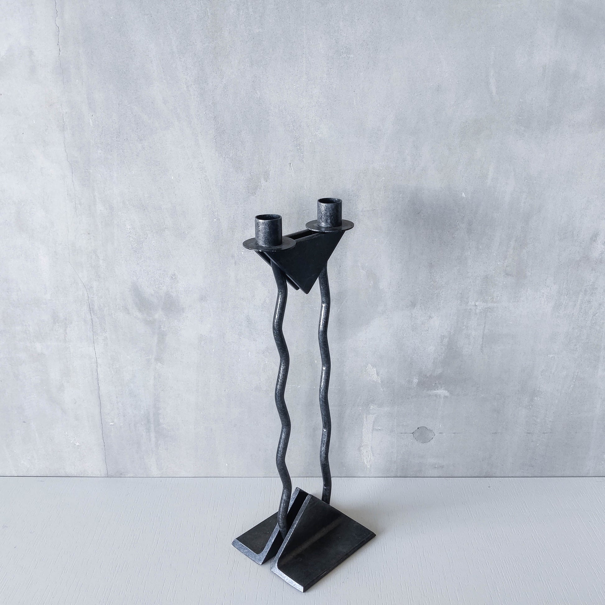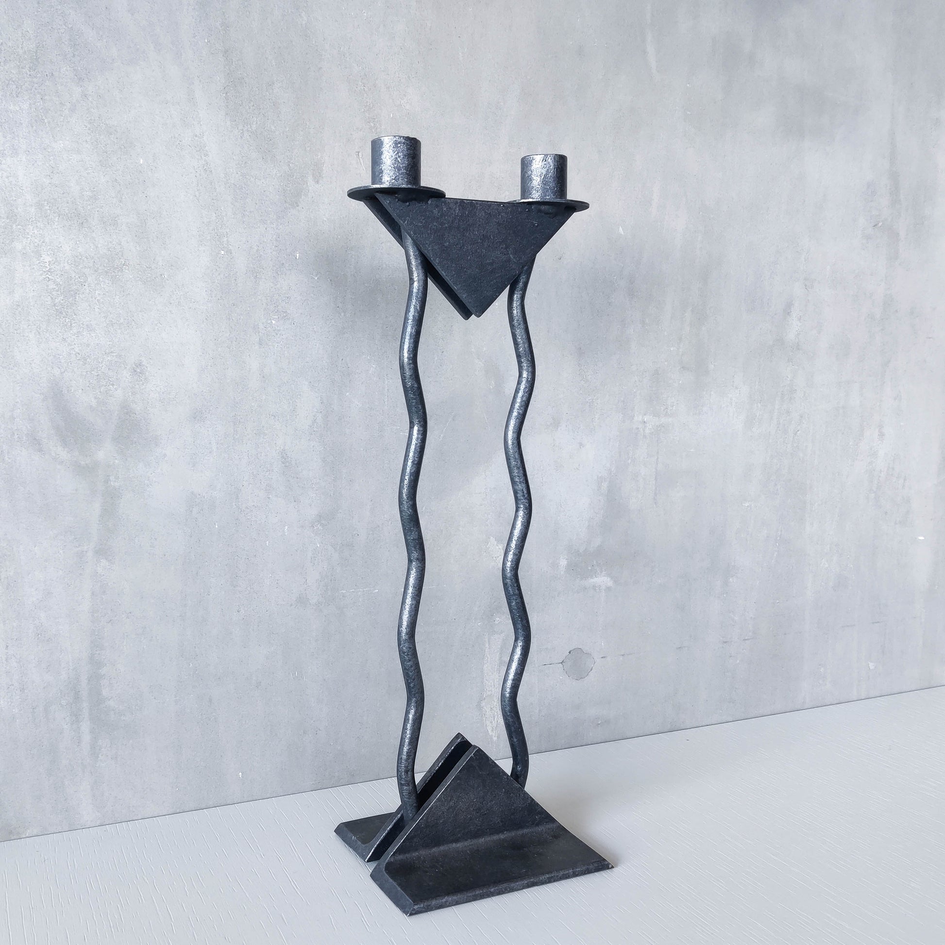 1980s Alfrank postmodern style welded steel sculptural candle holder. Great shape and scale, lovely detailing. Scumbled metallic grey finish. Very well made, heavy and robust. Holds 2 x dinner candles (sorry not included). Please see photos and condition description.