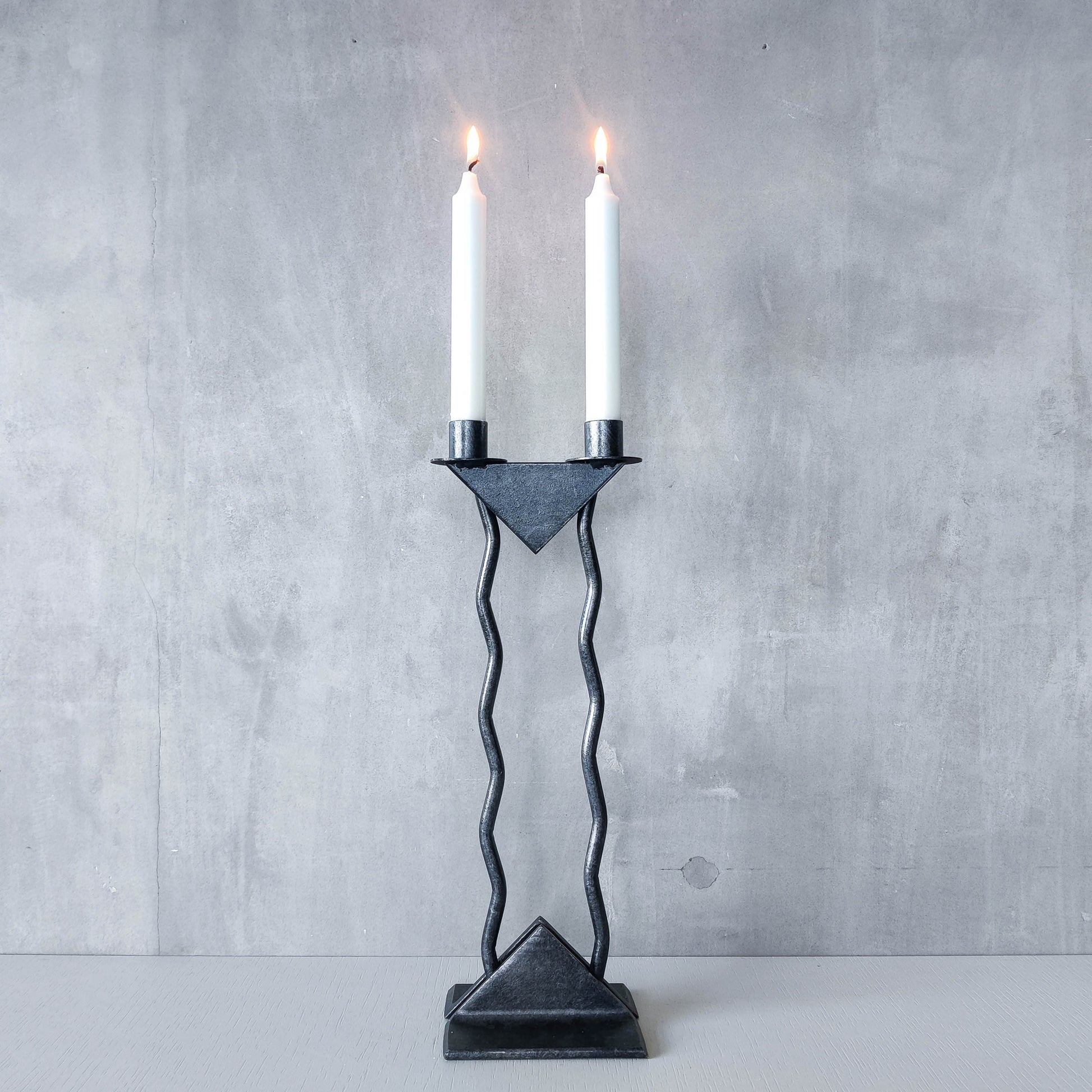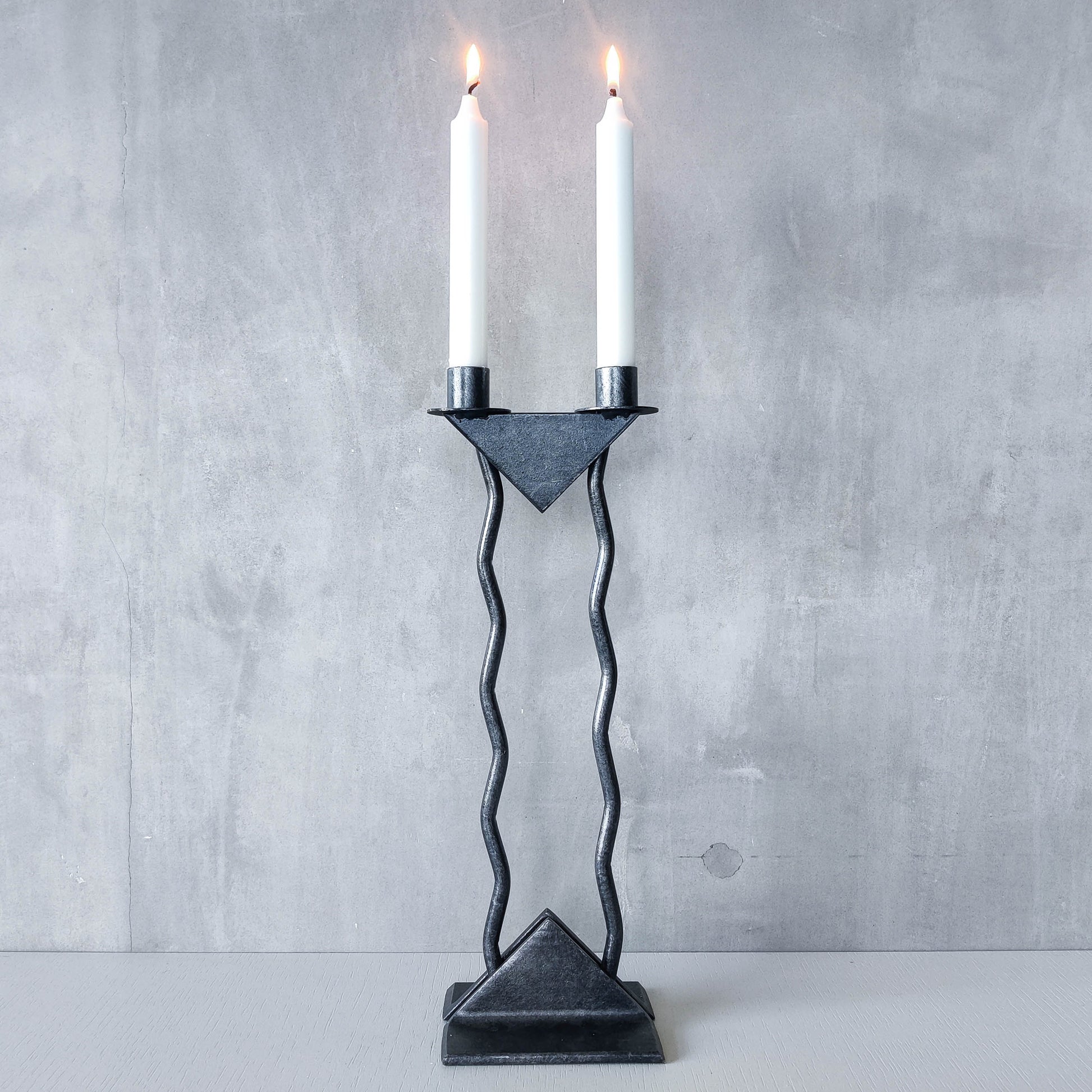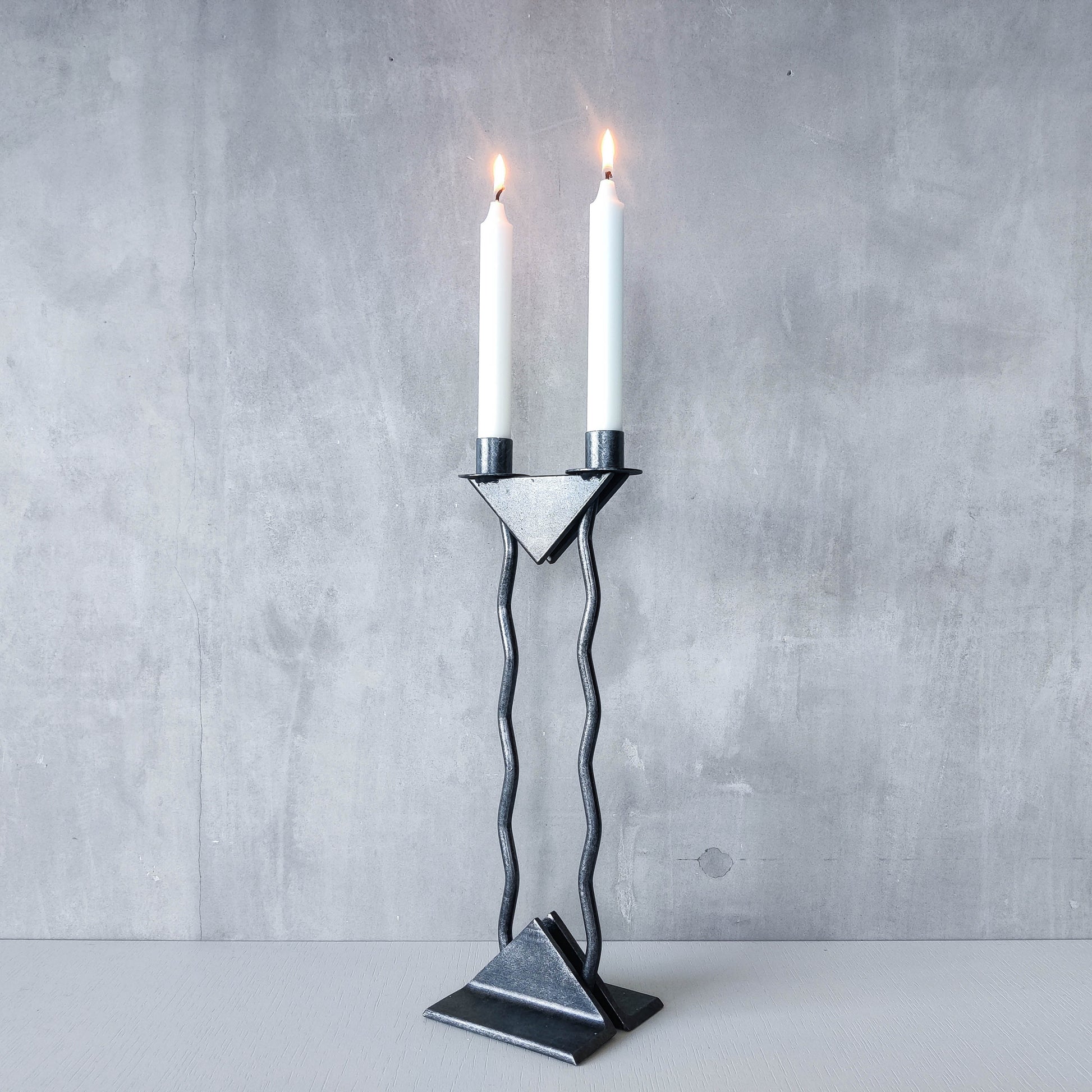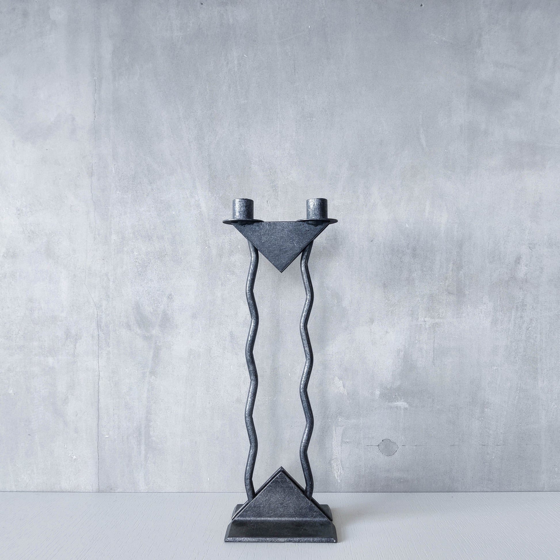 1980s Alfrank postmodern style welded steel sculptural candle holder. Great shape and scale, lovely detailing. Scumbled metallic grey finish. Very well made, heavy and robust. Holds 2 x dinner candles (sorry not included). Please see photos and condition description.