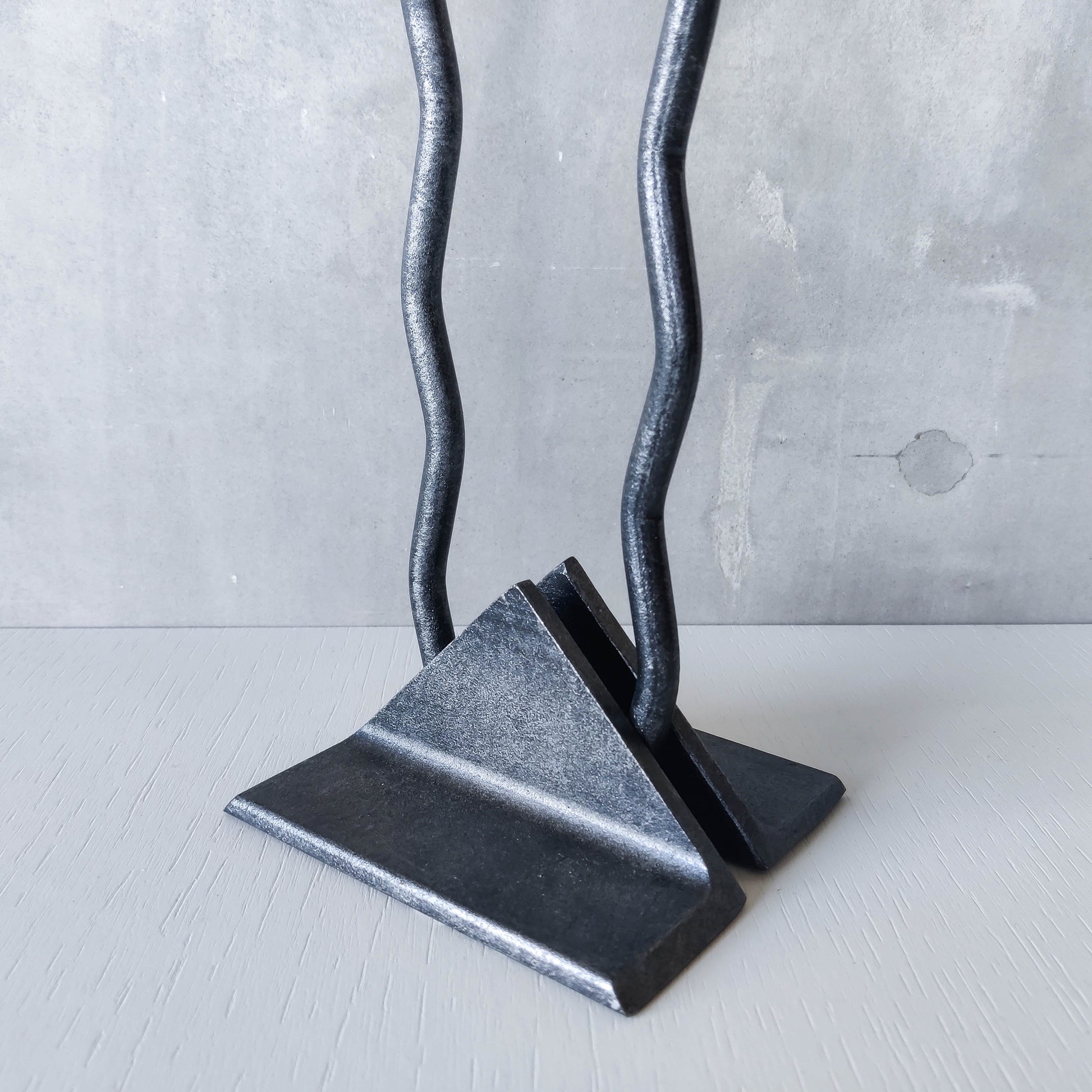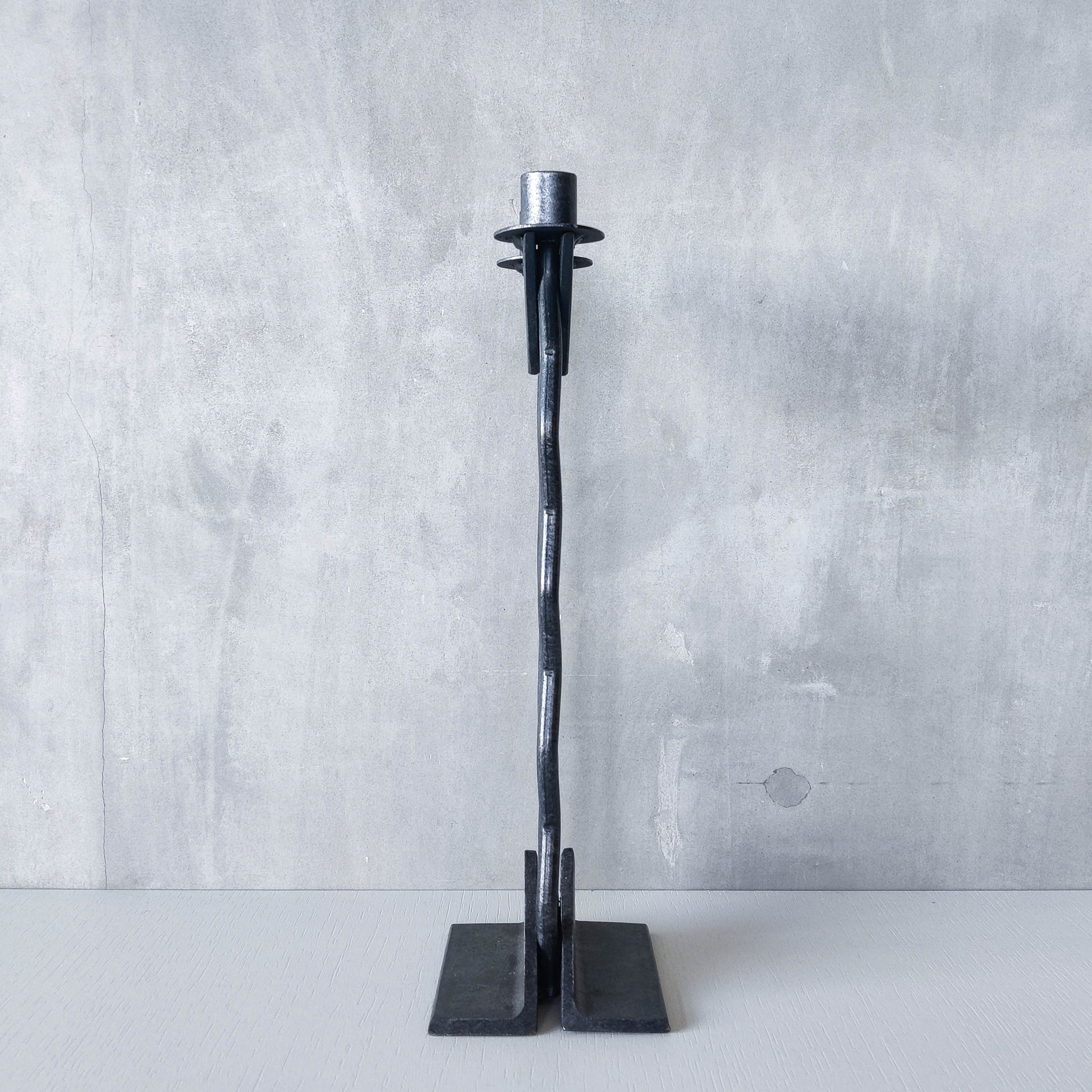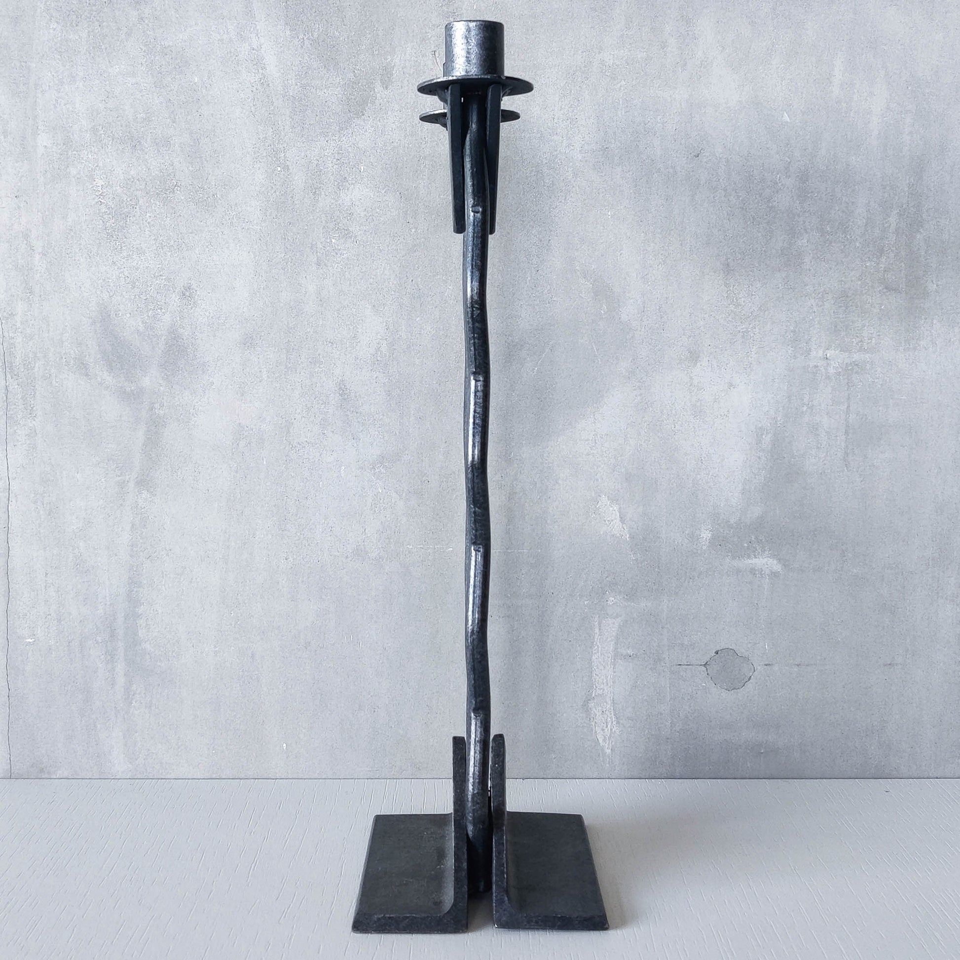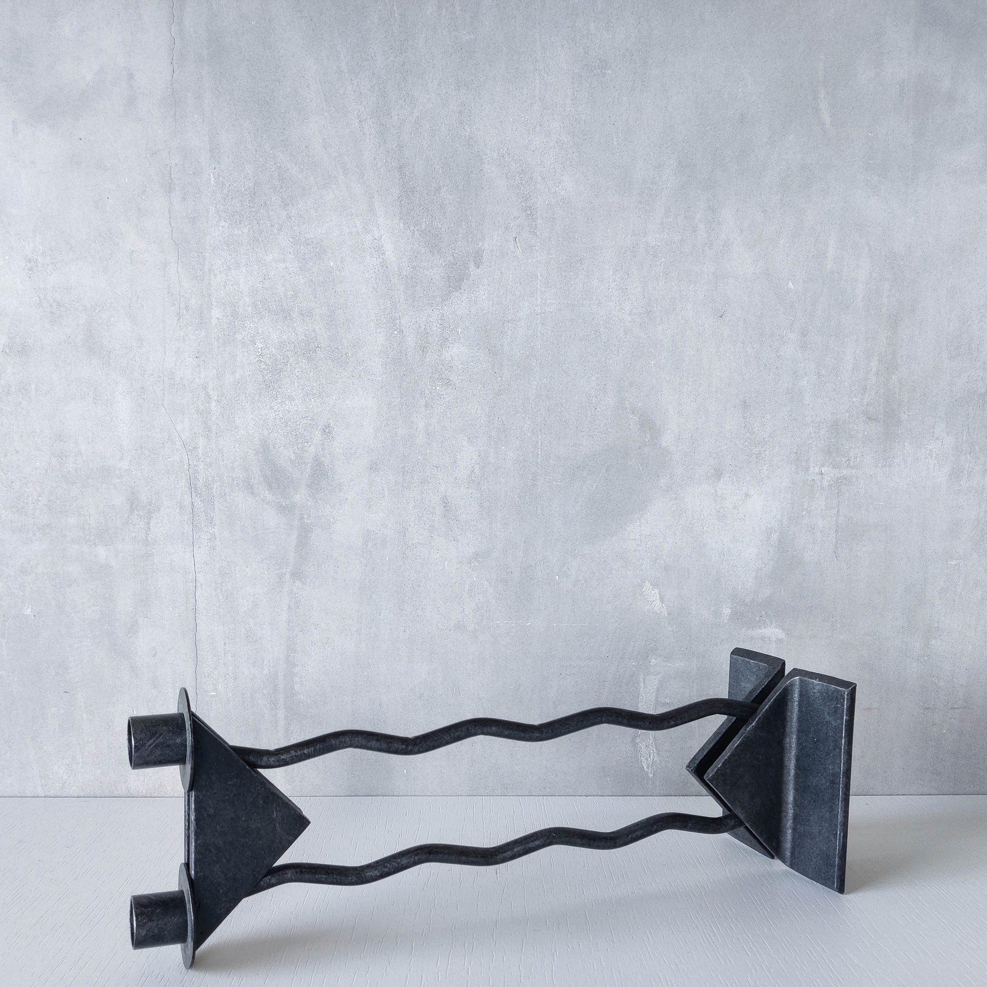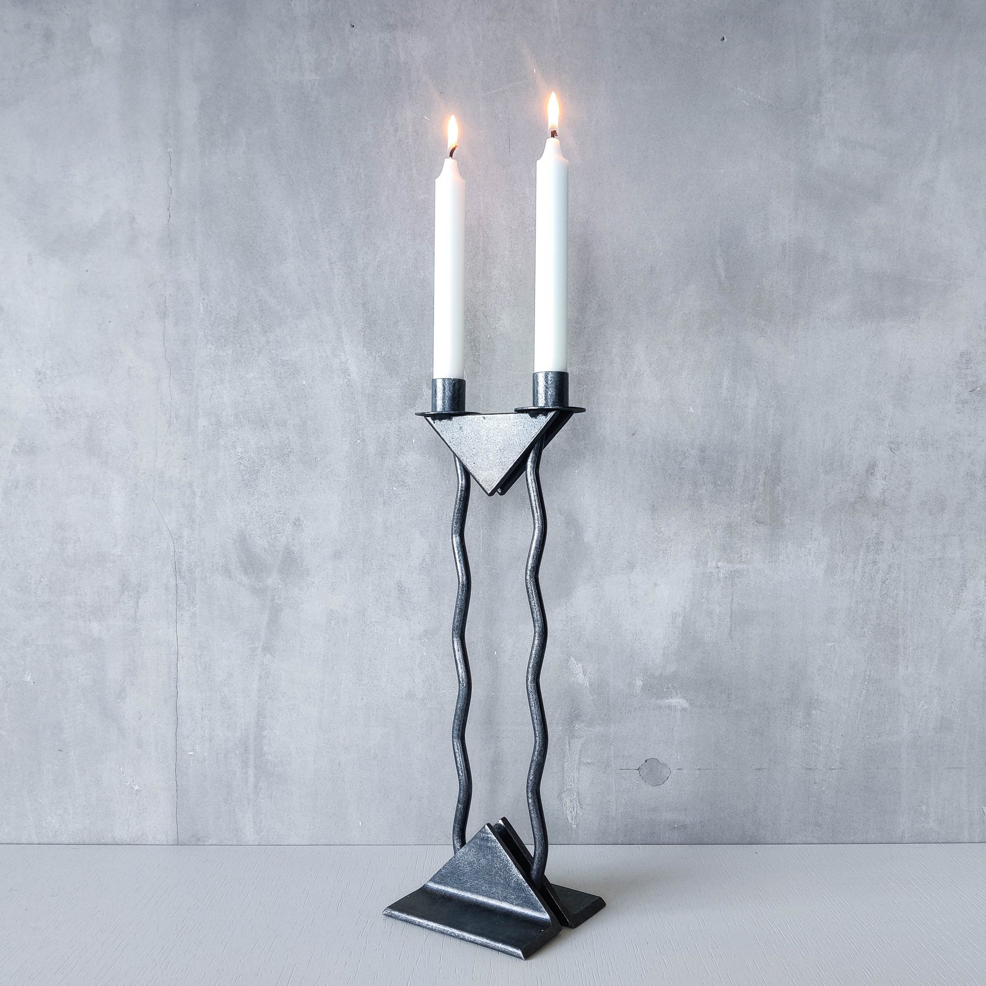 1980s Alfrank postmodern style welded steel sculptural candle holder. Great shape and scale, lovely detailing. Scumbled metallic grey finish. Very well made, heavy and robust. Holds 2 x dinner candles (sorry not included). Please see photos and condition description.
