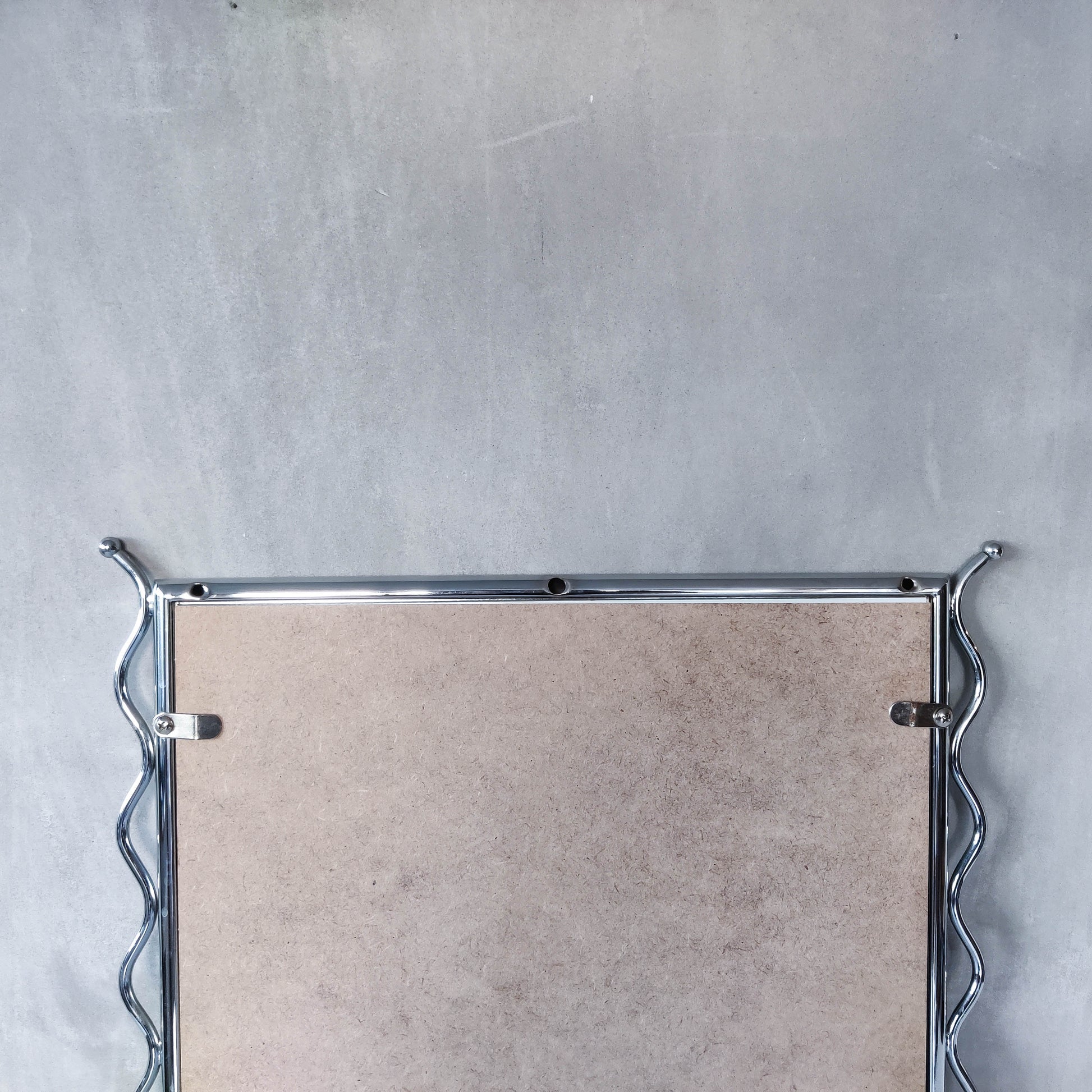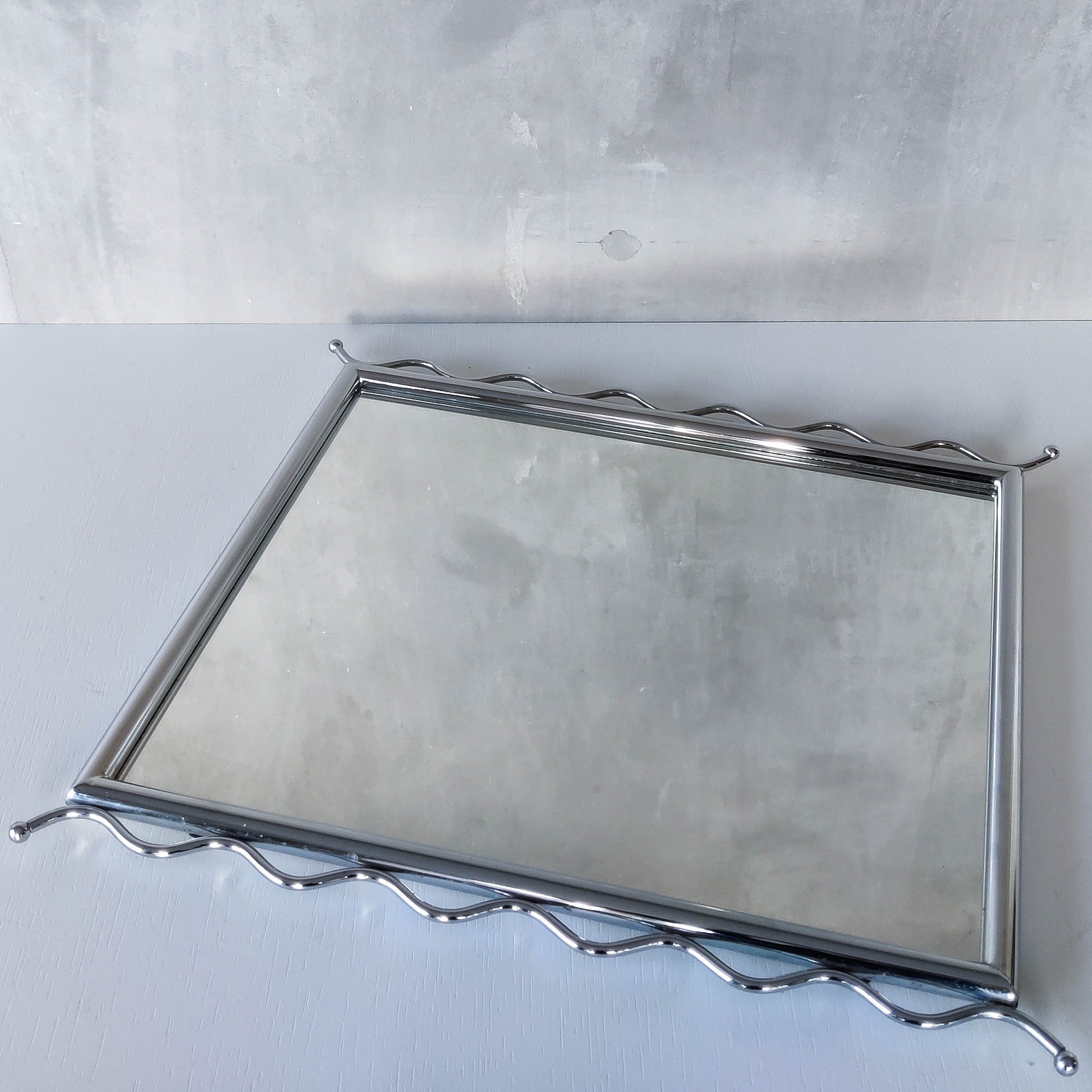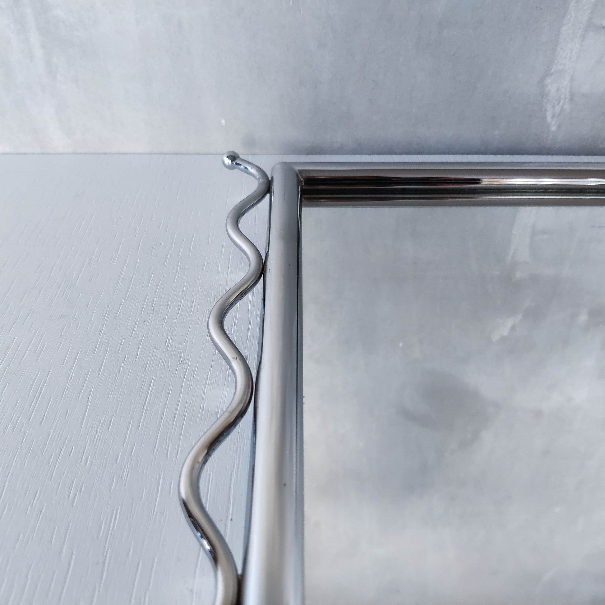 Charming 1990s postmodern style mirror in tubular steel frame with chrome wavy edge/ball finial detail. Weighs around 2kg. Designed to be hung vertically, with holes for screws/hooks. Please see photos and condition description.