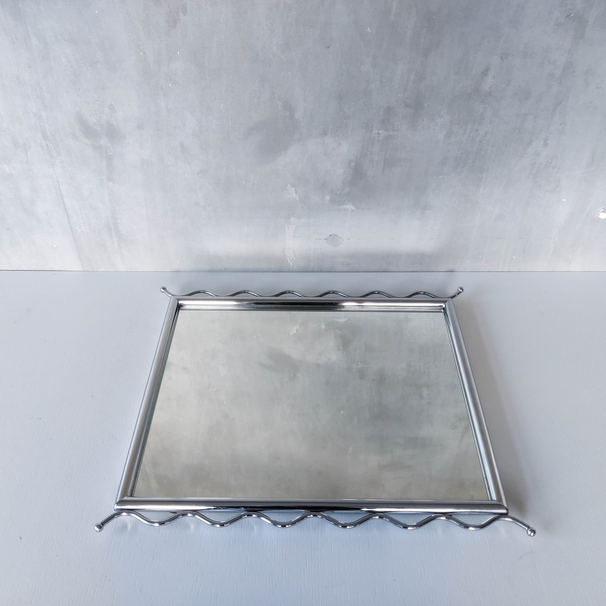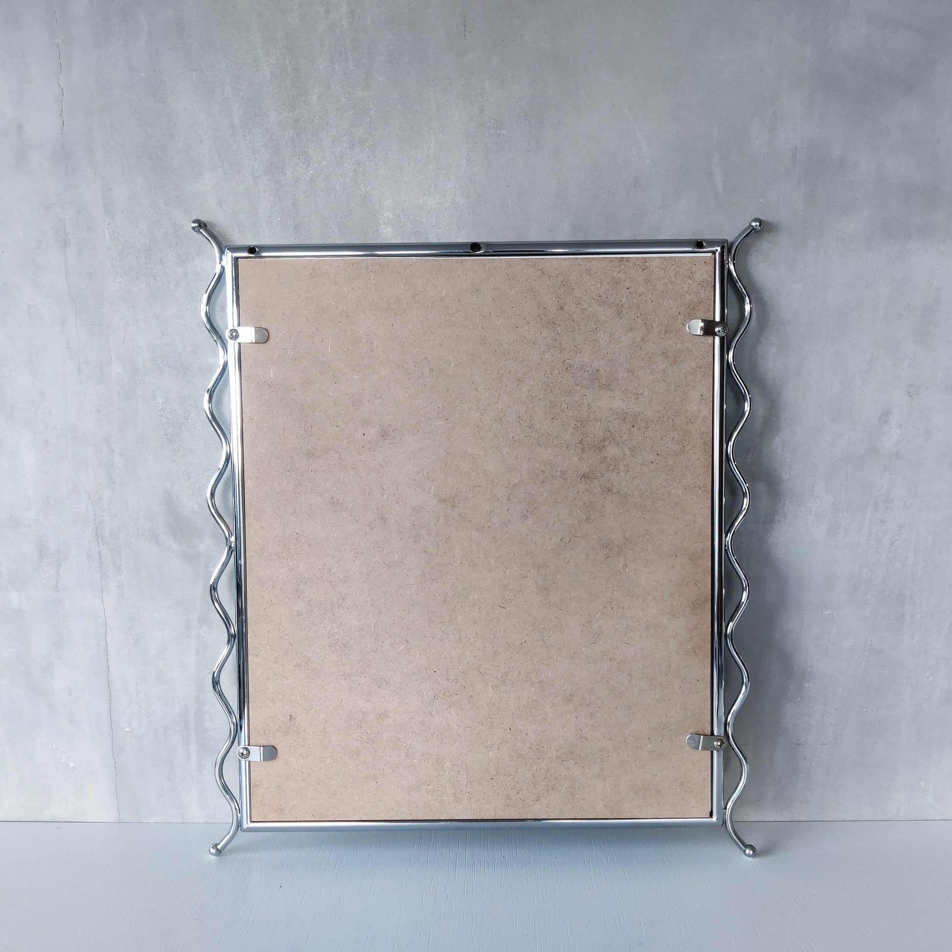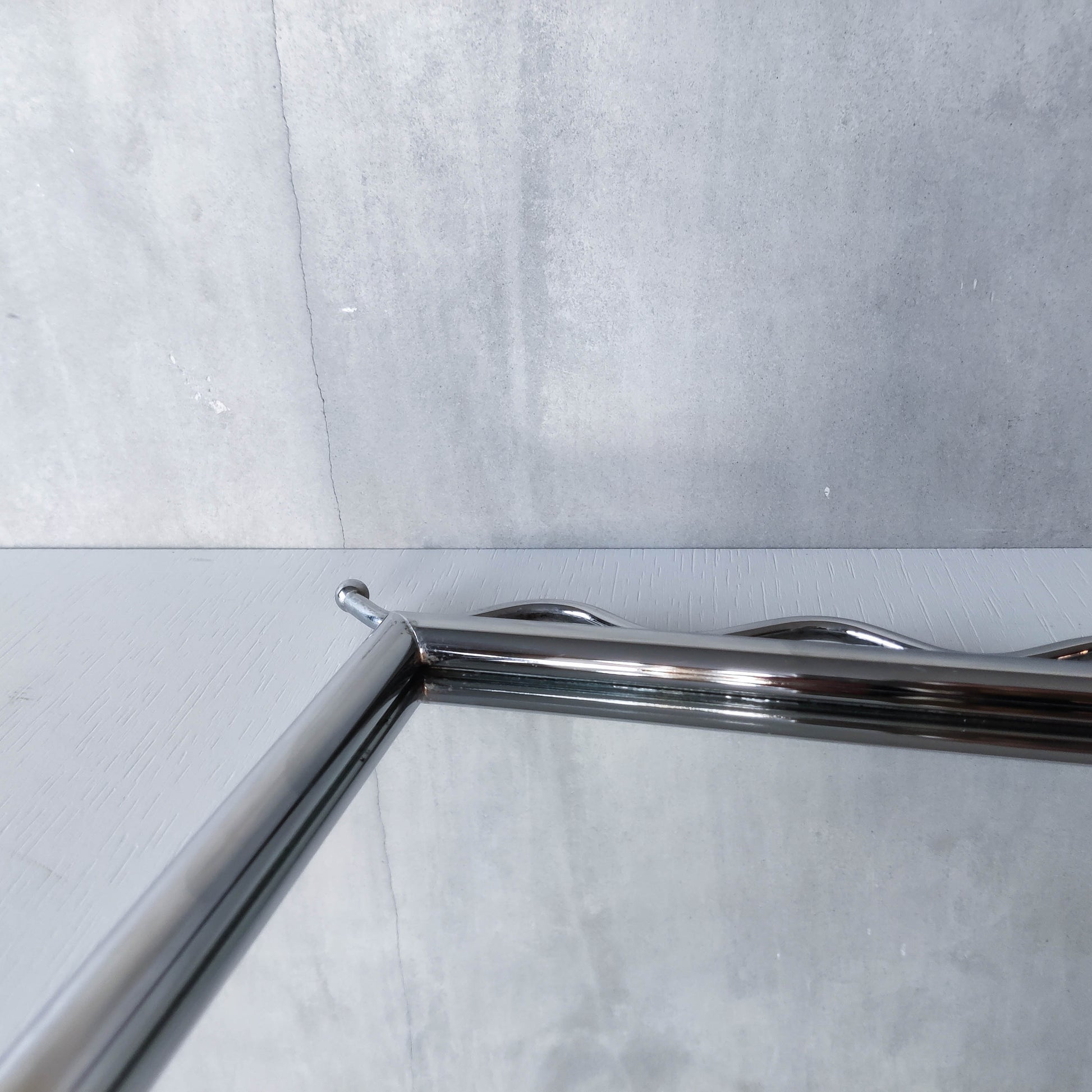 Charming 1990s postmodern style mirror in tubular steel frame with chrome wavy edge/ball finial detail. Weighs around 2kg. Designed to be hung vertically, with holes for screws/hooks. Please see photos and condition description.